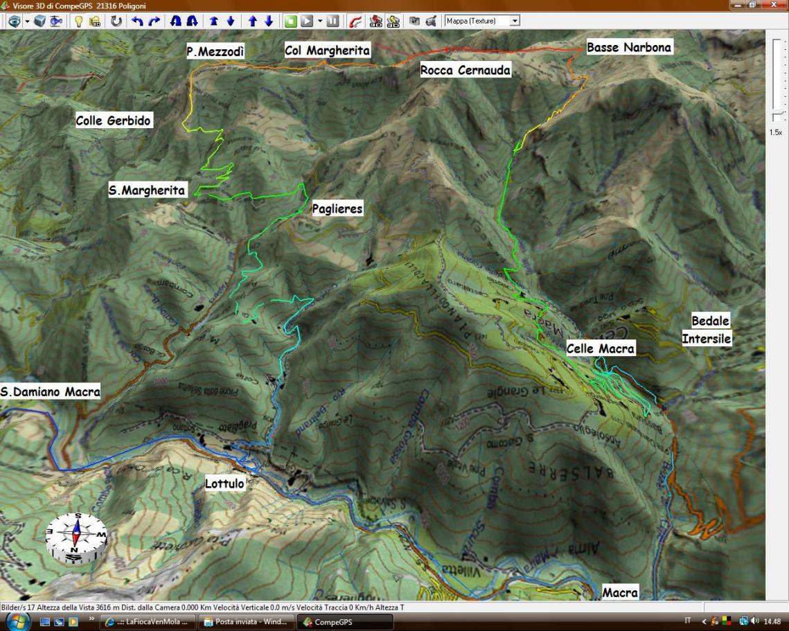 Bellissimo traverso discendente, piccole risalite ed arrivate ad un’altra grangia, a quota 1417m, giusto sopra Assara (o Assarti), dove inizia la sterrata; continuate, vi é una risalita di 50m di dislivello che supera il colle di Giada e scende ad una grangia appena sopra la chiesetta di S.Margherita.