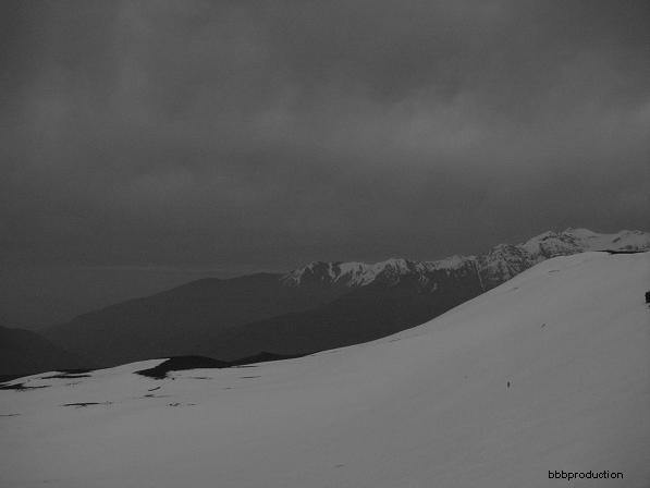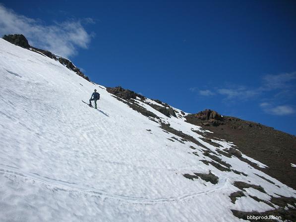 Dalla q.3200 ripercorrere per un tratto la cresta quindi scegliere uno dei canali esposti a S, spesso difesi da discrete cornici che portano nella conca sottostante verso dx sotto la direttrice della cima del Cerro Bayo, dove si stringe risalire in maniera direttissima fino in cima al Bayo. Seguire la sua cresta verso dx stando sopra al pianoro percorso all’inizio fino dove si puo’ per poi percorrere in picchiata le ultime ripide lingue direttamente su Lagunillas.