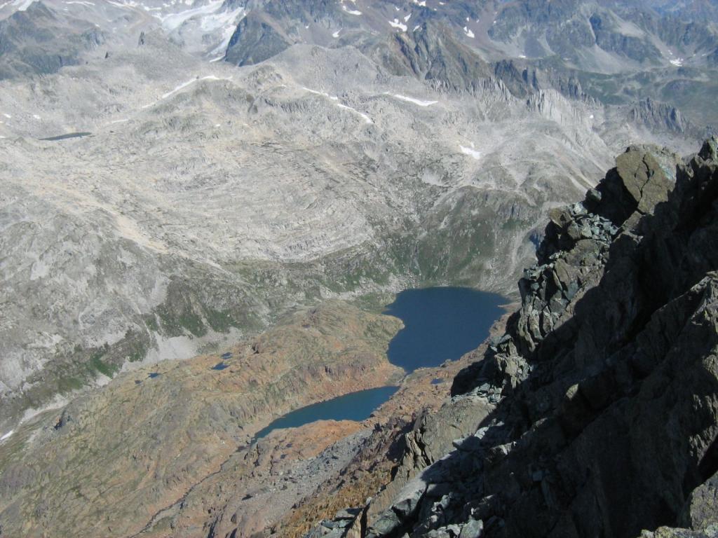 Alzarsi ora spostandosi gradualmente a sinistra (nevai) per raggiungere il colatoio al centro della parete da superare inizialmente passando sulla sua sx idr. poi attraversando a sinistra per portarsi sulla dorsale (giavina franosa) che fuoriesce nell’alta conca del Cervandone. ore 3