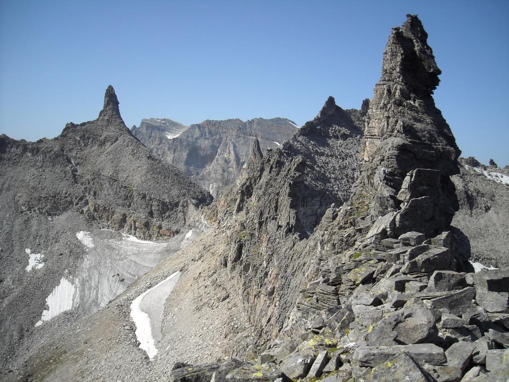 Da qui in avanti si continua lungo la cresta con percorso non obbligato (passaggi Max II) fino ad arrivare alla vetta. Ore 5-5.30.