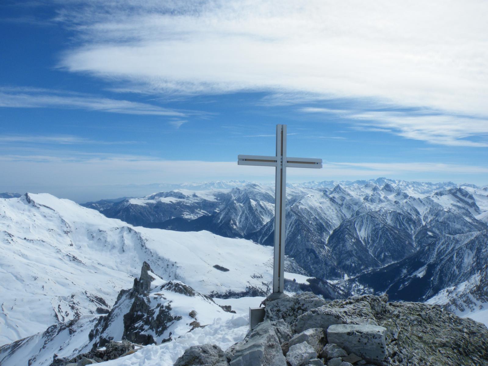 Oggi la neve ha tenuto abbastanza nonostante le temperature alte, la discesa e stata sempre divertente e sufficientemente veloce. Una decina di skialp in vetta con tempo bello e caldo.