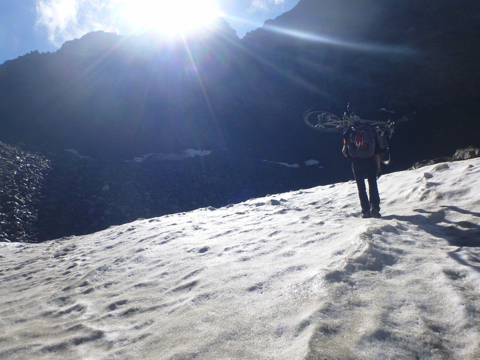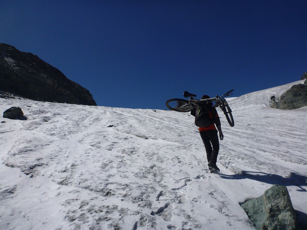 In portage da quota 2150 m circa, vinciamo la barriera naturale che divide il ghiacciaio di Arolla superiore da quello inferiore con qualche metro di ferrata, ed entriamo nel bacino glaciale detritico scendendo qualche decina di metri: pedaliamo lungo la fiumana con i nasi verso l’elegante Mont Brulè, cercando il Col Collon. Quando il ghiacciaio “ emerge” dai detriti, saliamo il più possibile lungo la morena laterale dx orografica; poi, una lunga lingua di sfasciume trasportata dal ghiacciaio, ci fa da ponte per arrivare a quota 2800 m. slm circa, laddove la via ripiana. Ciò ci permette di traversare e raggiungere la morena laterale sx orografica. Scavalchiamo la cresta morenica e un ben battuto sentiero (alto palo di alluminio ne segna la presenza) ci fa risalire in portage l’oramai roccioso letto glaciale della parte più alta del ghiacciaio ed agli ultimi suoi residui. Siamo al Col Collon 3082 m e rientriamo in Italia. Anche in questa occasione dobbiamo dare giusta importanza all’ambiente alpino attraversato, dotandoci delle opportune attrezzature per affrontarlo in tutta sicurezza! Nel nostro caso, viste le condizioni d’innevamento, non abbiamo indossato neanche i ramponi….