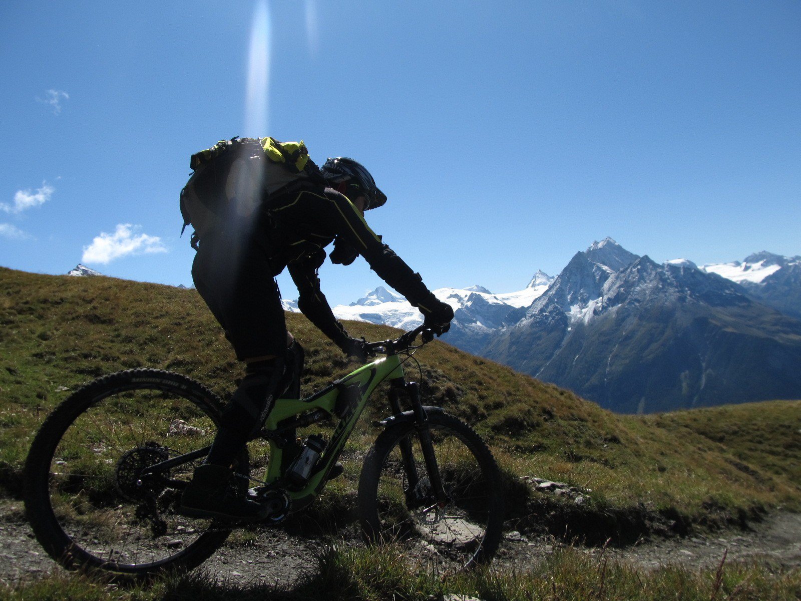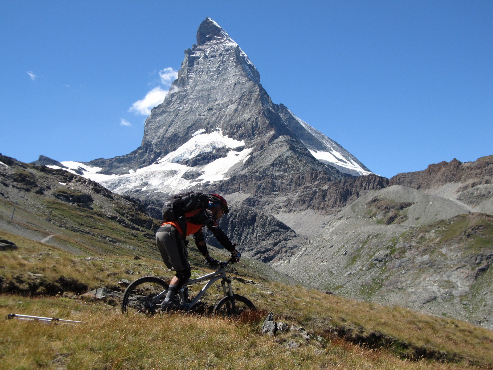 Arriviamo in fondo a poche centinaia di metri dalla stazione della funivia che sale da Zermatt: Trockener Steg 2939 m. Ripartiamo cercando la via migliore: subito di fianco all’apres ski c’è il segnavia con tabelle che, oltre ad indicare la via per Zermatt, sanciscono il cancelletto di partenza per il bike-paradise. Il sentiero è una summa antologica di tutte le condizioni che un AMer vorrebbe sempre provare sotto le proprie ruote…. seguite sempre le indicazioni per Zermatt e attenti al bivio nascosto dalle reti di protezione della pista che scenda da Furgg (la dovrete solo attraversare e scendere pochi metri, il segnavia con tabelle si trova sul versante del torrente; un ponte più sotto). Se tutto è andato come previsto, vi risveglierete nella caotica Zermatt.