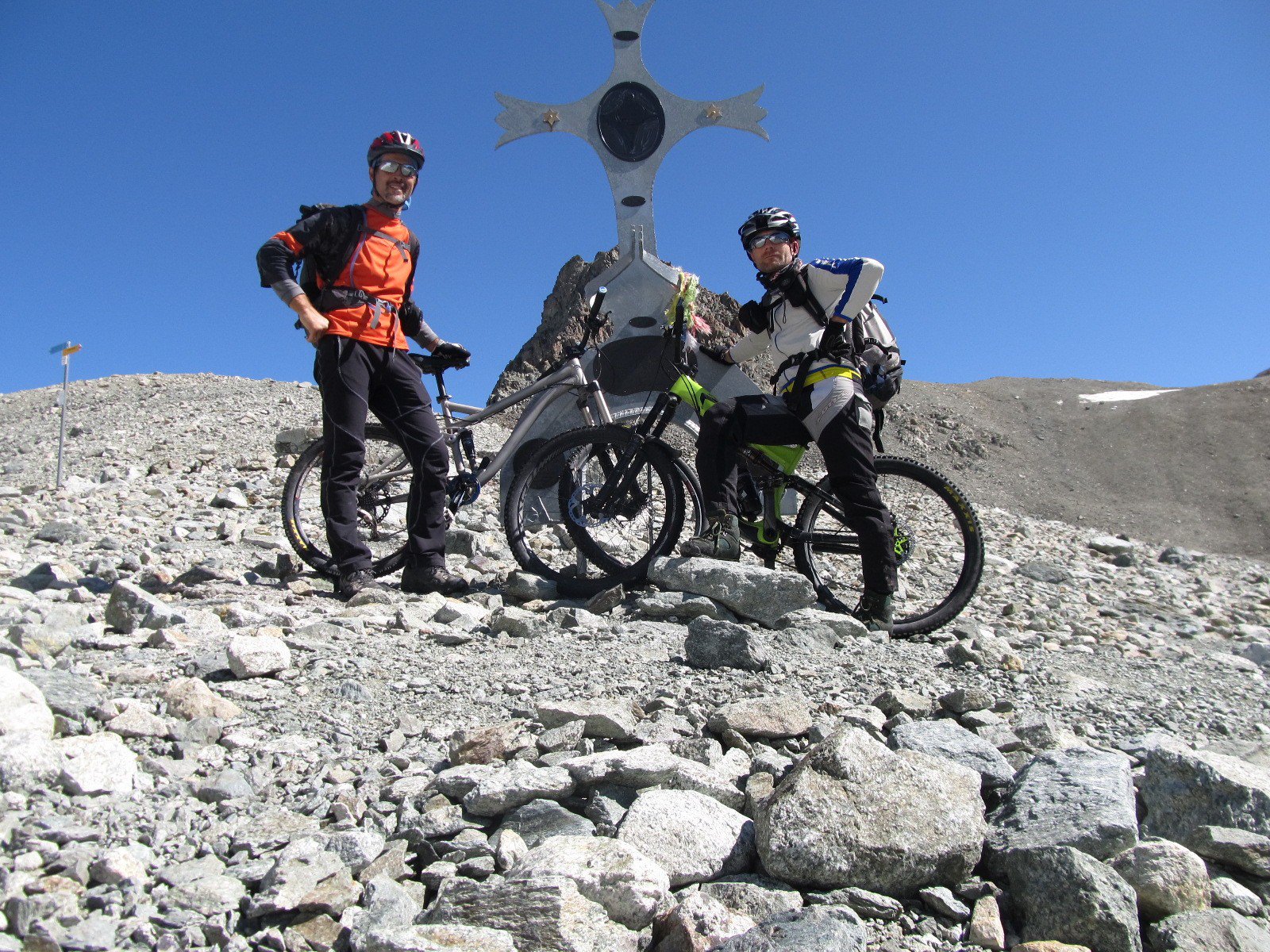 Riprendiamo la via crucis, non meno avara di pedalabilità rispetto a più sotto, finché non aggiriamo la Steitalgrat a quota 2450 m, immettendoci nella valle Augstbord: il sentiero ora ripiana su un mare di enormi rocce detritiche, ma ben disposte per la transumanza: poco ciclabili.