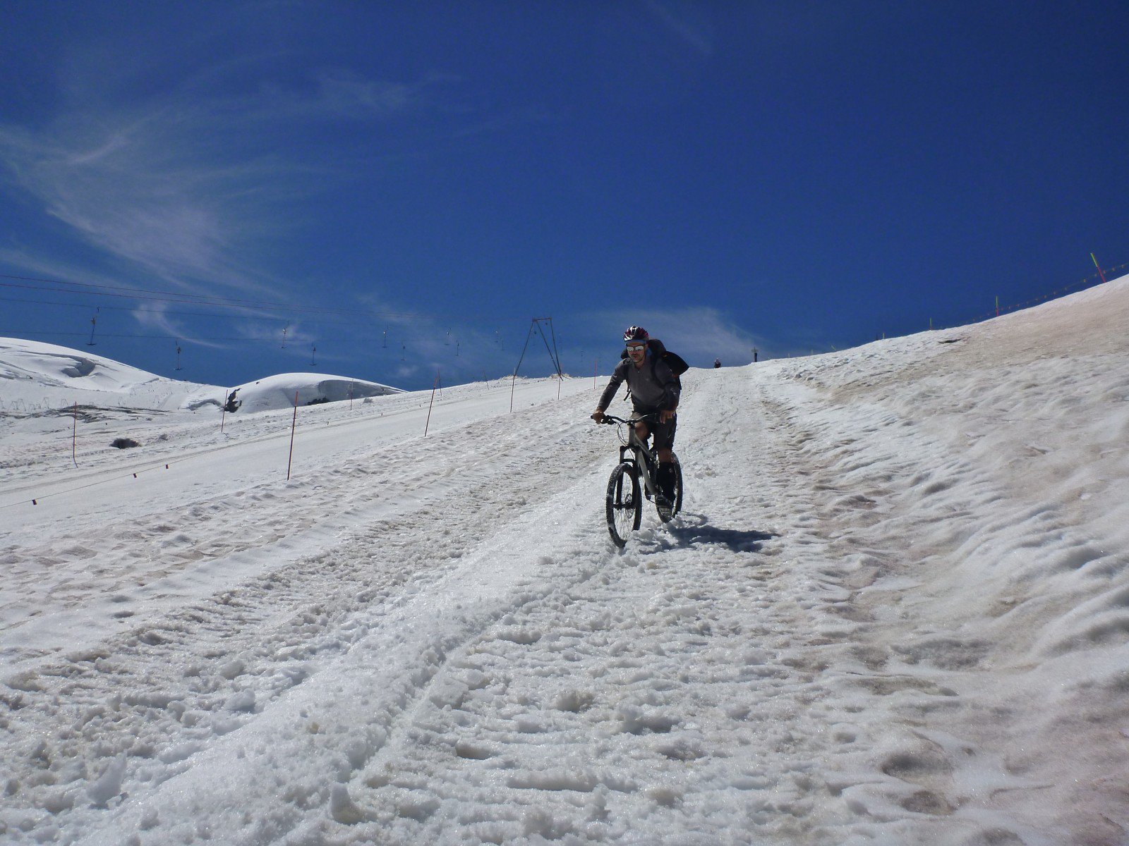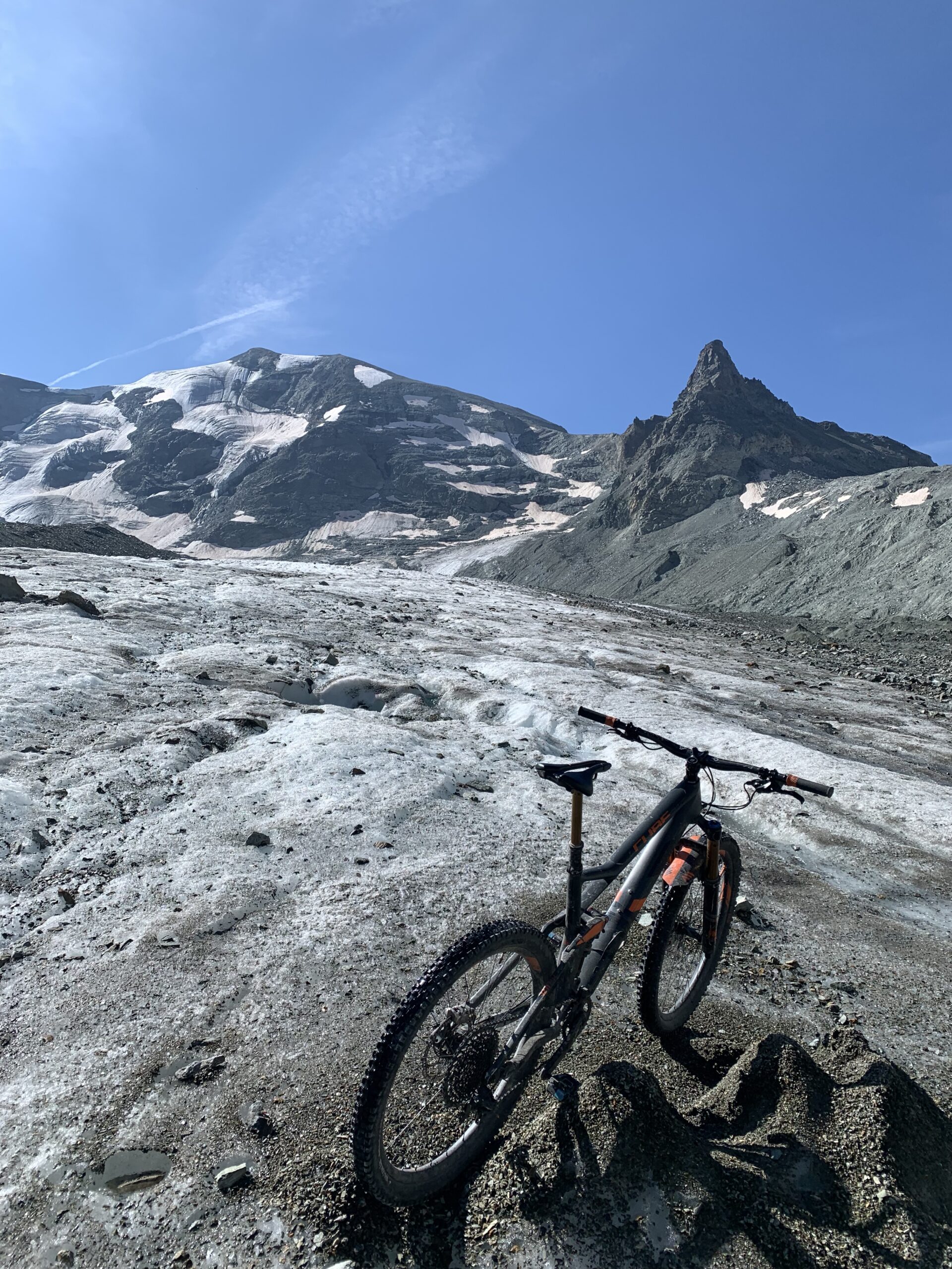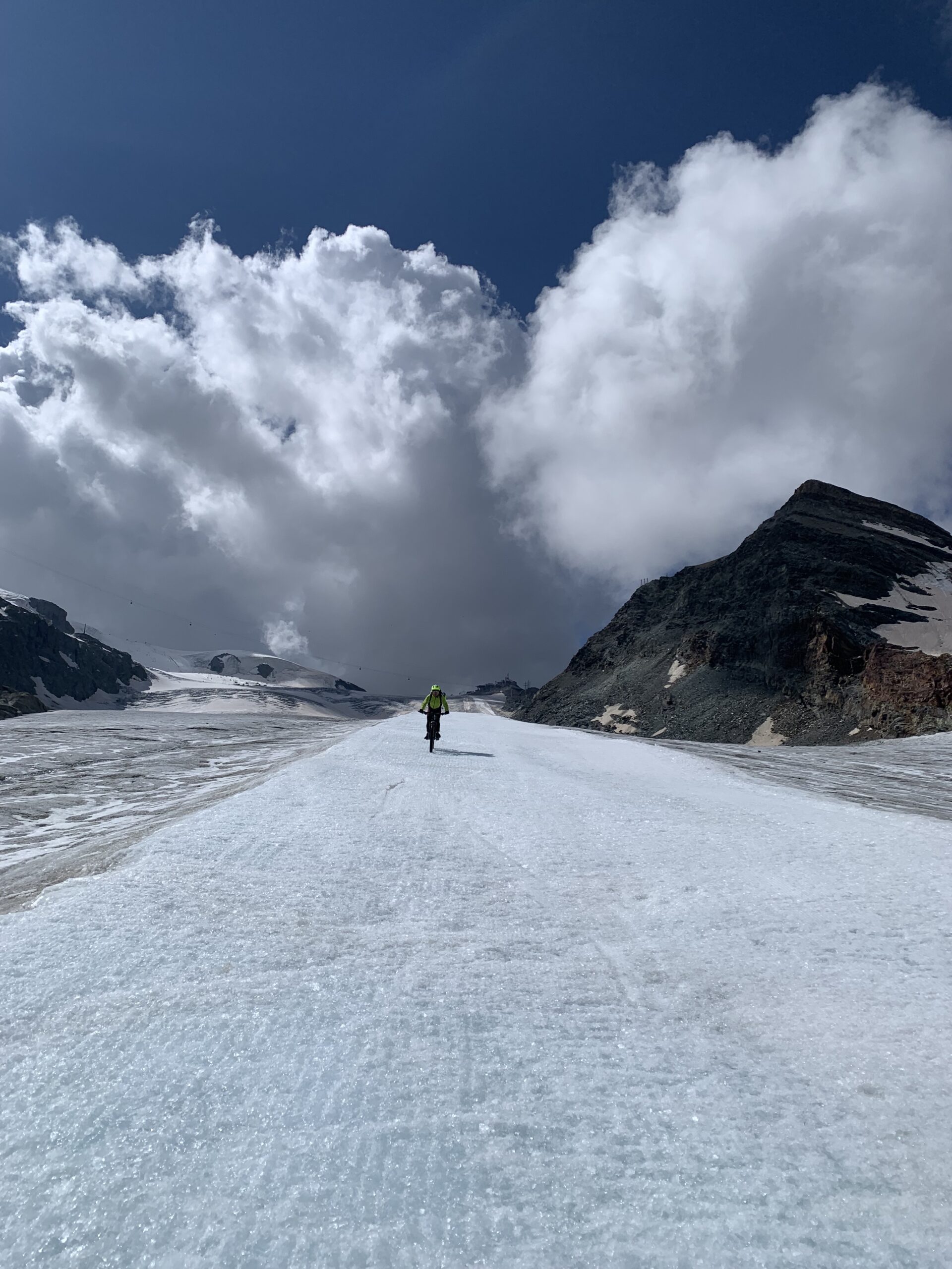 Partiamo dal centro di Cervinia, risaliamo i tornanti verso gli impianti di Plan Maison e, prima degli stessi, svoltiamo a sx verso la parte alta del paese (tabelle in loco direzione Colle del Teudulo); giunti al secondo tornante che volge a dx, si abbandona l’asfalto passando sotto le seggiovie per Cretaz, iniziando così la lunga ascesa “tutta” ciclabile sulle sterrate a servizio dei numerosi impianti di risalita, vegliati dall’alto dalla Grande Montagna, dalla lucente Gobba di Rollin e dalla Testa Grigia; arriviamo al Rifugio del Teudulo ed all’omonimo Colle 3295 m. Ora il panorama che ci interessa è quello del ghiacciaio del Teudulo che corre giù nella parte Svizzera. (nota. la parte italiana salire fino al Teudulo è ammesso con le biciclette in funivia solo al mattino e, nel pomeriggio, solo se si ha prenotato per dormire in quota ai rifugi l’ultima tratta della funivia che arriva al rif. Guide del Cervino effettua l’ultima risalita alle ore 16;15; dal versante svizzero, è ammesso transitare per il ghiacciaio in bici a rischio e pericolo del ciclista. Quindi non ci sono divieti, ma voglio comunque ricordare che si è in transito su un vero e proprio ghiacciaio in quota con presenza di crepacci e, quindi, debbono essere prese tutte le precauzioni del caso).