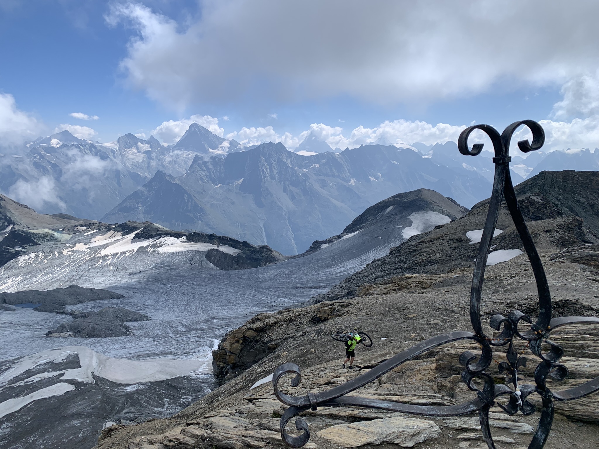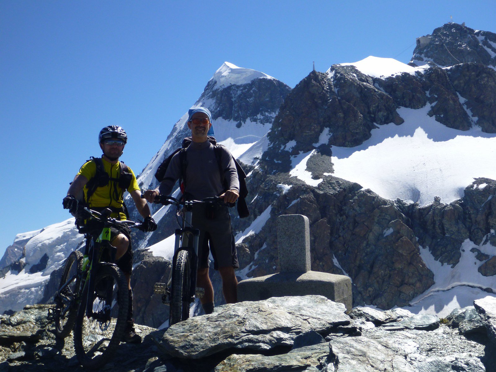 Siamo al paesino walser di Jungu (ci si può arrivare con la funivia da St. Niklaus caricando le bici) per una meritata sosta, abbarbicato su un meraviglioso affaccio prativo, al cospetto degli innumerevoli 4000 che costellano la Mattertall con i loro accecanti ghiacciai.
