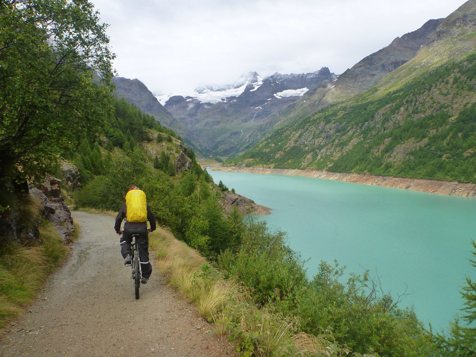 Saliamo all’ampio parcheggio dopo la funivia, sulla sx, evitando i cartelli stradali per il lago di Moiry, entriamo con la carrareccia nel bosco. A pedali ed in poussage riusciamo a vincere a fatica il lato sx orografico del torrente La Grourgra, poi, attraversando una sola volta l’asfalto, risaliamo in portage ed infine a pedali fin sopra la diga di Moiry 2250 m: spettacolare la vista del coloratissimo lago e del Glacier de Moiry che gli fa da corona!