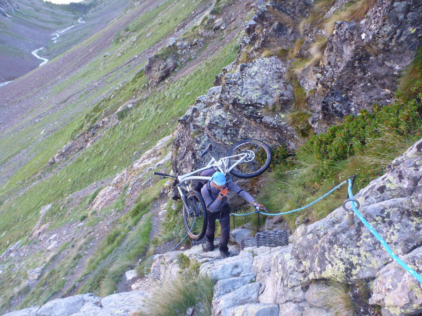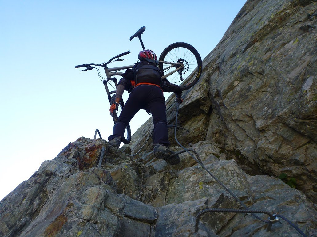Continuiamo a risalire la Comba con qualche tratto in poussage e pedale fino ad incontrare un enorme masso scritto che ci indica la via … e che via!!!: il sapiente sentiero con mille tornati ci fa risalire la dx orografica della Comba, vincendo i tratti rocciosi più difficili attraversando qualche tratto attrezzato con corde e gradini in ferro, trasportandoci da 2300 a 3075 m in duro portage fino al Col de Valcorniere.