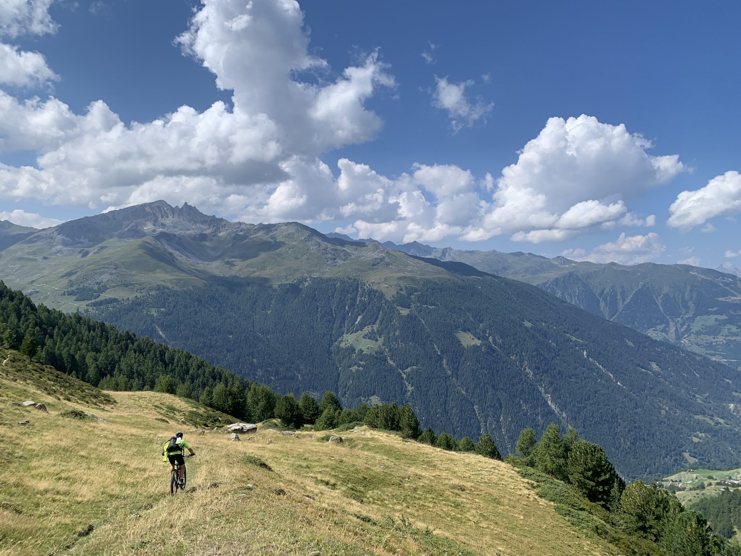 Traversiamo la valle, dopo qualche saliscendi, a quota 2500 m circa per risalire sulla cresta della morena laterale: in portage per gli ultimi duri 150-200 m D+ e siamo al passo. La Groubtalli ci si apre in tutta la sua bellezza: regno del flow su prati e tra gli armenti; poi bosco veloce… molto veloce.