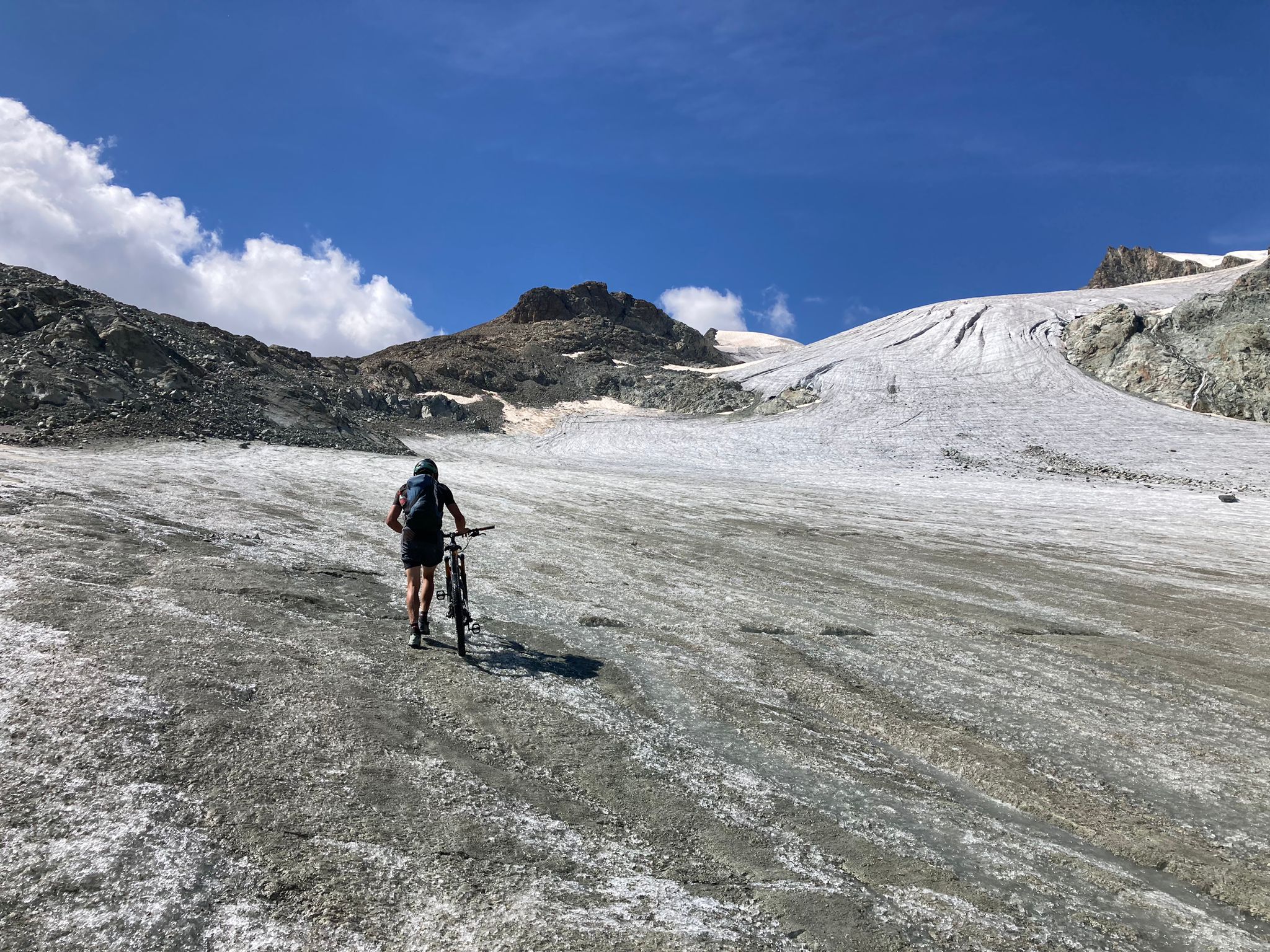 Giornata splendida e tappa remunerativa: poco impegnativa la salita al col de Torrent, molto ciclabile, e bella discesa su verdi pendii di Le Cotter in Val d’Herens…. unico “neo” la risalita sino ad Arolla per una poderale vigliacca (se non ami pedalare)!!!