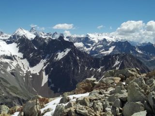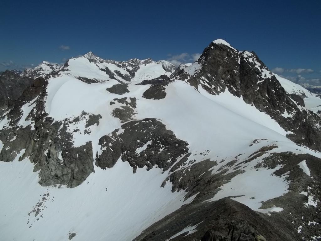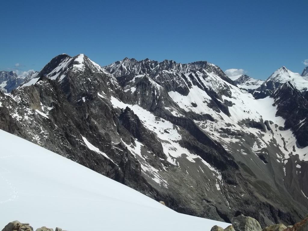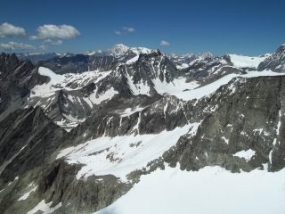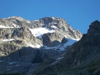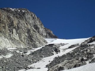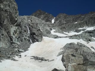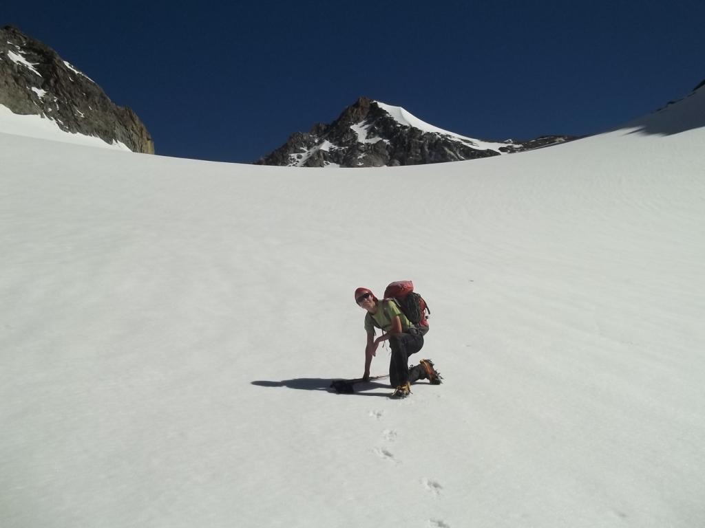 Ancora abbastanza neve nel canalone di accesso al ghiacciaio, ghiacciaio in ottime condizioni, così come i canalini che portano alla sella tra la Rayette e il Cervo.