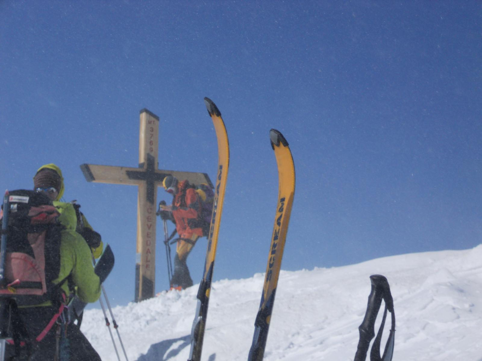 Pernottato al sempre ottimo Rif. Pizzini, partiti alle 07.00 per il Cevedale passando per la vedretta di Cedec. nonostante la nevicata nel mattino precedente la traccia nella parte bassa è ben visibile anche grazie a un gruppo di guida+clienti poco avanti a noi che ci “aprono la strada”. Superata la seraccata (passaggio intuitivo e facile) inizia a farsi sentire un vento dapprima forte, poi patagonico che continua ad aumentare man mano che si sale. In 2,30 ore ci si congiunge alla traccia proveniente dal casati da dove affluiscono gran parte degli scialpinisti diretti al Cevedale. Passaggio sulla crepaccia terminale agevolato da un buon ponte, poi il vento sempre più cattivo ha reso “lucido” di ghiaccio l’ultimo tratto, rendendo non facile la cresta finale. Arrivo in croce di vetta in una bufera di neve sollevata da un vento che soffiava da sud come (parola dei local) non ha mai fatto sul cevedale. Per trovare un minimo di riparo “svalichiamo” la cresta e ci buttiamo sul versante trentino. Discesa che tranne il primo tratto (100m di dislivello circa) di ghiaccio vivo (a fianco dei residuati bellici della 1 guerra mondiale) e col vento contrario (che ci rispingeva verso monte) diventa una lunga e spettacolare sciata con 15 cm di polvere, perlopiù portata dal vento. Ottima sciabilità su polverina fino a quota 3000 circa, dove dopo un breve tratto di duro inizia il pianoro e la crosta, sempre meno portante fino a giungere alla neve molle e al meritato piatto di pizzoccheri e birra del Pizzini. Nel ritorno al parcheggio dei forni, neve presente praticamente fino all’inizio del sentiero, con qualche breve interruzione qua e la.