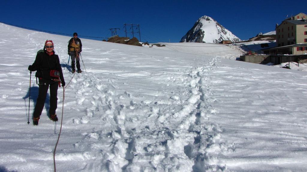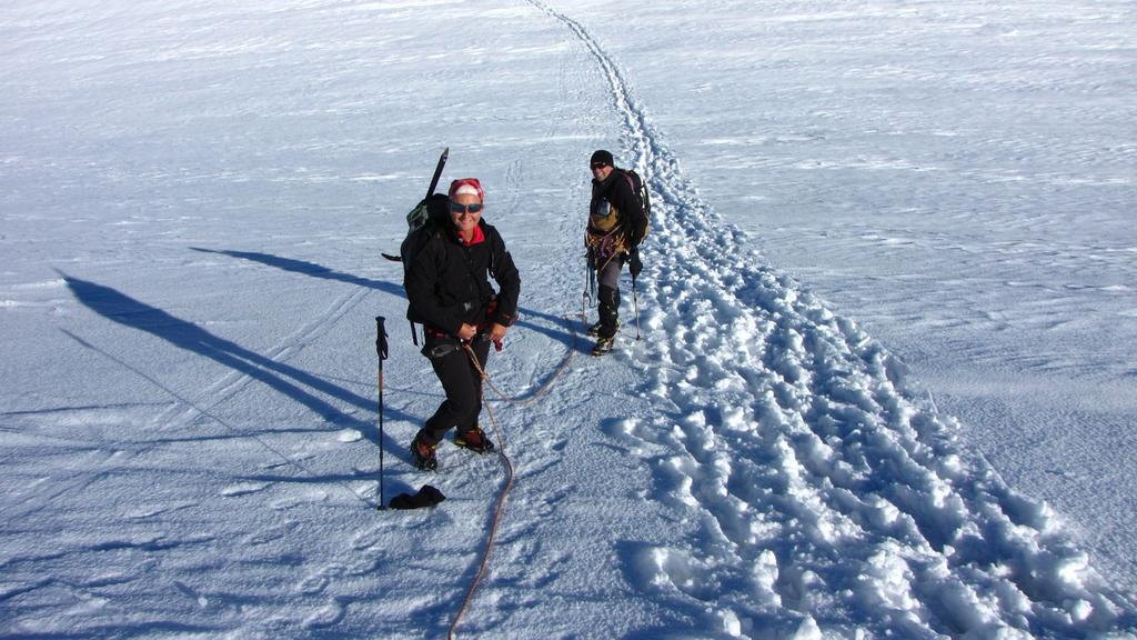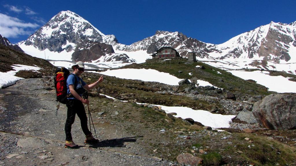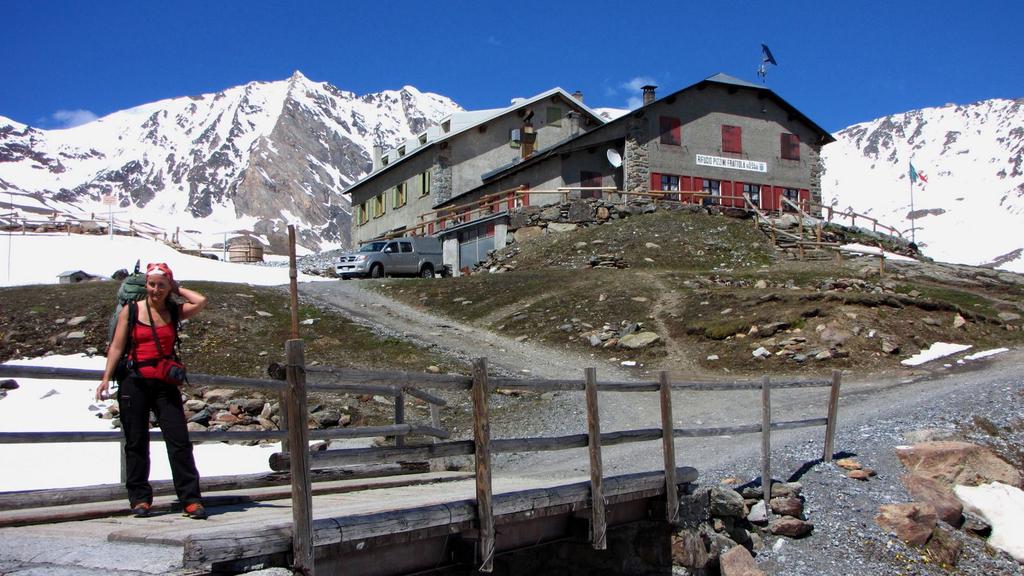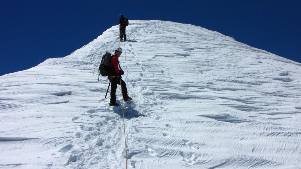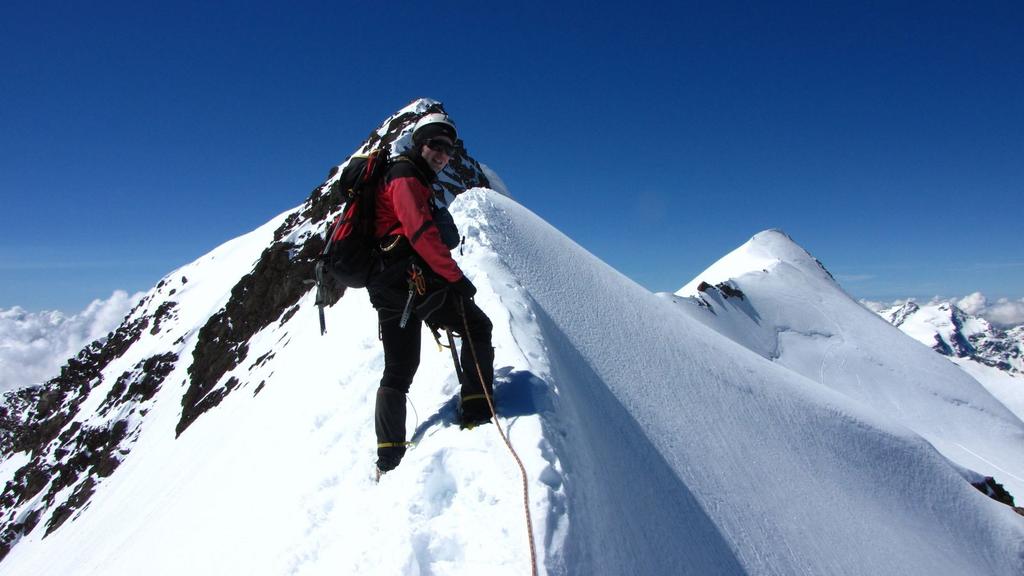 Un piacevole ritorno al Monte Cevedale, dopo la bella traversata Vioz-Cevedale fatta alcuni anni fa. Quest’anno sono ritornato nell’ambito di una Gita Sociale del CAI Ligure di Genova, della durata complessiva di 3 giorni (per noi genovesi c’era un ponte di 4 giorni) fatta quindi con calma, senza avere l’incubo di un rientro in ore notturne e poi doversi alzare presto il lunedì mattina per andare a lavorare in stato comatoso !!). In totale eravamo 15 persone, e ci siamo divisi su due itinerari. Io e altri due amici abbiamo deciso di salire al Cevedale per la bella cresta NE e includere dunque anche la salita alla Zufall Spitze, mentre gli altri 12 partecipanti hanno salito la via normale del versante NO. Arrivati il 24 giugno all’Albergo dei Forni con i miei due soci, ci siamo incamminati lungo la stradina della Val Cedec che portava al Rifugio Pizzini con splendida visuale sulle varie cime del Bacino dei Forni. Nel giro di ore 1,30 siamo arrivati al Pizzini, trovando poca gente e dove ci siamo concessi una breve sosta. Ripartiti lungo la stradina che porta ai laghetti di Cedec, troviamo la prima neve. Al momento non si sale ancora per l’usuale sentiero della via estiva, ma per il nevaio che sale verso il Monte Pasquale sulla nostra destra. Sul nevaio è presente una vasta traccia che seguiamo, purtroppo la temperatura è molto elevata e nella parte alta abbiamo faticato non poco, sfondando a tratti e poi con zaini pesantini sulle nostre spalle. Si sale interamente su neve, su tratti ripidi fino al Passo del Cevedale, con neve dura questo tratto richiede l’utilizzo dei ramponi. Arrivati al Casati, con nostra sopresa vediamo che siamo pochissimi, solo noi tre, altri due italiani ed un gruppo di 5 tedeschi, niente affollamento, niente doppi turni, niente caos nel deposito dei materiali…insomma meglio di così non potevamo chiedere ! Una bella giornata, con sole e cielo sereno, bella vista sul Cevedale e sullo splendido Gran Zebrù. Al Casati siamo saliti solo noi tre, mentre gli altri 12 del gruppo hanno preferito fermarsi al Rifugio Pizzini. Buona la sistemazione, il trattamento e la cena, una cameretta da 6 persone tutta per noi. L’unico aspetto che mi ha lasciato un pochino perplesso è la cifra richiesta per i soci CAI…50 euro mi sembrano tantini ! Fatta una buona dormita, ci svegliamo intorno alle 6,00, facciamo colazione per le 6,40, ci prepariamo con calma e poi verso le 7,30 ci portiamo al Passo del Cevedale ad attendere i nostri amici che salgono dal Pizzini. Dopo esserci riuniti, un breve saluto e noi tre iniziamo la salita, avvisando i capigita che noi preferiamo salire per la cresta NE e salire anche la Zufall Spitze. il ghiacciaio (Vedretta del Cevedale) si presenta in ottime condizioni, con una buona pista tracciata e i crepacci ancora tutti coperti e chiusi (quest’anno è nevicato davvero tanto…anche recentemente !). Risaliamo agevolmente il ghiacciaio sui facili pendii verso sinistra, raggiungendo e superando il gruppo dei cinque tedeschi che salgono…senza ramponi e molto lentamente. Una volta giunti nel pianoro glaciale a circa 3500 m. abbiamo tralasciato il pistone della Via Normale e abbiamo puntato a sinistra, attraversando il ghiacciaio fino a raggiungere la base della cresta NE su terreno facile e senza crepacci. Dopo una piccola sosta ha inizio la parte più bella e divertente di questa gita : la salita della cresta NE appunto ! Si tratta di una cresta di neve e misto davvero piacevole, con alcuni tratti di misto non proprio banali, tratti nevosi anche molto affilati e con la presenza di alcune insidiose cornici. Essendoci ancora molta neve, in diversi punti occorre prestare molta attenzione, per il superamento di alcuni risalti rocciosi e nel tratto roccioso e/o di misto che precede la cima della Zufall Spitze. Noi abbiamo fatto alcuni tiri di corda in cresta, dato che alcuni passaggi erano piuttosto insidiosi, e qualche tratto delicato. Bello anche l’arrivo in vetta su una crestina affilata ! E’ stata davvero una bella ascensione e di soddisfazione, che ci ha decisamente ripagati della scelta fatta ! Grande montagna e ambiente glaciale d’alta quota veramente spettacolare ! La giornata oggi è stata davvero molto favorevole, cielo sereno e visibilità ottima in tutte le direzioni ! Panorama a giro d’orizzonte dalla cima…immenso (dalle Dolomiti, al Bernina, ai Gruppi Adamello-Presanella fino al lontano Gruppo del Rosa). Oggi sulla Zufall Spitze siamo saliti solo noi tre. Dopo circa 30 minuti di sosta abbiamo proseguito lungo la cresta NE raggiungendo anche la cima principale del Cevedale. Quando siamo arrivati in cima al Cevedale stranamente non c’era nessuno e la vetta era solo per noi ! I nostri compagni di gita sono arrivati tutti in vetta lungo la normale, ed erano in discesa verso il Casati. Un’altra mezzora di sosta in vetta al Cevedale…e ne valeva davvero la pena, per ammirare il panorama, fare le foto, goderci la cima ! Oggi non c’era motivo di avere fretta e scendere di corsa..dato che non dovevamo ritornare a casa, ma solo scendere fino al Pizzini ! Scesi senza fretta lungo la via normale, ritroviamo i nostri amici ad aspettarci sulla terrazza del Rifugio Casati, che si complimentano con noi per la bella salita fatta..cosa che mi ha fatto davvero piacere ! Una sosta al Casati, paghiamo il conto, recuperiamo i ricambi lasciati al rifugio e poi ci avviamo in discesa verso il Pizzini, con marcia faticosa…la neve è ormai allentata (temperatura di oltre 30°!!) e spesso si sfonda, ma ormai ci siamo, la nostra meta è il Pizzini, dove ci fermiamo a pernottare. Cena di qualità e ottima compagnia di tutti gli altri compagni di gita..atmosfera molto cordiale e calorosa ! Ho anche rivisto persone ed amici che da molto tempo non avevo più avuto modo di ritrovare ! Il giorno seguente (26 giugno) dopo aver rifatto gli zaini e pagato il conto siamo scesi all’Albergo dei Forni per il sentiero panoramico e non per la stra