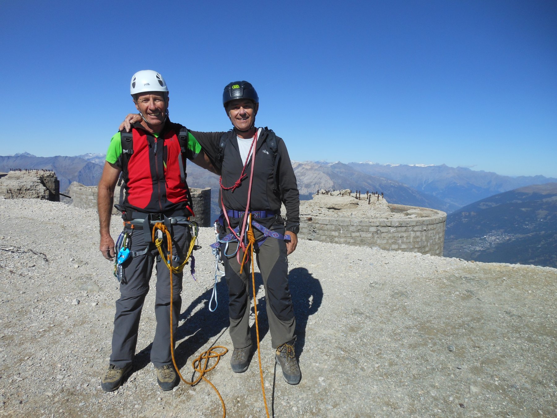 Eterna! però merita. Saliti da Claviere e seguito alla lettera l’itinerario descritto da varie relazioni. Il sentiero parte subito dritto nel bosco portando in un’ora a Batteria Alta, da qui siamo saliti sul bel sentiero nel Petit Vallon sino a quota 2700m arrivando alla base SSE dello Chaberton. Qui deviamo a sinistra scendendo leggermente e attraversando alcuni canali detritici (occhio al fondo scivoloso…), sino ad un canale più ampio che si risale sino ad una cengia detritica che da inizio alla arrampicata segnata da bolli rossi (1°spit ). L’arrampicata di per se non presenta difficoltà particolari (I° e II°), ma visto il fondo detritico e scivoloso in parecchi punti esposti, abbiamo scelto di progredire legati e in sicurezza utilizzando gli spit della parte bassa e spesso spuntoni di roccia, il che ci ha fatto allungare i tempi di salita in questa ultima parte, ma va bene così. Dalla punta panorama a 360° in una giornata tersa e fresca e dopo uno spuntino e due foto giù dalla normale sino all’auto completando così un bell’anello. Con il coscritto Valter in forma come sempre che ringrazio per la bella compagnia. Sulla via percorsa solo noi, un altro gruppo di 4/5 persone è salito dalla più impegnativa cresta sulla Via Perona, dalla normale vari escursionisti oltre al gruppo Cai Bussoleno, arrivato e ripartito dalla punta prima del nostro arrivo.