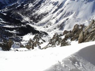 oggi ho fatto una piccola variante al percorso classico seguendo dei canali verso sx fino a raggiungere lo spallone finale non male ci si diverte sempre su questa palestra del ripido, peccato che la neve è pessima sfondosa e marcia, molto