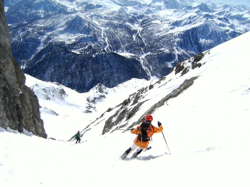 Salita dalla normale su neve dura e ventata segnata dai passaggi utili i coltelli da sotto il colle alla cima. Vento patagonico in salita soprattutto sopra dal colle ma calma in vetta e sole gradevole. Conviene non scendere dopo le 10/10,30, si troverà la parte alta ancora duretta ma sotto rimane ottimo firn. Dalla fine del canale a batteria alta neve da antologia e grandi curve, ancora innevato il canale che scende a Claviere, ma a breve si troverà qualche interruzione. Gran sciata con Enrico a distanza di 10 anni dalla nostra discesa insieme e con Chiara ed Alain affascinati da questa disciplina. Discesa consigliata. Raffrontata alla Sud, sud ovest fatta qualche settimana fa ritengo sia più continua il 4.2 è un pò stretto non sottovalutarla.
