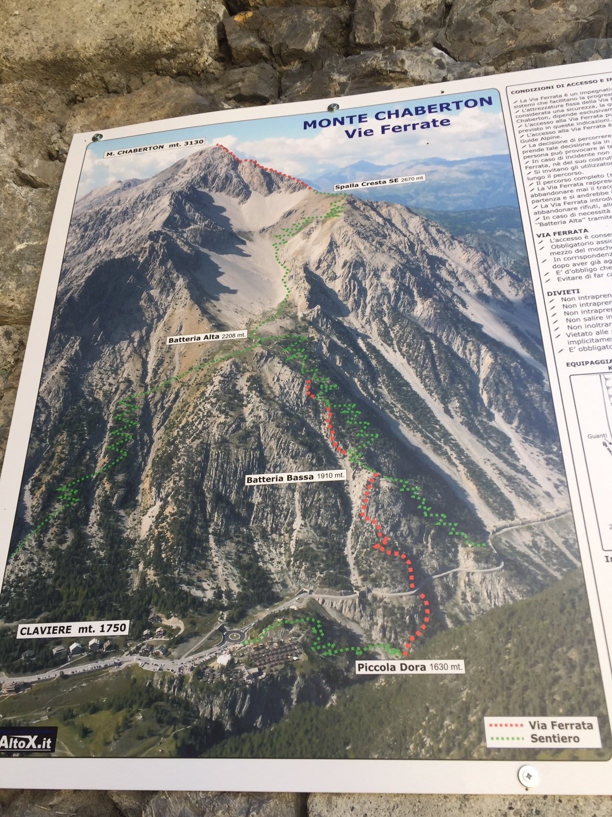 La ferrata integrale dello Chaberton si articola in realtà in tre ferrate separate descritte di seguito in sequenza dal basso verso l'alto: 1) Ferrata Batteria Bassa - 2) Ferrata Batteria Alta - 3) Ferrata Perona . Le prime due ferrate sono di fatto singolarmente autonome e sono anche descritte in questo sito come "Ferrate du Petit Vallon" e sono unite alla terza (ferrata Perona, che porta alla vetta) da un lungo tratto di raccordo.