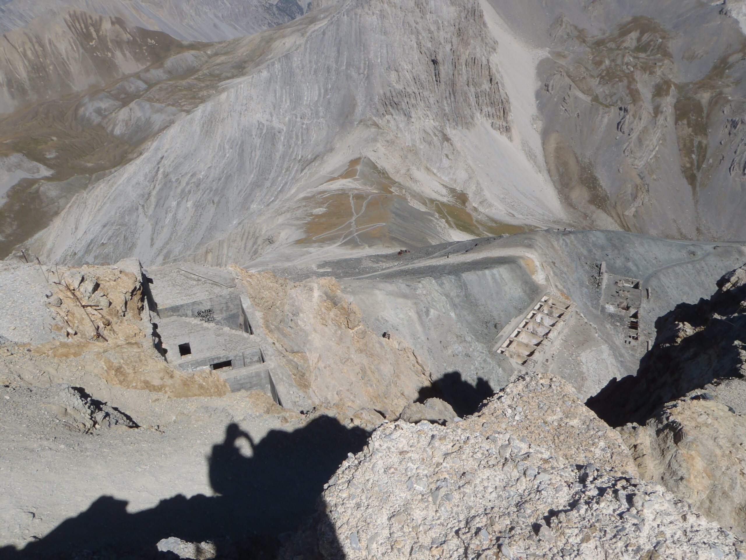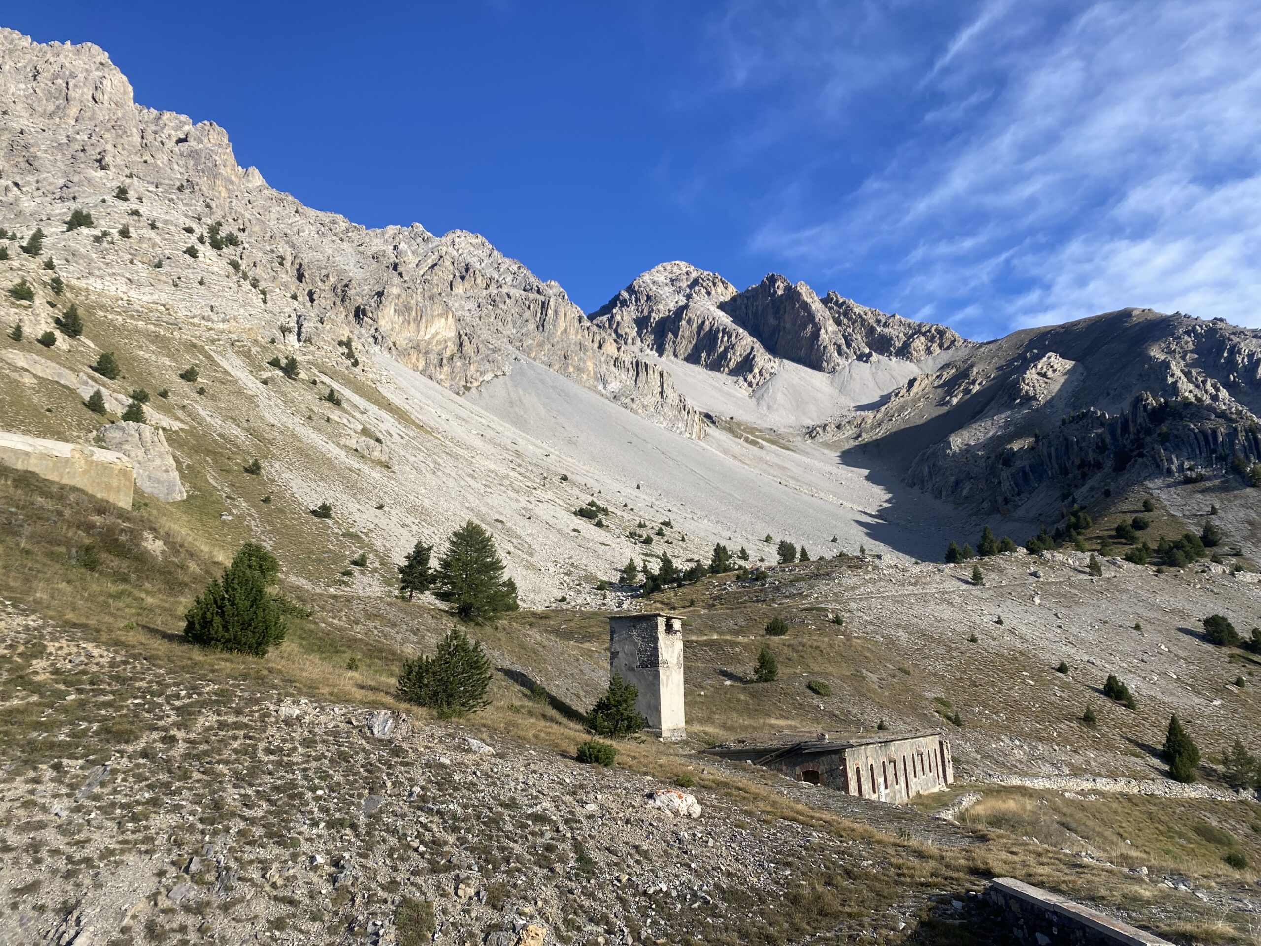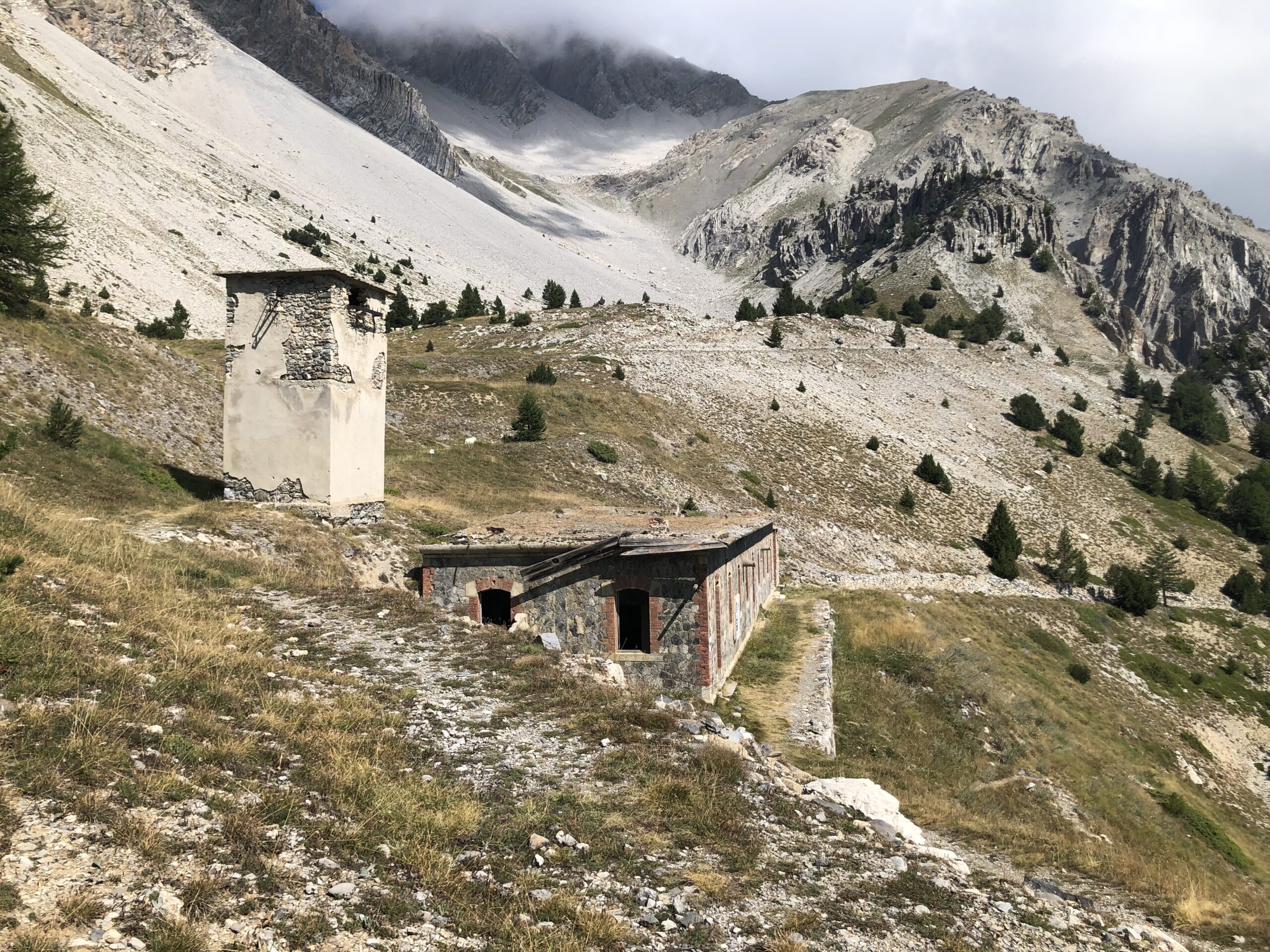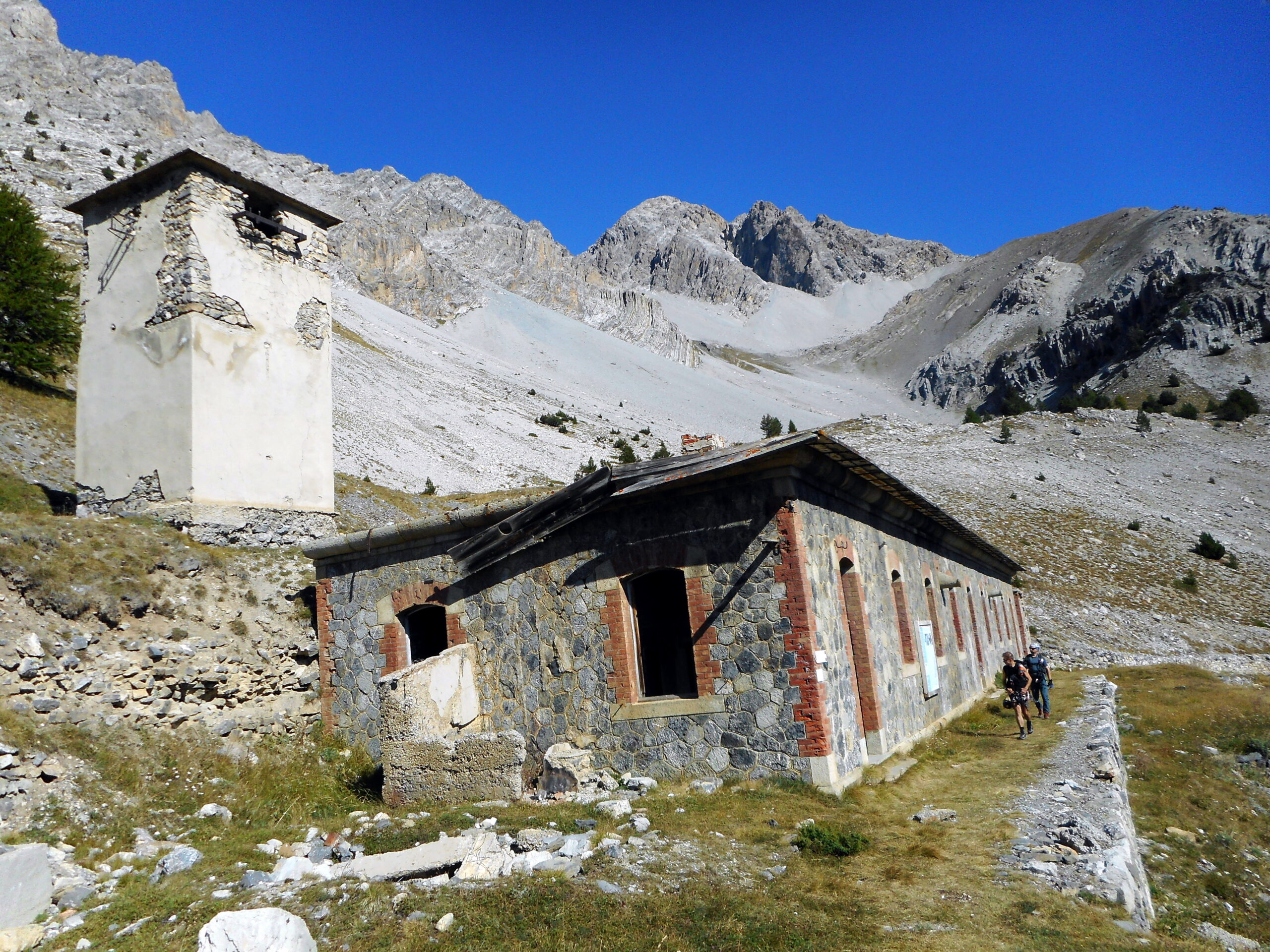 Aggirare sulla sinistra (faccia a monte) la costruzione e seguire la traccia che risale sulla destra il lungo vallone detritico . Si giunge quindi alla spalla della cresta sud-est dello Chaberton da cui parte la ferrata Perona . (ore 1,00 – 1,30 – da m 2.200 a m 2.700 )