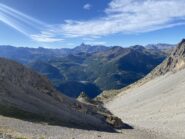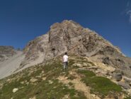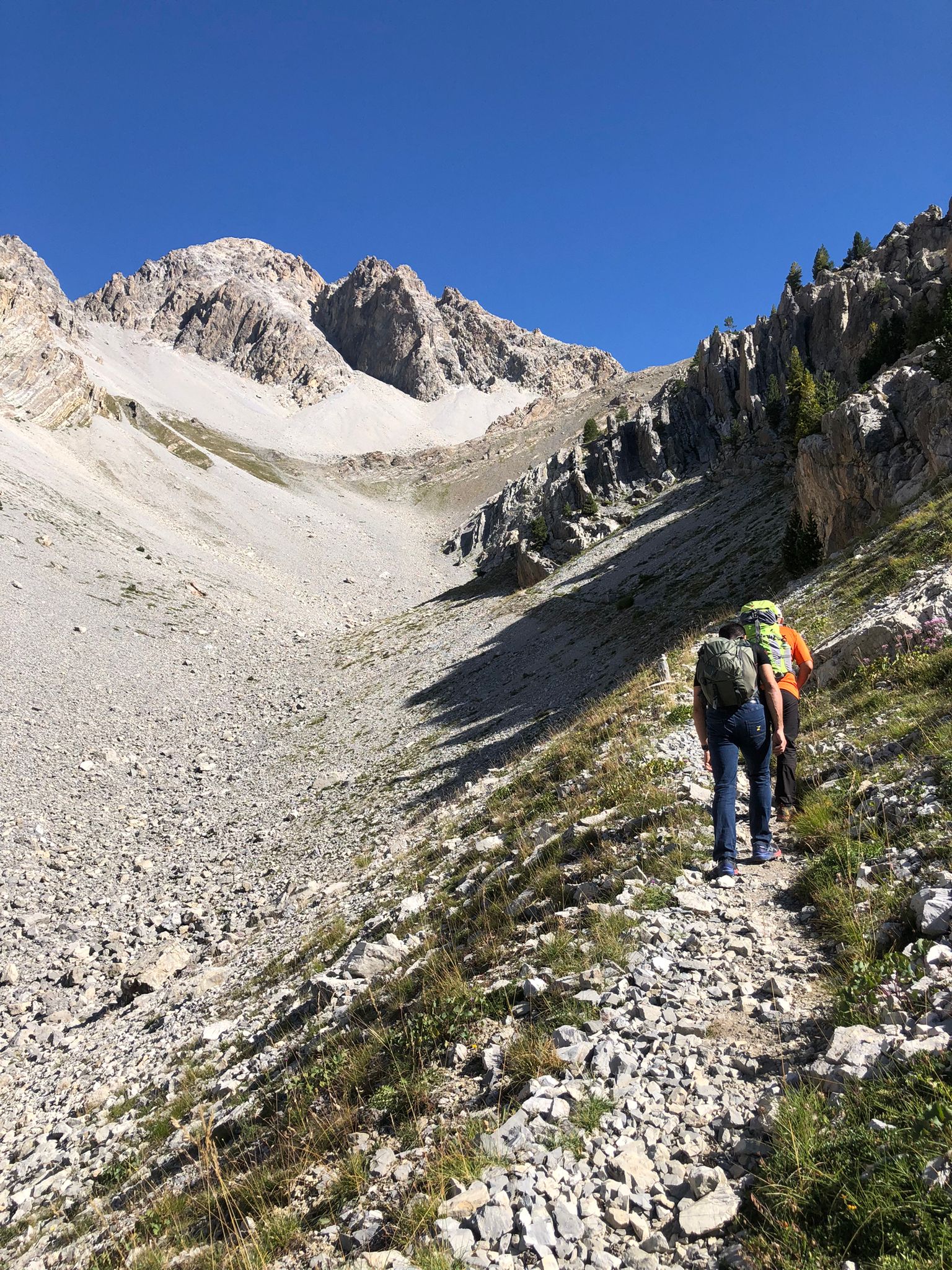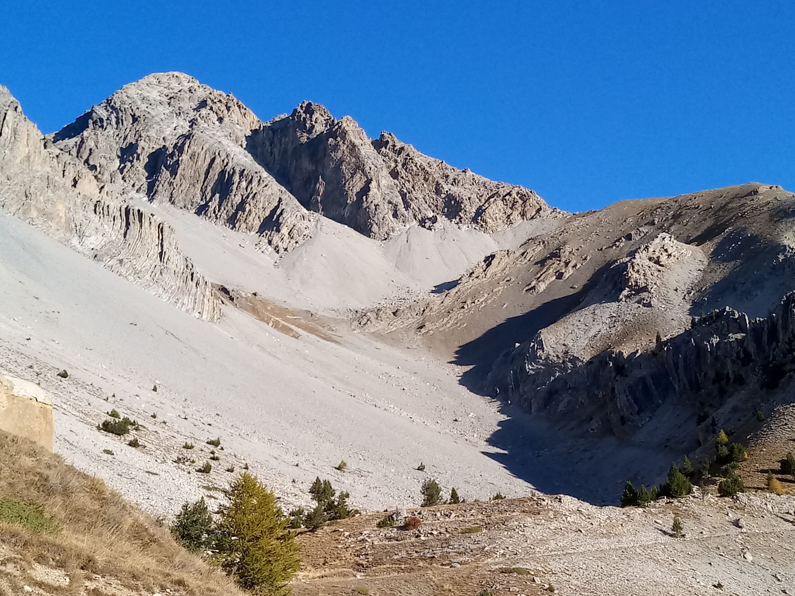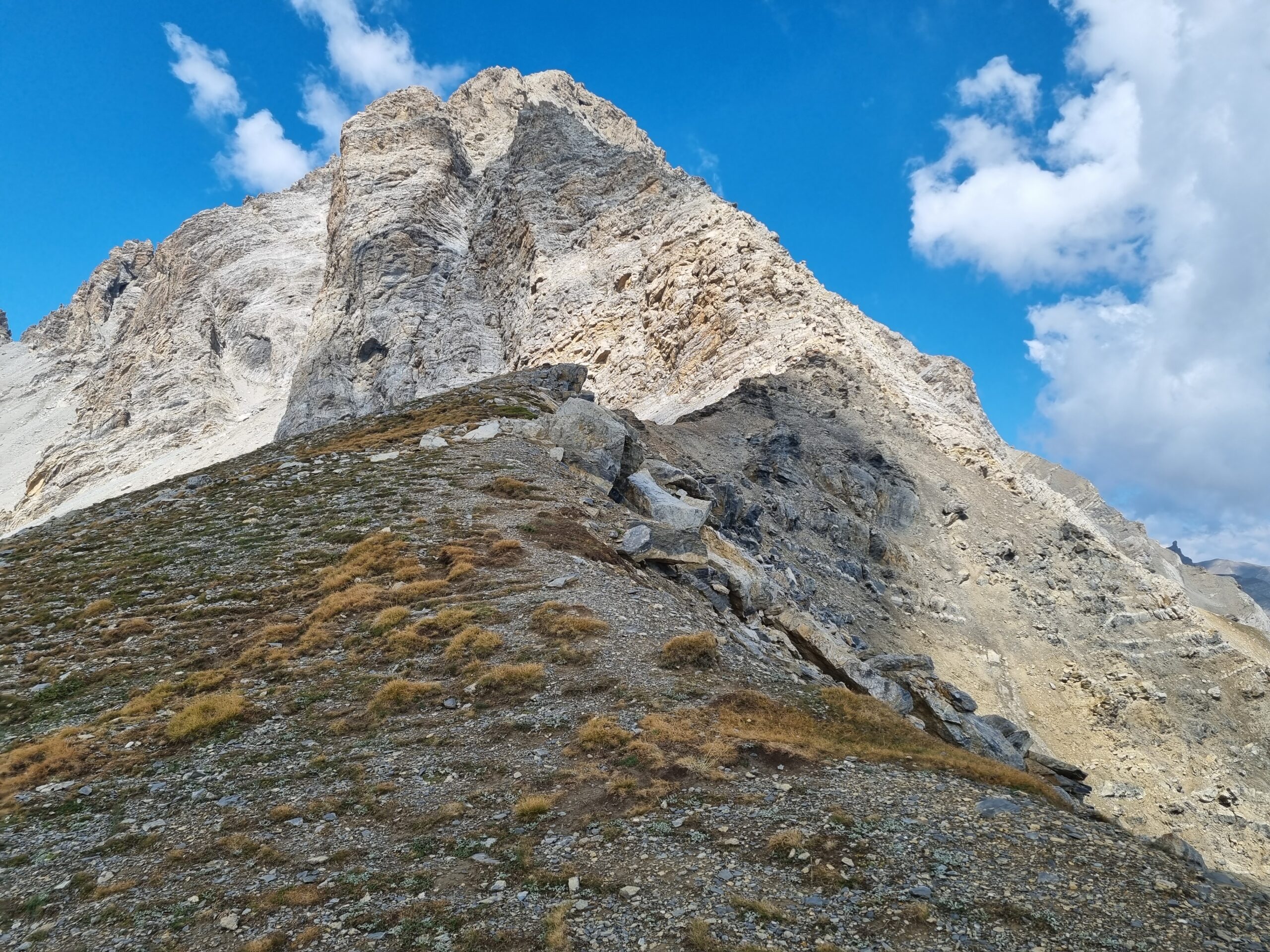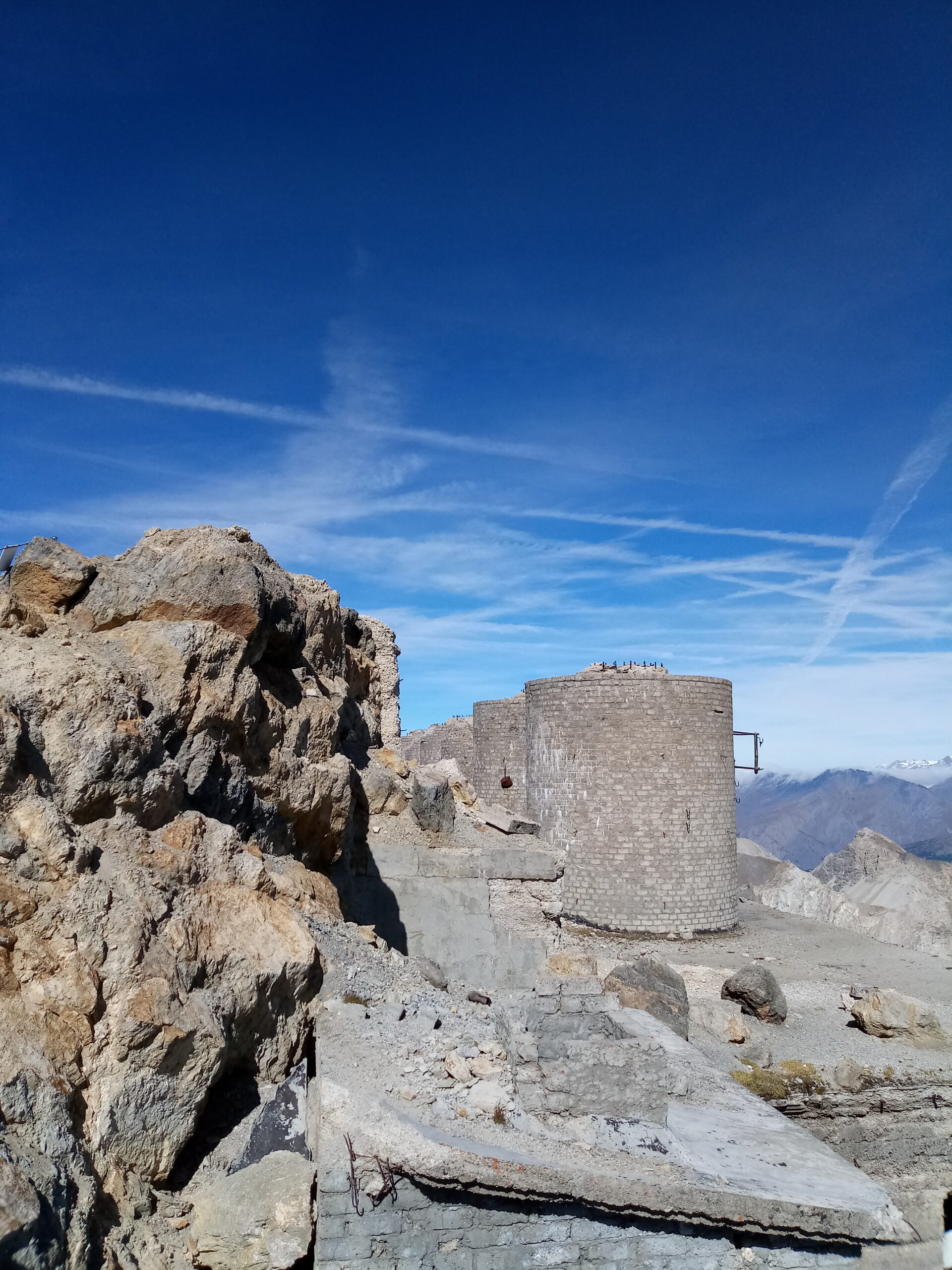 Aggirare sulla sinistra (faccia a monte) la costruzione e seguire la traccia che risale sulla destra il lungo vallone detritico . Si giunge quindi alla spalla della cresta sud-est dello Chaberton da cui parte la ferrata Perona . (ore 1,00 – 1,30 – da m 2.200 a m 2.700 )
