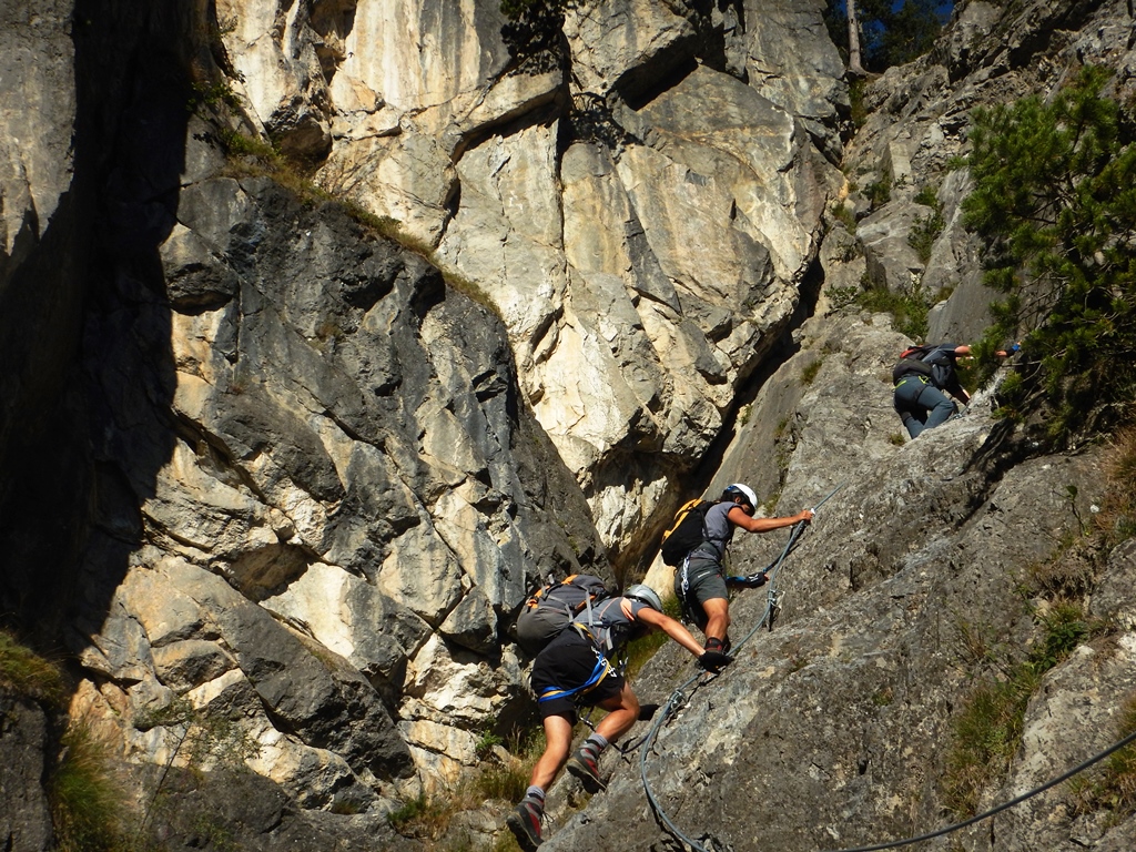 All’uscita della galleria la ferrata inizia con un traverso per poi verticalizzarsi immediatamente. Ferrata divertente , di media difficoltà, con arrampicata per roccette e placche che porta ai resti della Batteria Bassa ( 45/50 minuti di ferrata – da m. 1.700 a m. 1.900). Da questo punto è possibile ritornare a Claviere mediante il ripido sentiero che scende a destra ( faccia a monte) e che incontra la vecchia statale leggermente più a valle della galleria da cui siamo partiti .