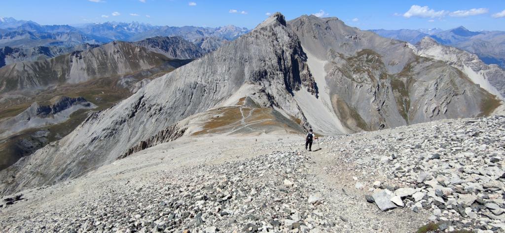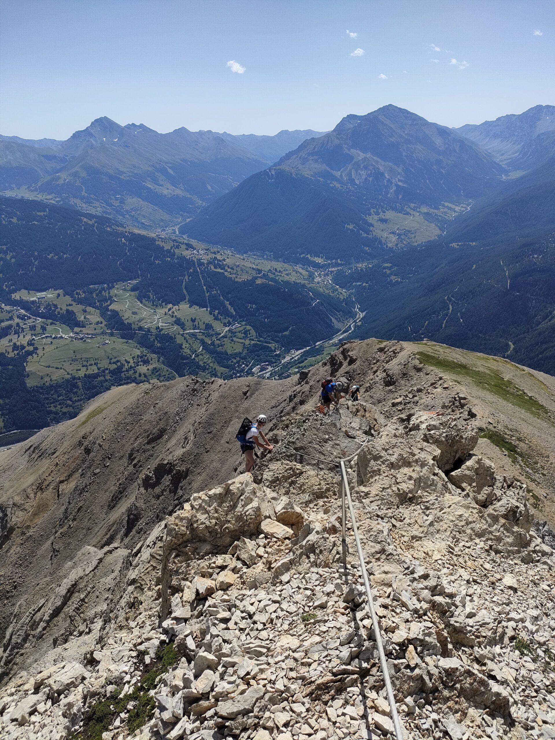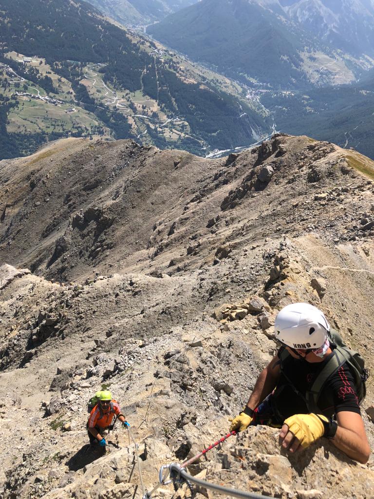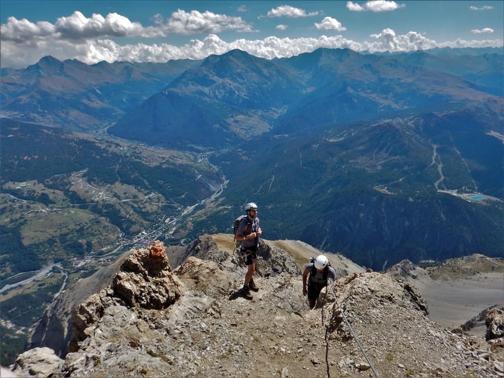 Dopo aver percorso il tratto della cresta erbosa della spalla si incontra la partenza della ferrata Perona chiaramente segnalata da apposito cartello e ben visibile. La stessa è stata riattrezzata nel 2018. In realtà si tratta di una via alpinistica di cresta attrezzata con il cavo da ferrata. La risalita segue sempre lo spigolo di cresta con tratti molto aerei e piacevolmente immersi in un paesaggio di alta quota. Si alternano placche e fili di cresta senza particolari evidenti difficoltà, salvo il fatto che il forte dello Chaberton è … ingannevolmente a vista. Qui si richiede quindi attenzione per l’eventuale stanchezza, che complice l’altitudine, può farsi sentire. L’arrivo in vetta ripaga dello sforzo (1,30 – 2 ore – da m 2.700 a m. 3.100)
