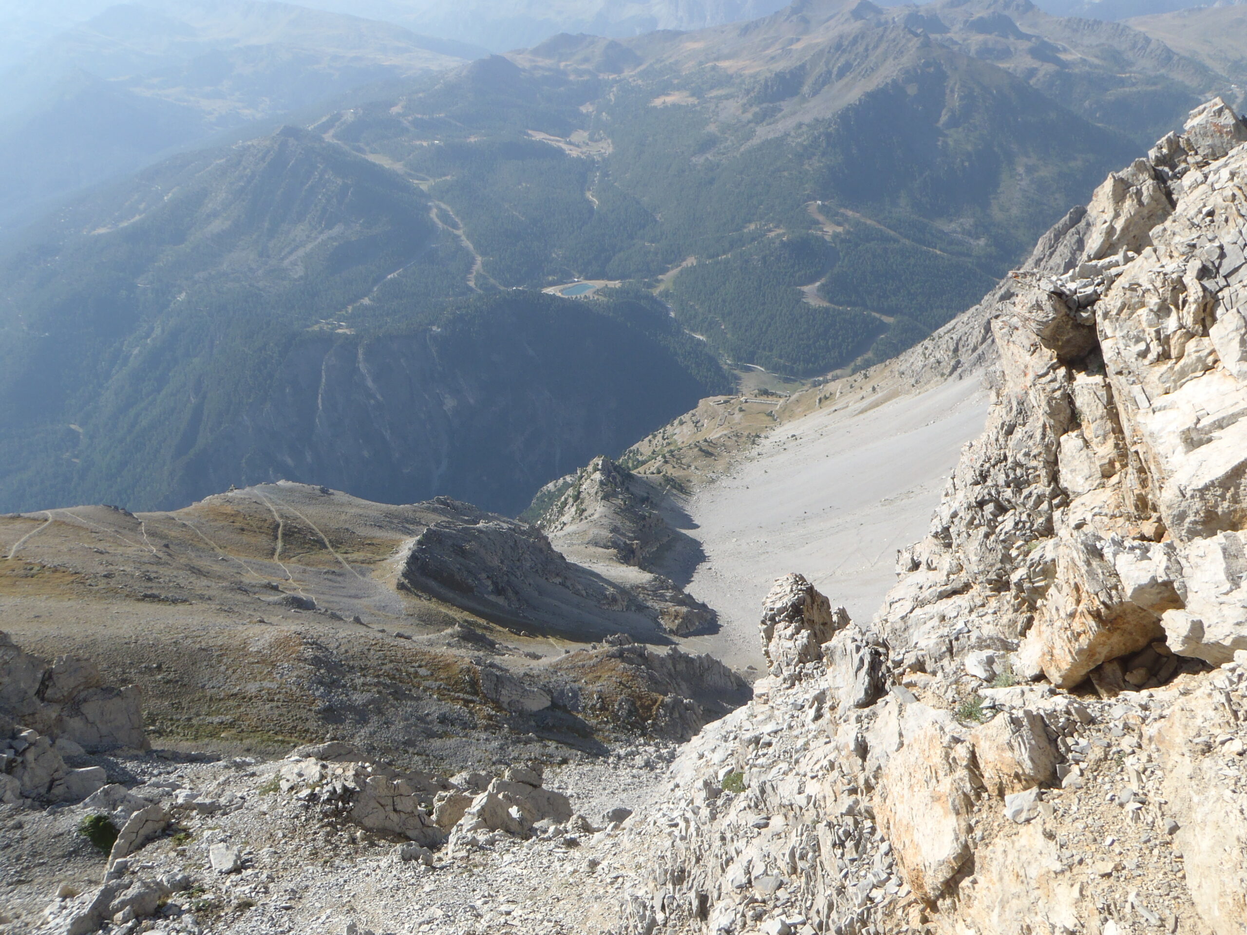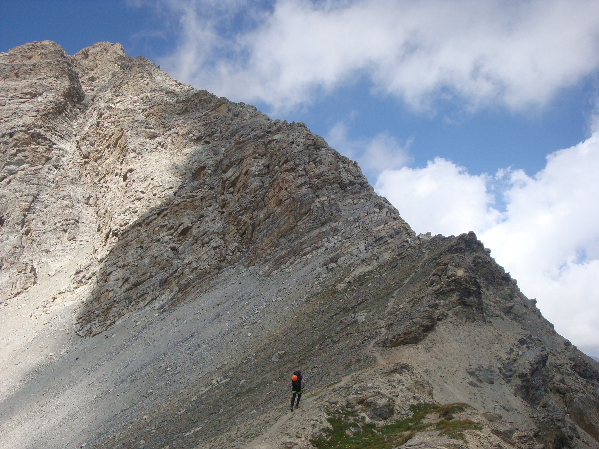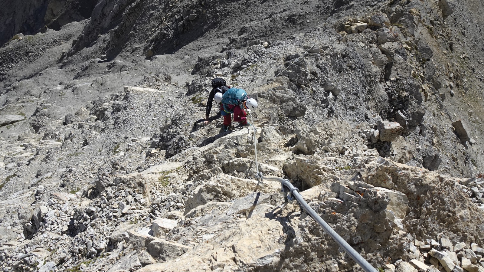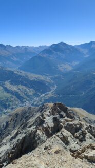Terzo tratto – raccordo con la Ferrata Perona con risalita del Petit Vallon (difficoltà E) . A questo punto prima di intraprendere il percorso che ci porterà allo Chaberton occorre fare una seria valutazione sia delle condizioni meteo, sia delle proprie forze e del tempo a disposizione ( al tempo rimanente per il raggiungimento della vetta occorre sommare il tempo di rientro a Claviere, in totale dalle 4,30 alle circa 6 ore). Il dislivello da fare è ancora di circa 1.000 metri per la vetta, di cui 500 all’attacco della ferrata Perona. Non ci sono vie di fuga lungo il percorso se non il rientro a Batteria Alta e di qui a Claviere.