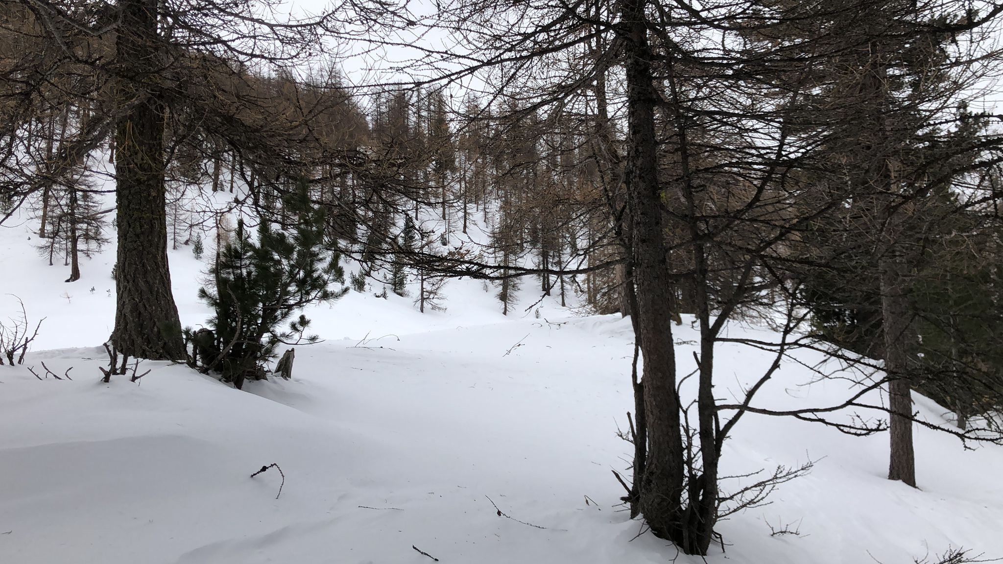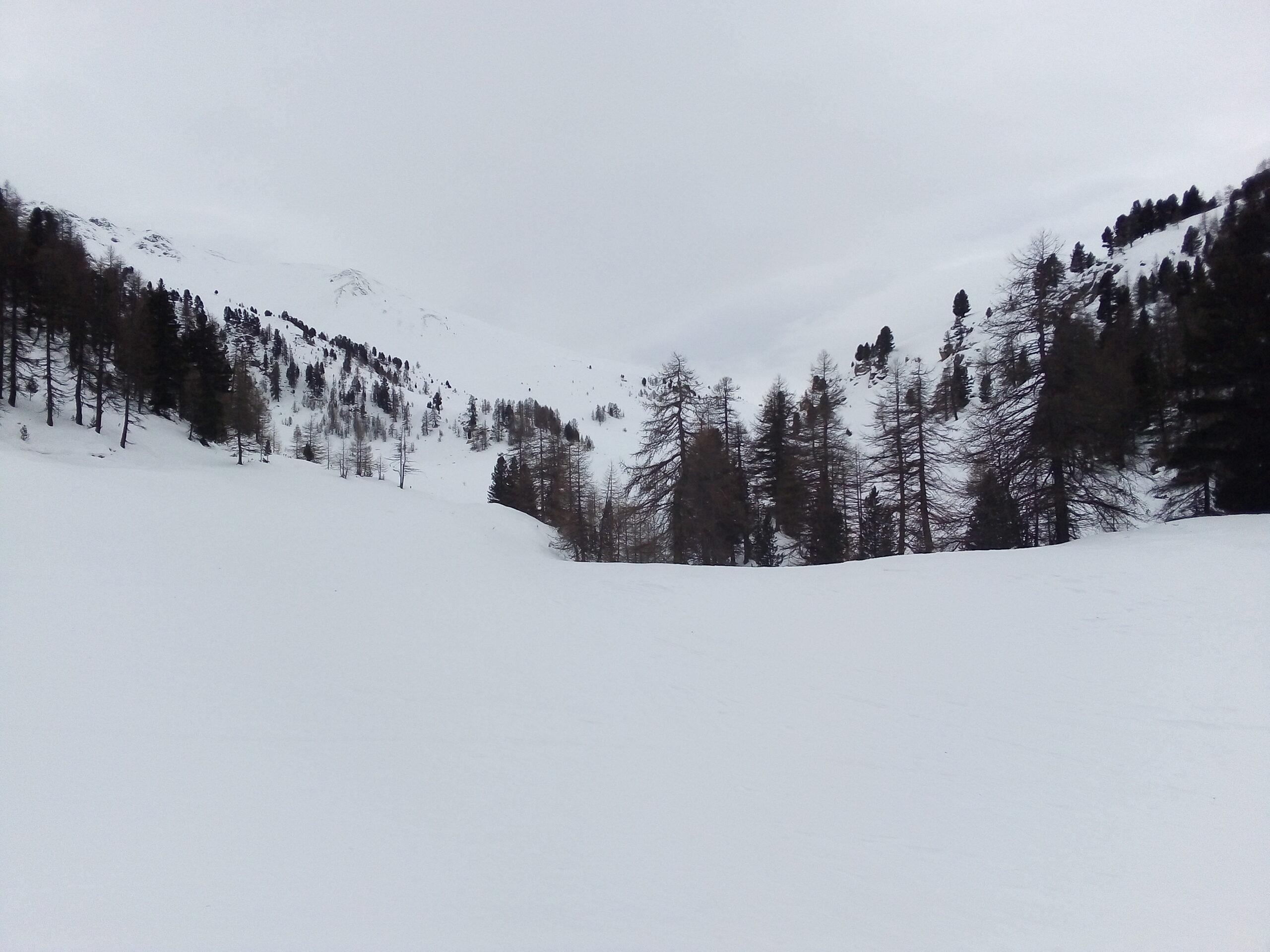 Neve pressatissima fin dall’inizio della stradina verso Rhuilles, e poi ancora battuta fino alle grange Chabod. Più oltre solo qualche traccia sulla pista, ma almeno oggi (giornata praticamente senza sole) fondo quasi sempre portante. Partiti in tre non prestissimo, ci siamo fermati dalle parti di quota 2100.