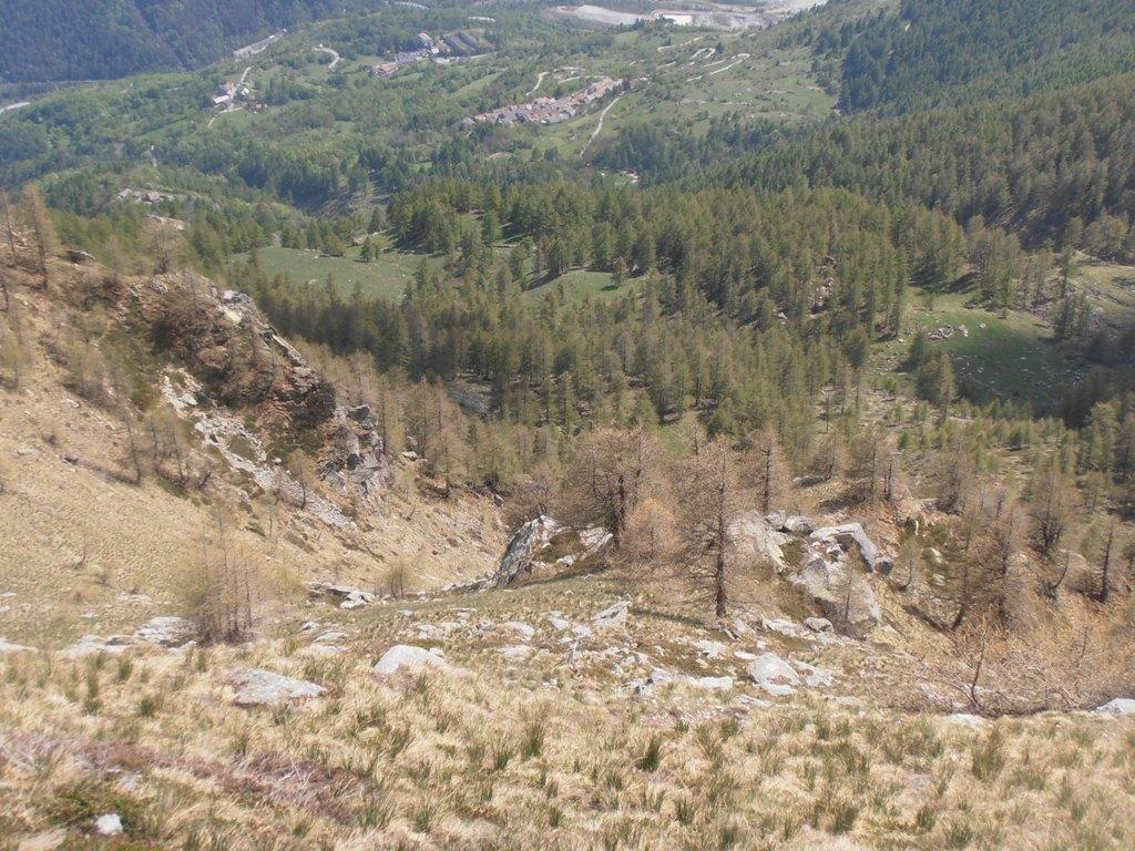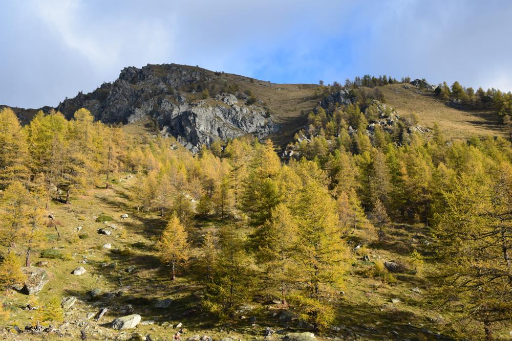 Si continua a monte delle case, per poi piegare progressivamente a sinistra, entrando in una fascia boscosa. A circa 1900 m si raggiunge una prima radura e poi poco oltre una seconda, poste nel vallone tra la cima Casses Blanches e il monte Chabriere.