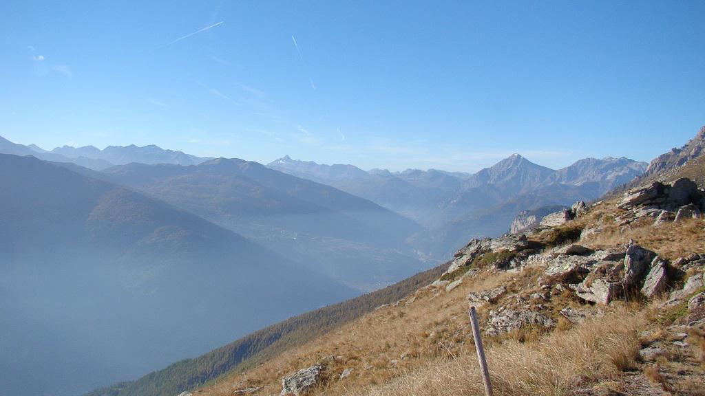 Si prosegue sulla traccia di sentiero, non sempre evidente dirigendosi verso destra alla base di un pendio-canalone privo di vegetazione, che si risale con un sentiero (ex mulattiera militare in parte franata) dalle numerose serpentine. Quando si esce dal canale, in prossimità della dorsale S/SE si incontra una palina con cartelli indicatori, ottimo punto panoramico. Da qui si prosegue per il monte Chabriere sulla comoda dorsale erbosa fino ai ruderi militari posti in cima.