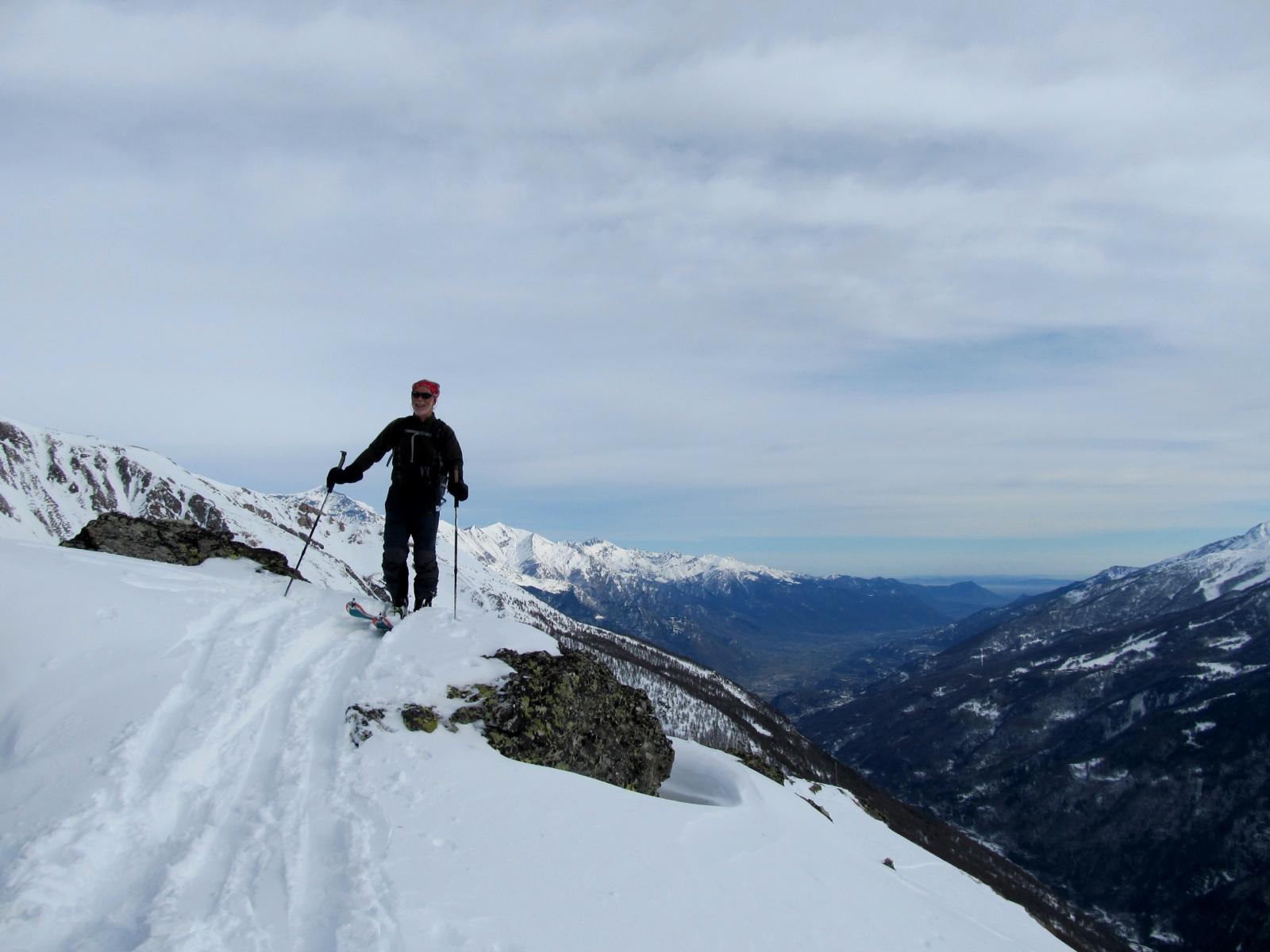 Partiti da Fenils con neve appena sufficiente, da Eclause ( raggiungibile in auto) strada innevata e manto continuo ma senza fondo. Qualche attenzione nella parte finale fuori dal bosco visto la notevole quantita di neve. Discesa: primi 100 mt. con attenzione, per non passare nei pendii carichi si rischia qualche pietra, quindi cercando l’esposizione sud/est ottima farina, qualche ravanamento in basso visto l’assenza di fondo per arrivare a case Peyron. Due nostri compagni a quota 1750 circa sono scesi più a sn evitando così la parte più malagevole ricongiungendosi poi alla strada. Bella e panoramica gita, visto l’esposizione non so quanto possa mantenere le condizioni odierne (esp. sud/ovest già tendente a crosta), un po’ da prendere al volo quindi un grazie ai compagni di gita che l’hanno proposta. Solo noi sul percorso.