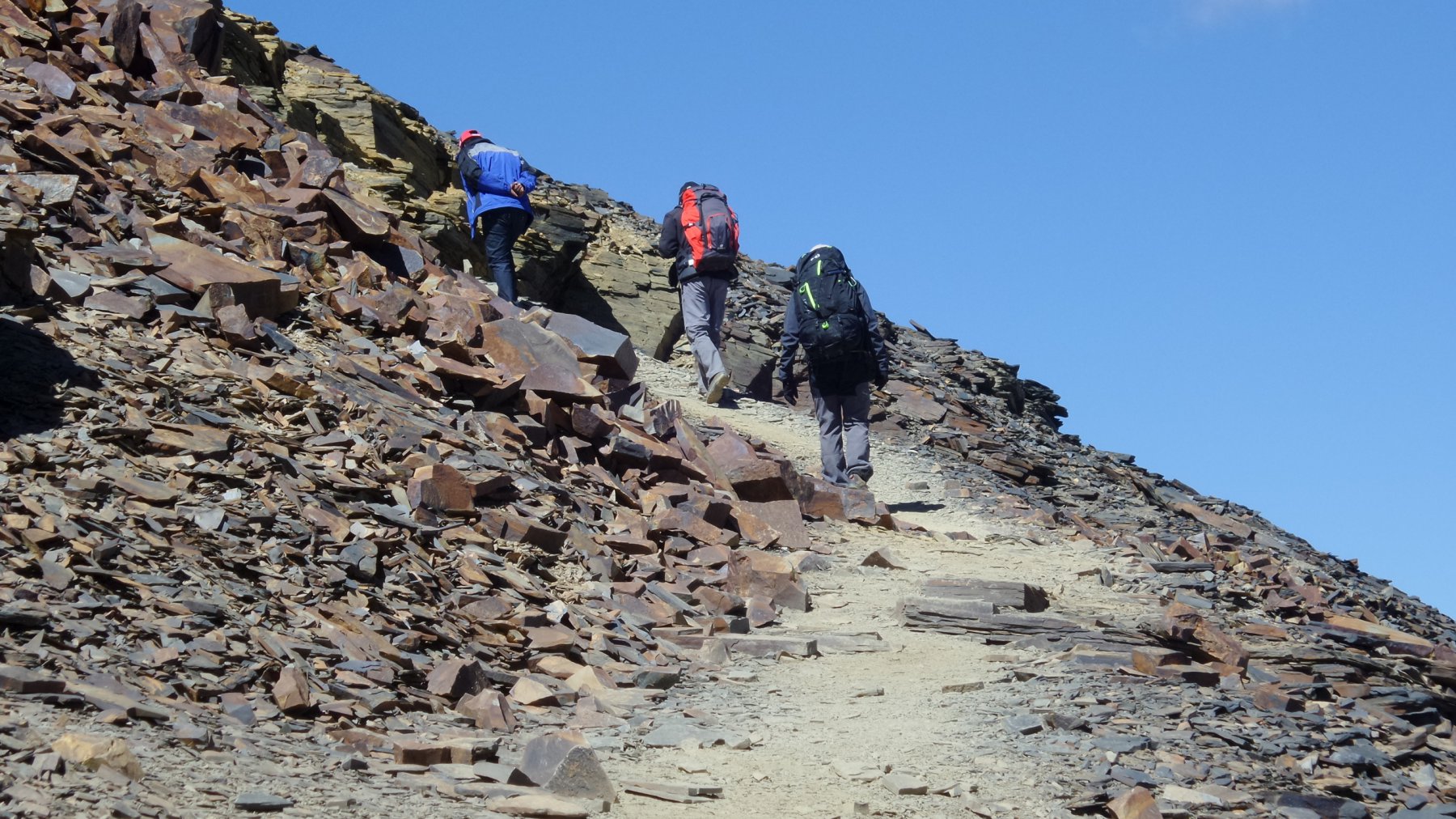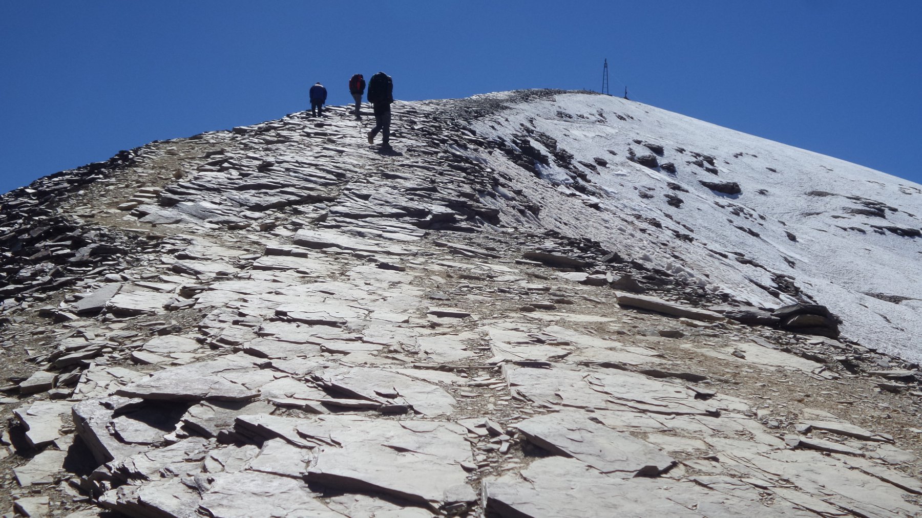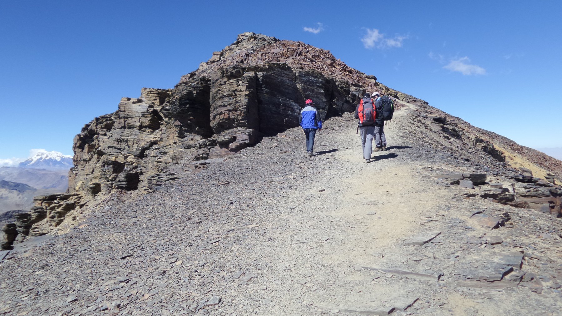 Dal parcheggio si segue il crestone in direzione di un’anticima su cui è presente il vecchio arrivo degli impianti, poco prima di raggiungerlo, si gira a sx su una tracciona evidente che porta fino alla cima rocciosa. Di qui si può scendere in direzione nord per qualche decina di metri e salire sul dosso nord (stazione di rilevamento) per vedere meglio il Huayna Potosí.