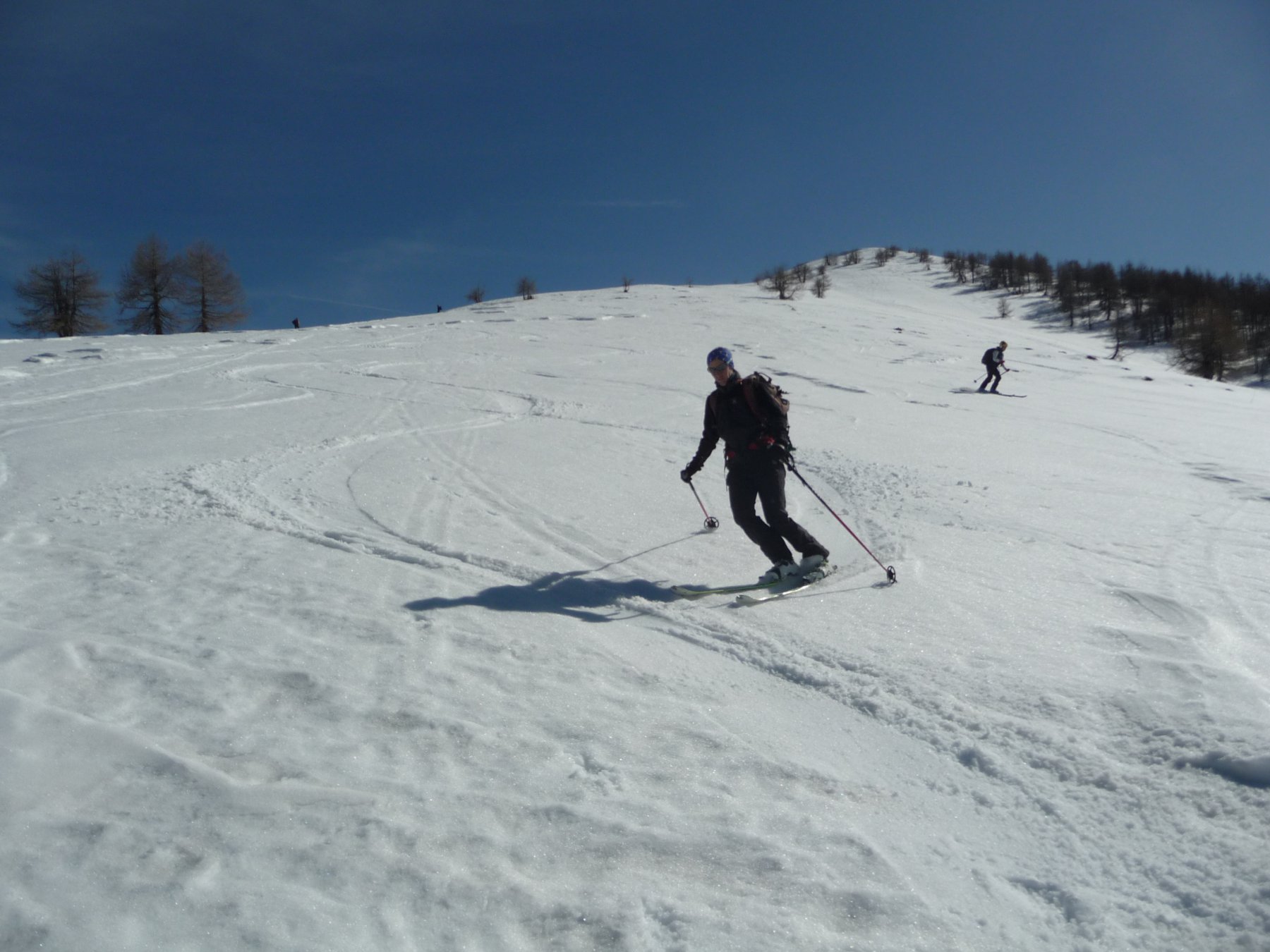 In arrivo dalla Peyrefique vista la bella neve ci scappa il ripello a circa quota 1800. Nel bosco la neve non è ancora completamente trasformata bisogna trovare le parti che prendono più sole. In cresta qualche accumulo di neve più recente si alterna a tratti di neve vecchia. Bella discesa su crosta portante e non nella parte alta e poi di nuovo bella primaverile nel vallone di Caramagne.