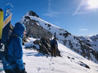 Parete un po’ magra, ma tutta collegata. Purtroppo non si parte dalla vetta ma dal colletto scendendo sulla cresta a sinistra. Neve polverosa riportata dal vento nella parte alta, polverosa densa da metà in giù. C’è solo un tratto, dove si traversa a destra per entrare nel canalone centrale, dove ci sono un po’ di pietre. Poi belle curve fino a fine parete.