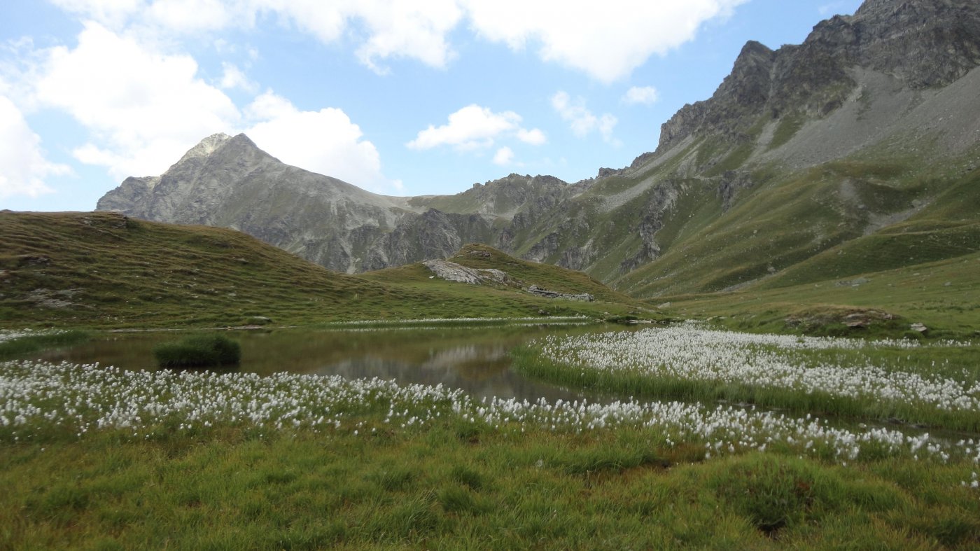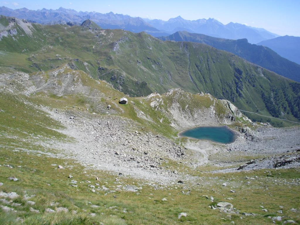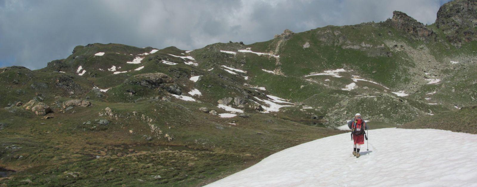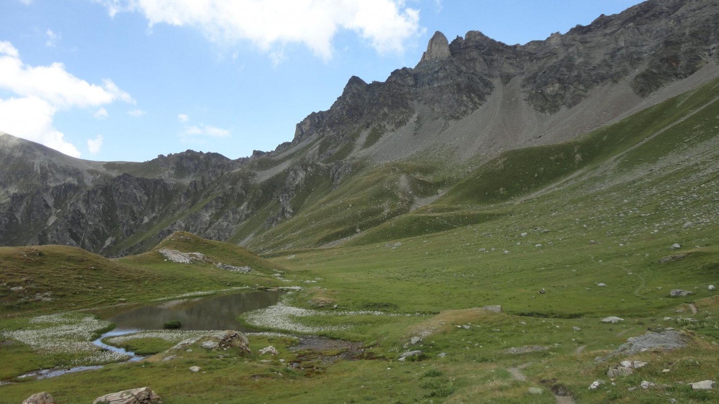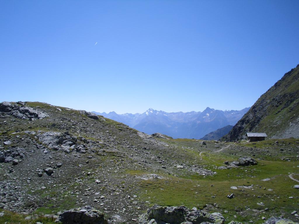 Rientro: ripercorrere il sentiero fatto fino allo stagno, poi salire al col Chaleby (m. 2683); al colle spuntano Cervino, Cian, Monte Rosa.