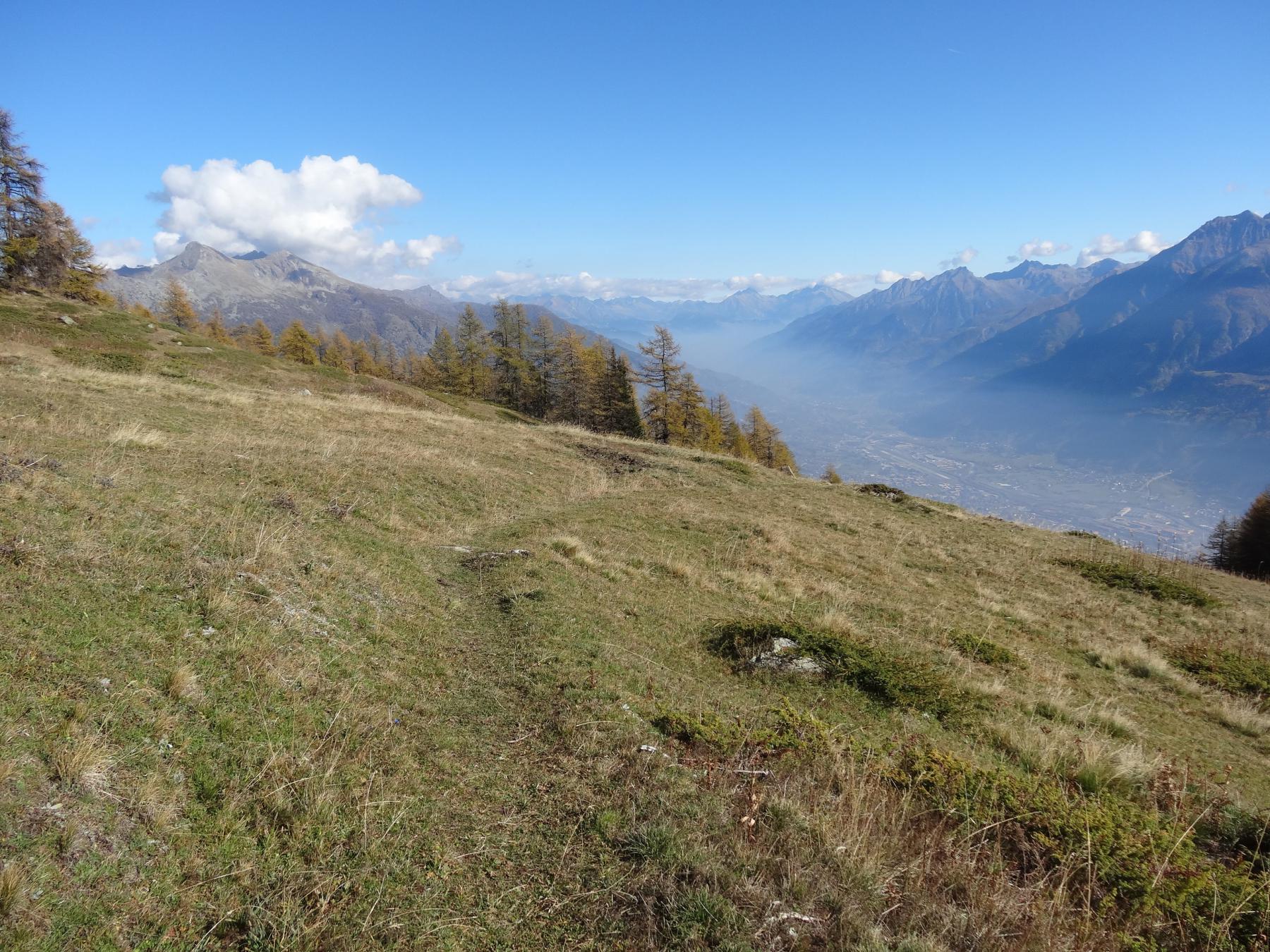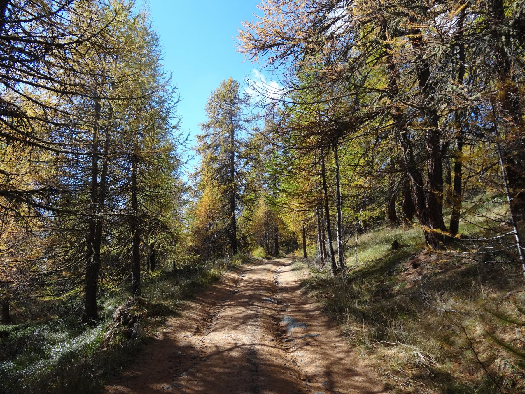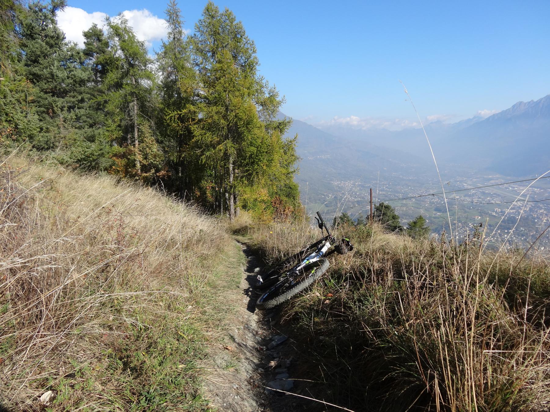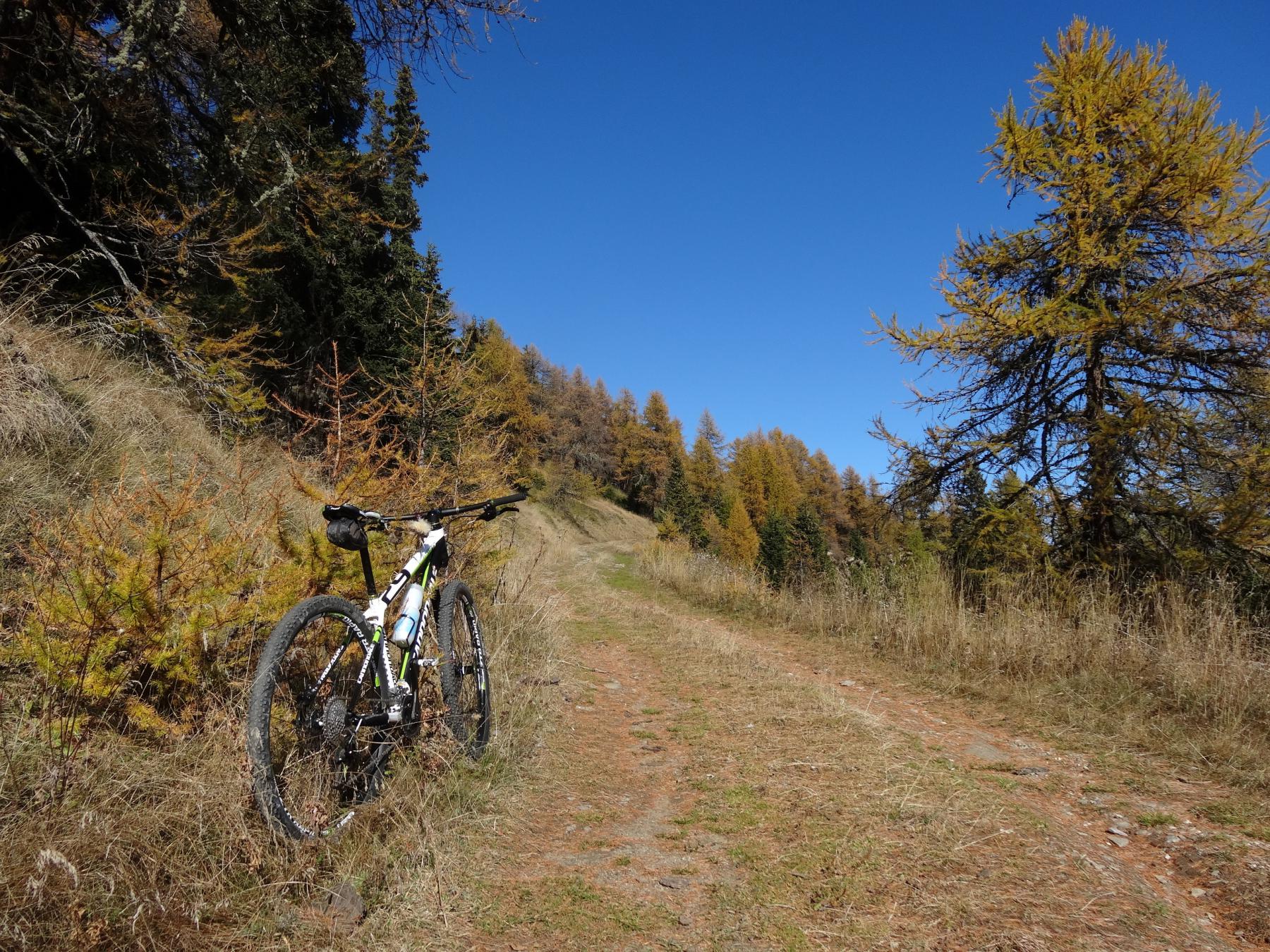 Discesa stupenda!! Il sentiero 1A che scende dalla Tza di Metz(l’ultima stalla) sembra fatto per le bici. Partito da Arpuilles, si sale agevolmente, prima per asfalto, circa 3 km, e poi su bella e panoramica sterrata, altri 11 km. Da quota 1900 circa la strada entra nel bosco e si sale su un tappeto di aghi di pino!Come detto la discesa del sentiero 1A è splendida. Si fatica solo all’inizio, per trovare le traccie del sentiero, poi, a metà del prato sotto alla Tza di Metz, il sentiero diventa più evidente. C’è di tutto, parte alta più scorrevole lungo il prato, poi parte un po più tecnica nel bosco, altra parte scorrevole nel bosco ed infine mulattiera lastricata di pietre molto divertente prima di arrivare ad Arpuilles. Bisogna prestare attenzione solo nell’ultima parte prima di Arpuilles in caso di terreno umido, e per tutto il sentiero di discesa, avere una bici con buoni freni.