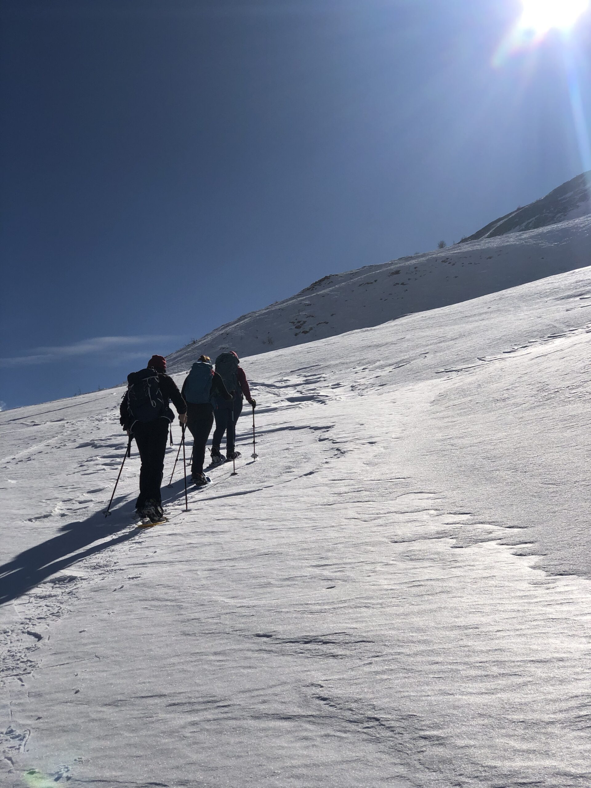Da Buthier si segue il la strada che sale al rifugio Chaligne comunque tagliando per prati.Al rifugio si giunge in circa un’ora.da dietro il rifugio parte la traccia che sale verso gli alpeggi Chaligne 2000mt.Giunti in vista degli alpeggi si prosegue verso sx puntando la sella tra la Pointe de Met e la Chaligne tenendosi a debita distanza dai pendii discendente da quest’ultima. Appena possibile in base alle condizioni si guadagna la dorsale superando un ripido ma abbastanza breve pendio che porta in cima.