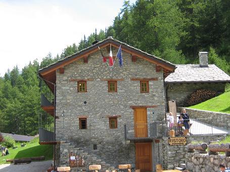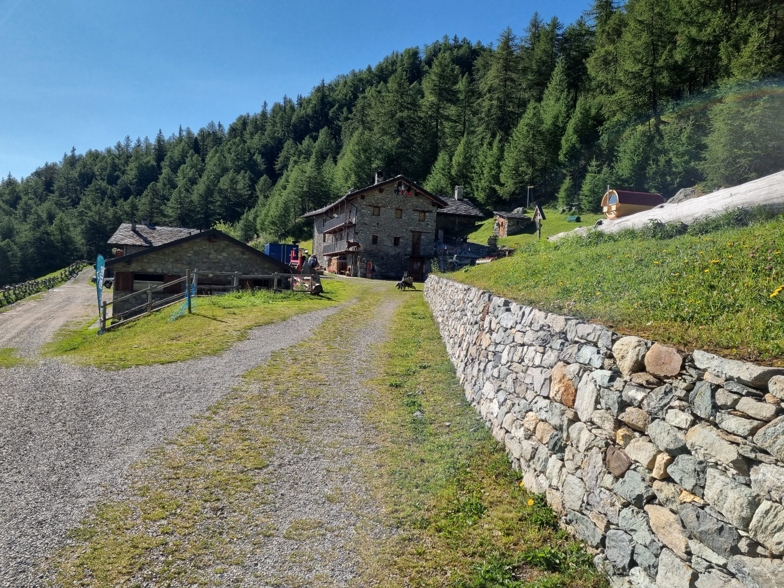 Si continua al di sopra della vasca, spostandosi verso ovest lungo il bel sentiero che attraversa un fresco bosco di larici alternato a radure pascolive. Si arriva agli alpeggi diroccati di Meriau damon 1740 m che si lasciano a destra per continuare sull’evidente sentiero nel fitto bosco per poi giungere all’Alpe Collet 1929 m, da dove si gode già di un bel panorama verso la Valle del Gran San Bernardo.