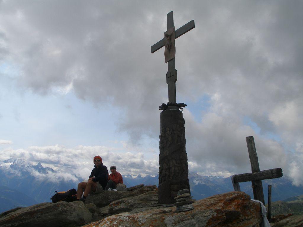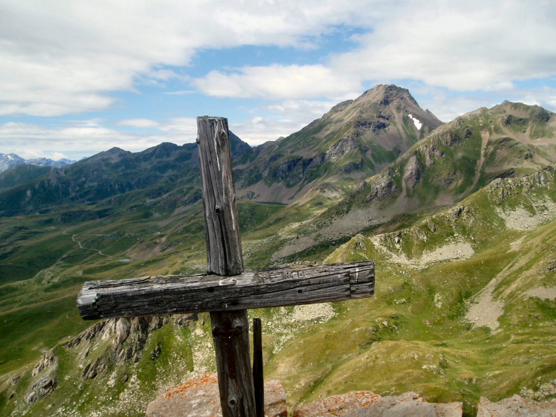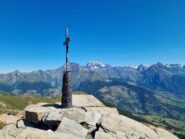 In vista della croce si supera un semplice gradino roccioso, aggirabile sulla sinistra, e si arriva sulla panoramica vetta della Chaligne.