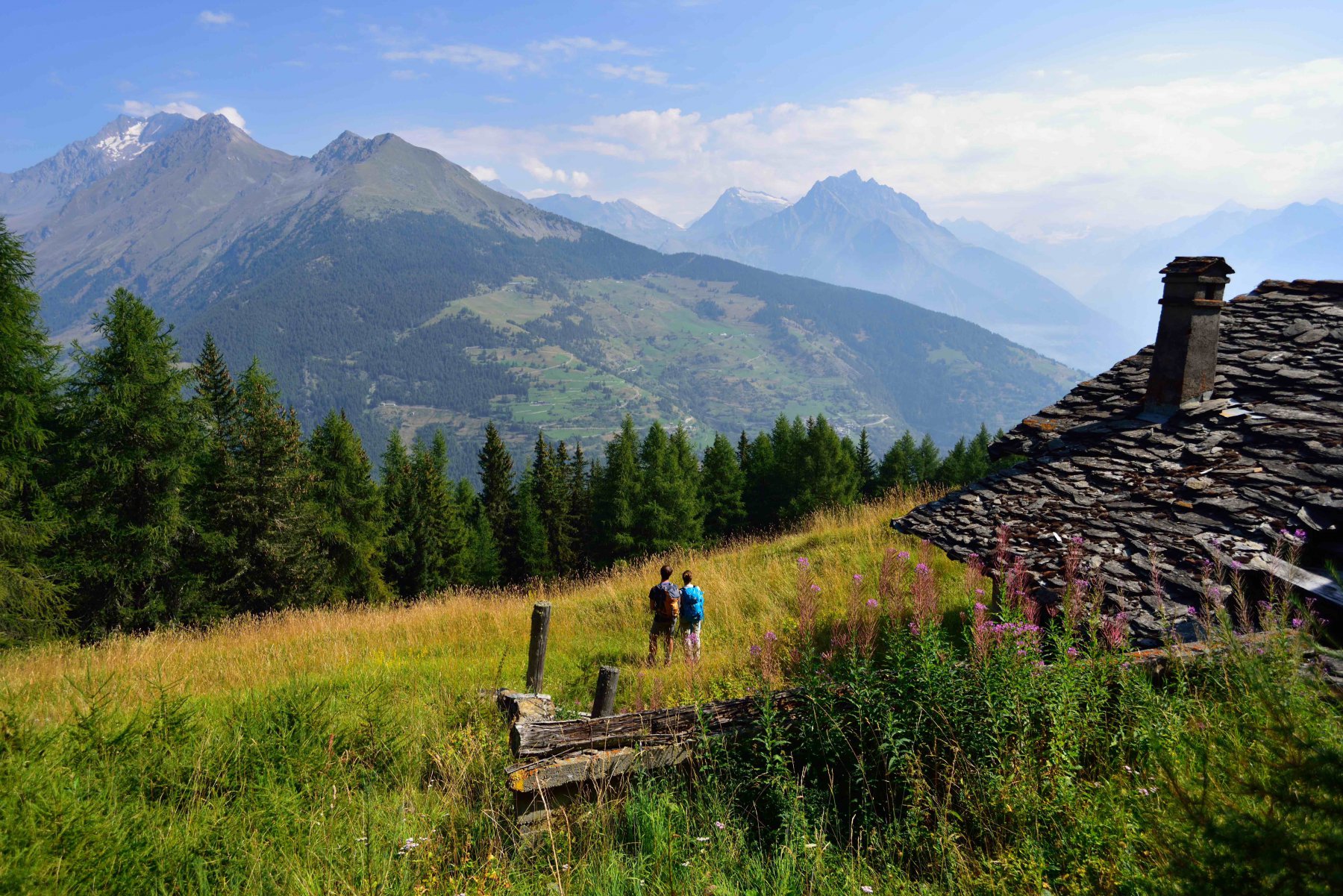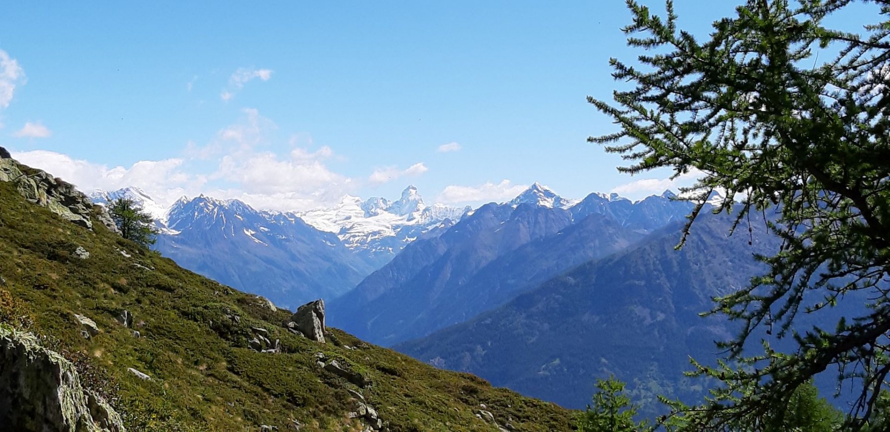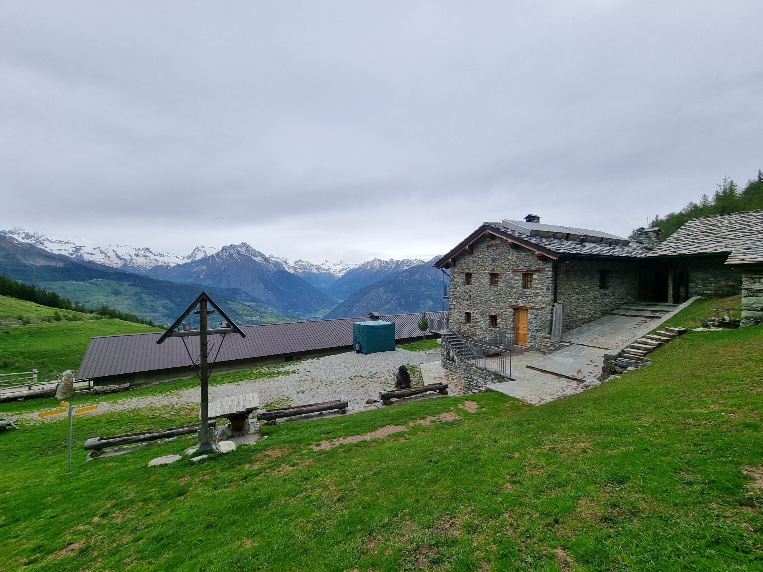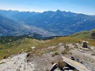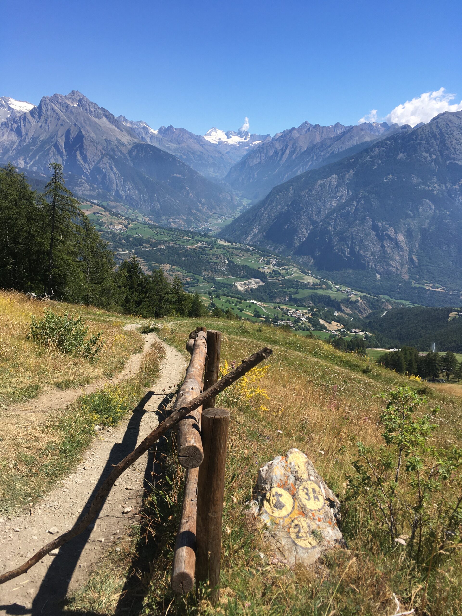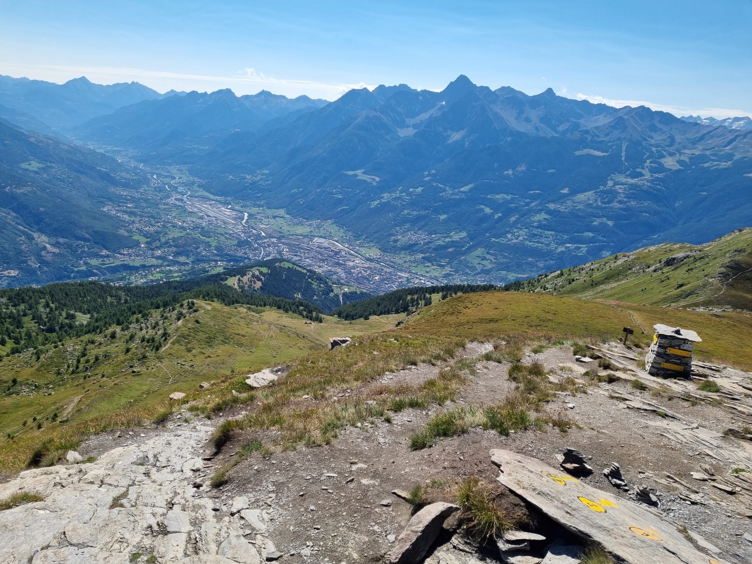 Il percorso, sempre in salita mai ripida, diventa ancora più panoramico, da un lato si ha la conca di Aosta con il Mont Emilius, dall’altro le montagne della Valdigne, il Mont Fallère in primo piano fino al lontano Monte Bianco e i ghiacciai del Rutor.