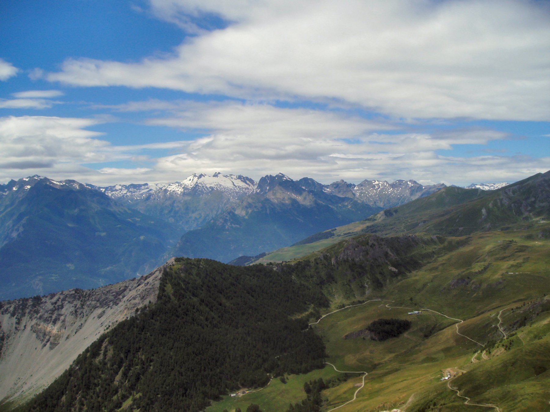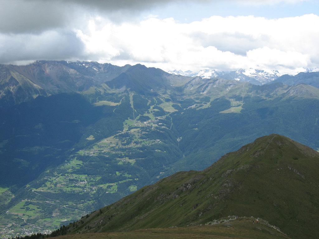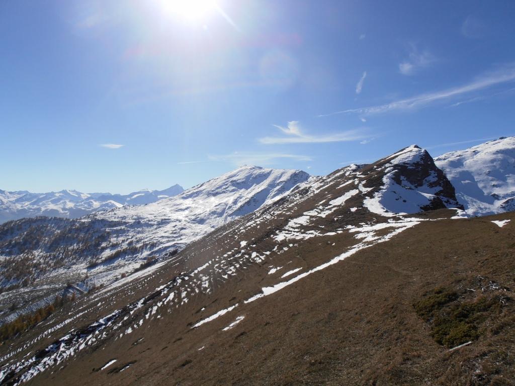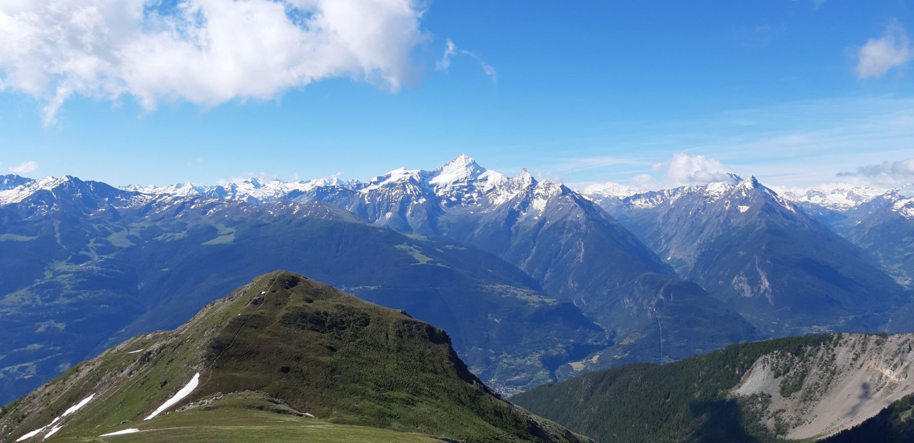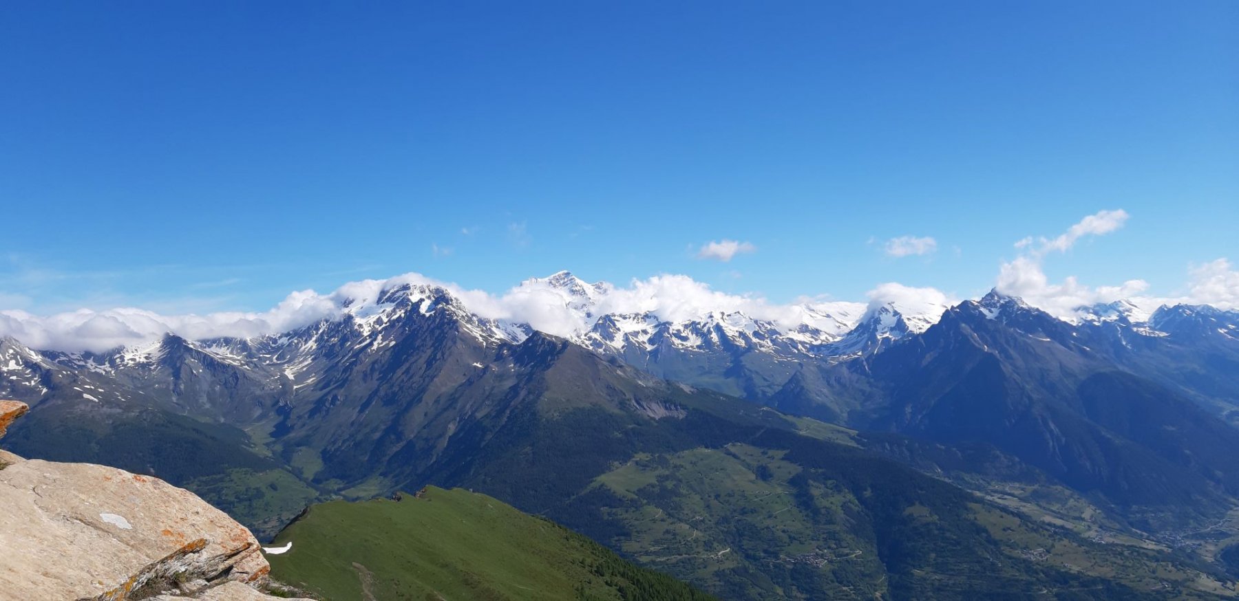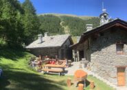 Il percorso, sempre in salita mai ripida, diventa ancora più panoramico, da un lato si ha la conca di Aosta con il Mont Emilius, dall’altro le montagne della Valdigne, il Mont Fallère in primo piano fino al lontano Monte Bianco e i ghiacciai del Rutor.
