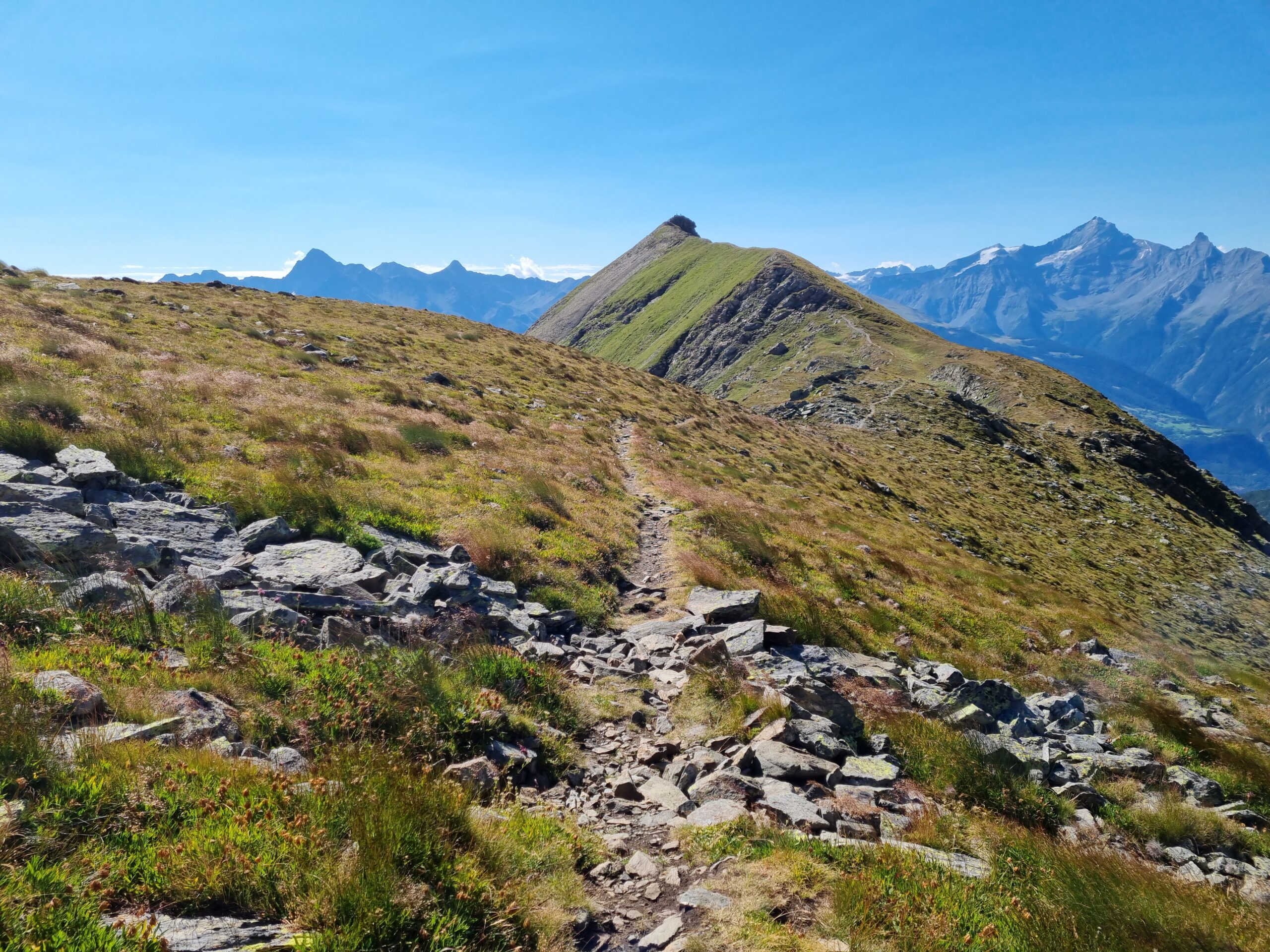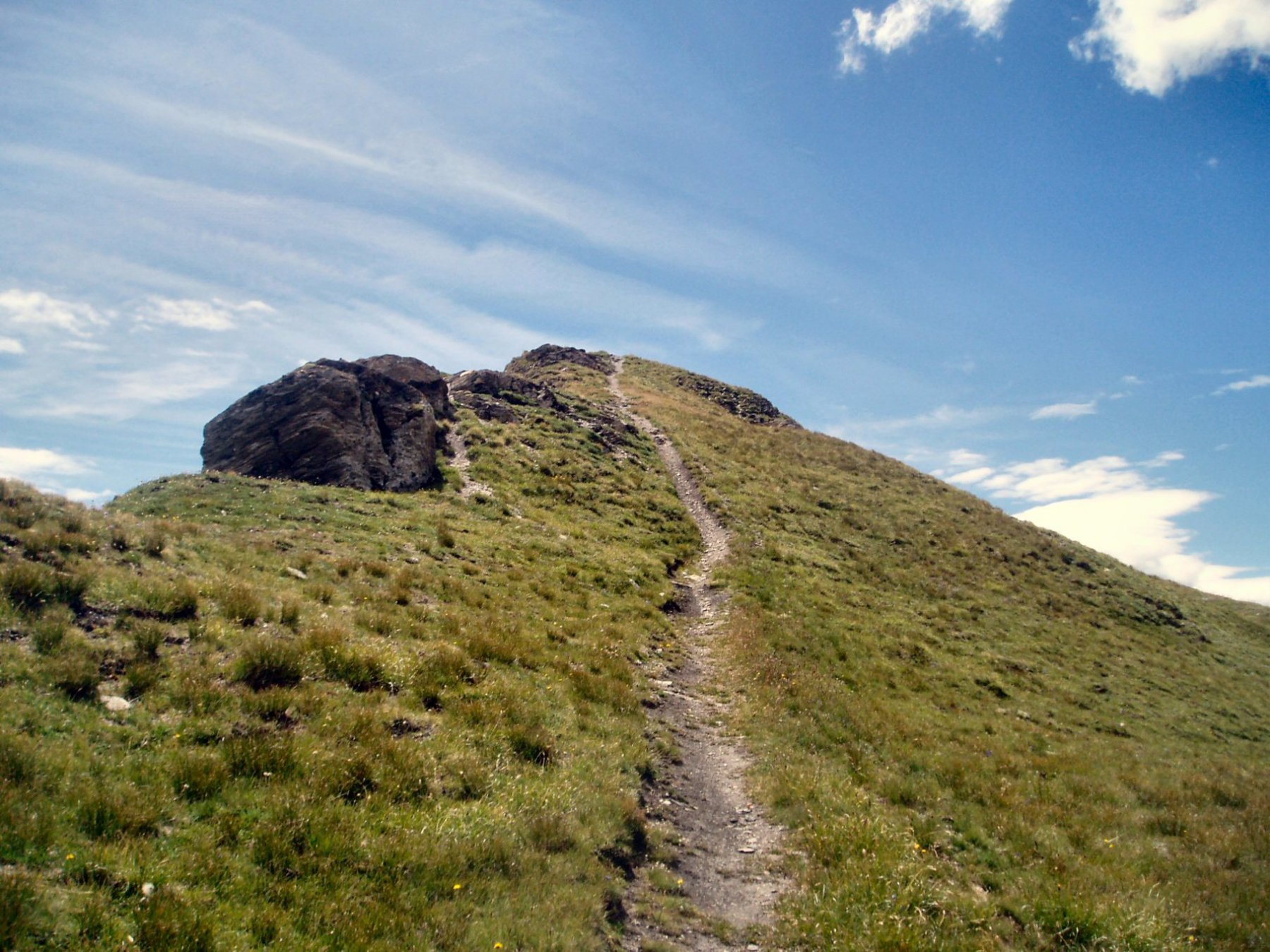 Affrontato un breve tratto di pietraia e sentiero più smosso, si arriva ad una sella erbosa a 2500 m, proprio ai piedi del tratto conclusivo della dorsale.