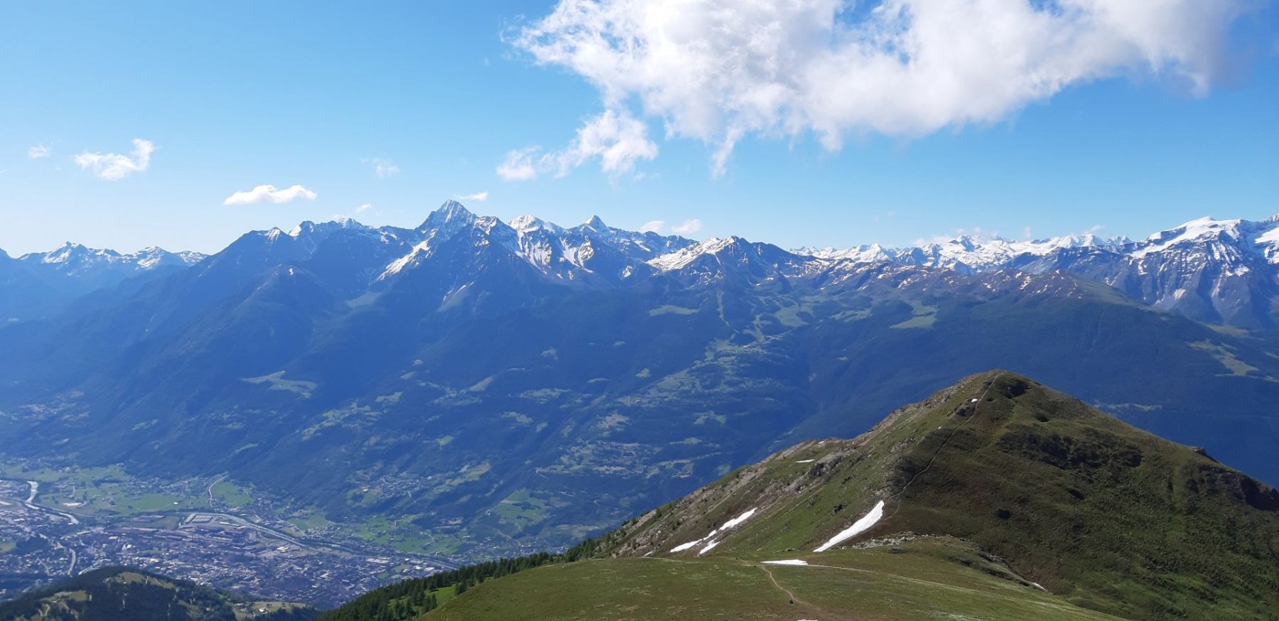 Oltrepassato il ripetitore il sentiero diventa molto più comodo e panoramico, percorre la lunga Costa Tardiva leggermente sul versante di Gignod, tra ampi prati.