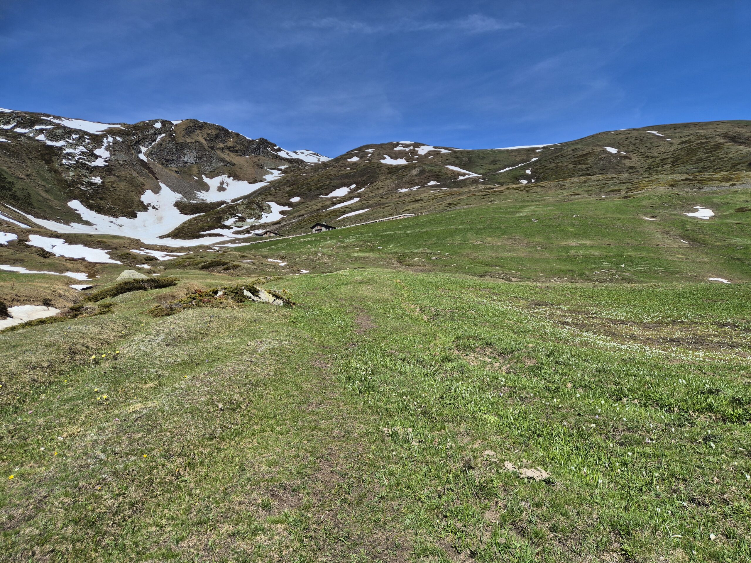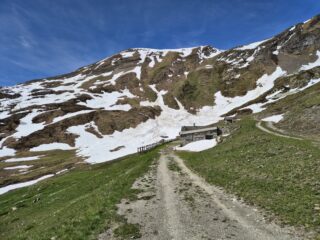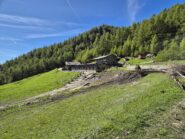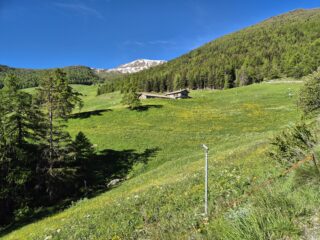 Le pendenze del sentiero diventano leggermente più ripide, e si incrocerà in più occasioni la pista sterrata, finchè si fuoriesce definitivamente dal bosco a quota 1850 m circa, in corrispondenza di un vasto prato dal quale il rifugio è già visibile e non più distante.