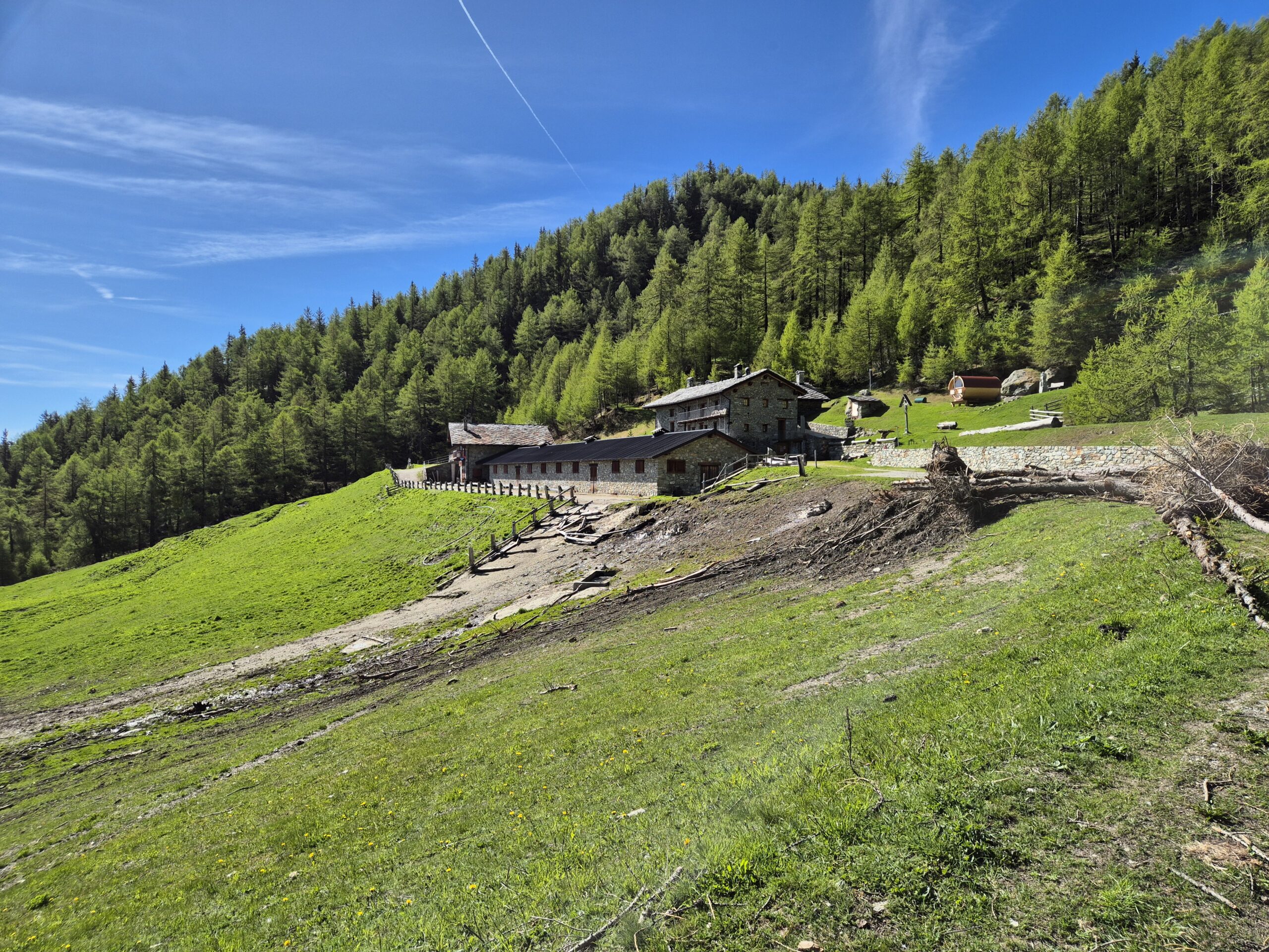 Si percorre la strada, con alcuni brevi tratti asfaltati, per alcune decine di metri fino ad incontrare sulla destra uno steccato in legno al di sopra del quale prosegue il sentiero, e da lì a poco si raggiunge l’Alpe Roncaille 1664 m, dove si ritrova la sterrata.