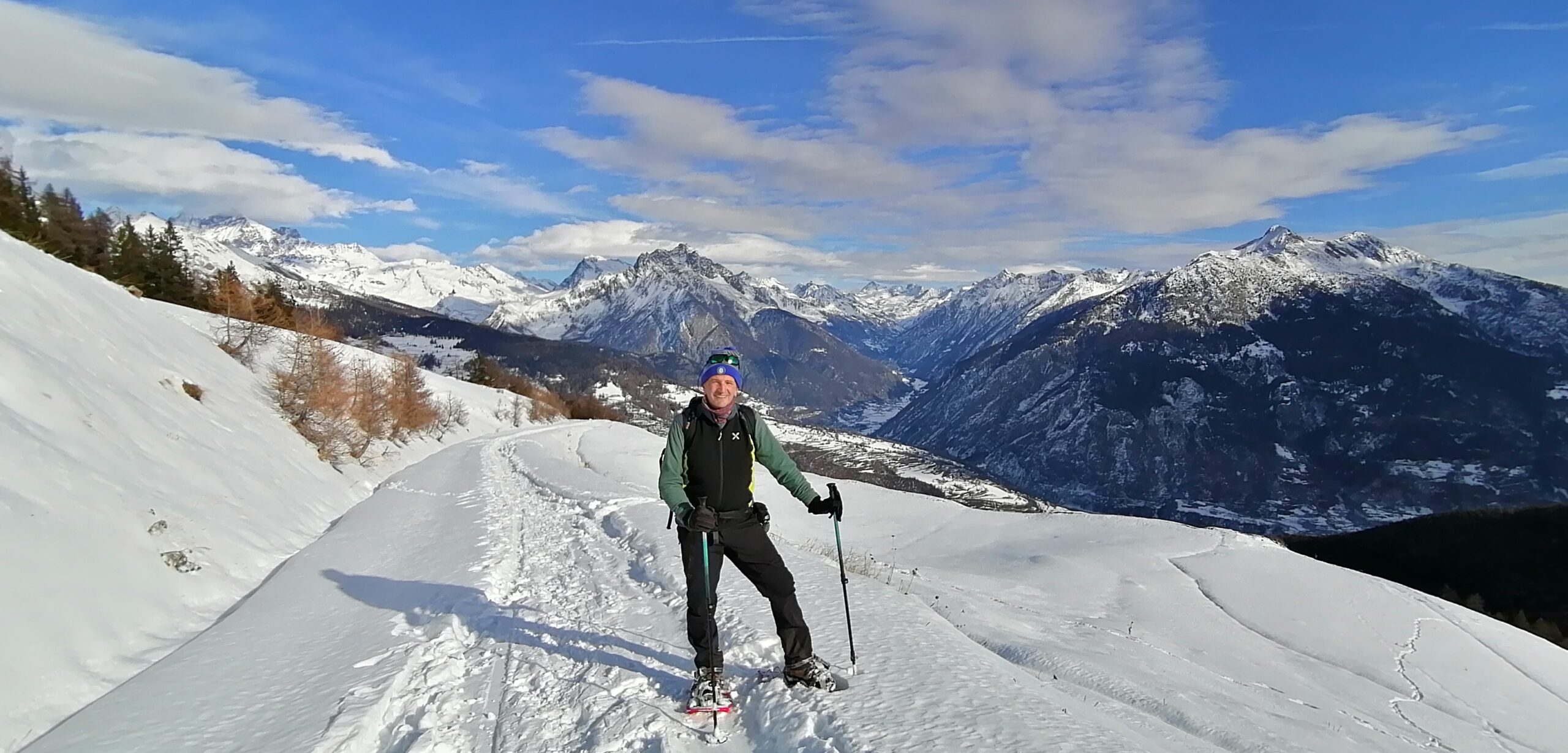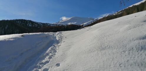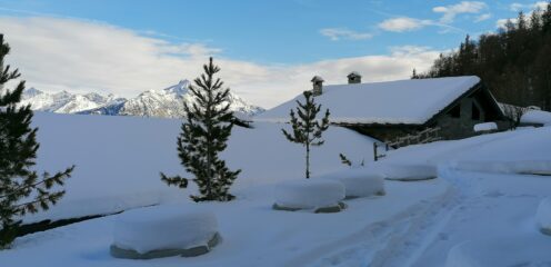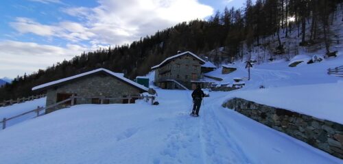 Facile ciaspolata fino al Rifugio. Pista ben battuta ma saliti con le ciaspole, al di fuori della traccia si sprofonda. Giornata variabile con qualche nuvola, non fredda. In compagnia di Giovanni.