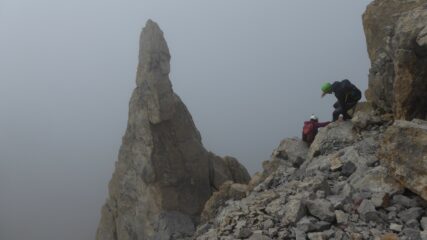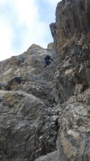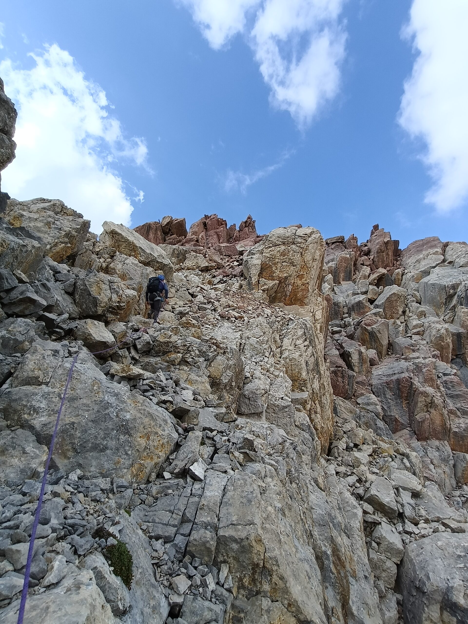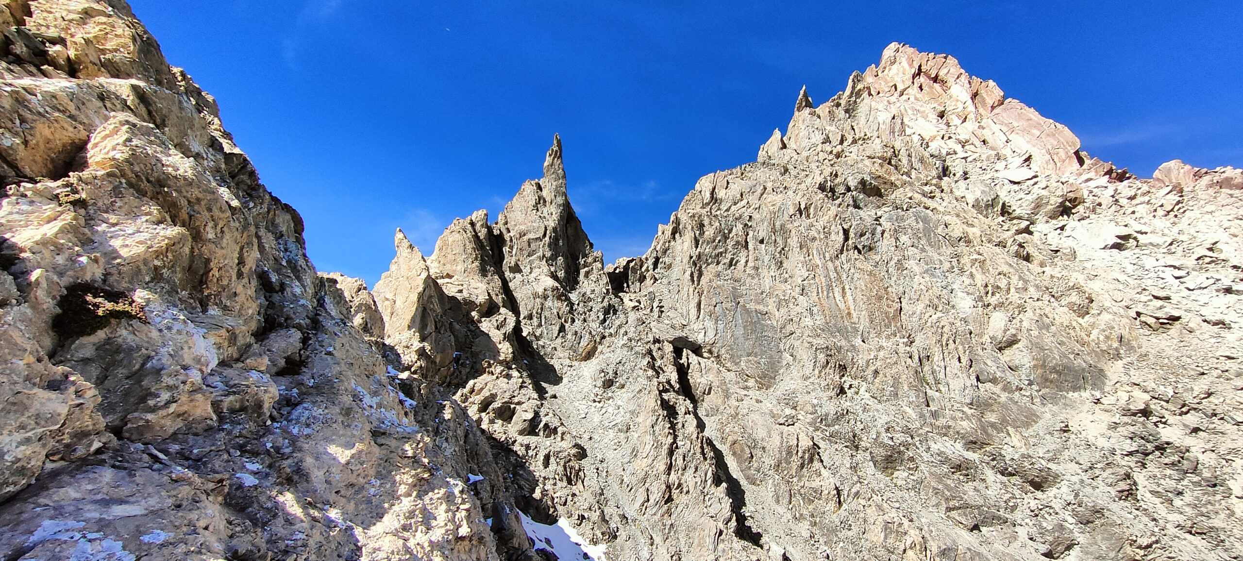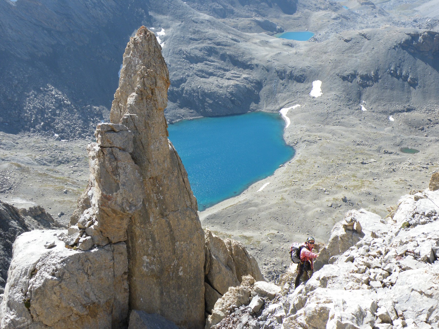Dalla forcella si sale in obliquo a sinistra sulle rocce ripide ma articolate del versante sud (II) e, in breve, si guadagna nuovamente il filo di cresta. Traversando orizzontalmente per cengette sul versante nord, si arriva ad un intaglio che si apre tra spuntoni nerastri. Si ritorna quindi sul versante meridionale per seguire una cengia detritica assai aerea, che, con qualche saliscendi (ometti), conduce sul bordo del pendio a forma d’imbuto che caratterizza la parte superiore del Couloir Gastaldi. Piegando a destra per lastroni e detriti (delicato), si raggiunge un secondo intaglio della cresta est. Da qui si traversa orizzontalmente a sinistra sotto la parete della Cima Est e, con una breve discesa su rocce inclinate che richiedono un po’ d’attenzione, si va a prendere una stretta cengia che passa sopra il grande imbuto nevoso (delicato). Si attraversa il Couloir Castaidi che qui è largo solo pochi metri (attenzione in presenza di neve), poi si sale in obliquo a sinistra per un poco marcato canale di rocce scagliose (II). Si continua a sinistra per rocce più facili verso un caratteristico gendarme appuntito, quindi si piega a destra per aggirare il gendarme. Salendo per cengette e canalini, si arriva nella zona di rocce rotte sotto le balze finali. Con un’ultima arrampicata per massi e gradoni di ottima roccia (II) si guadagna la vetta, costituita da un masso squadrato, con infissa la croce (4h).