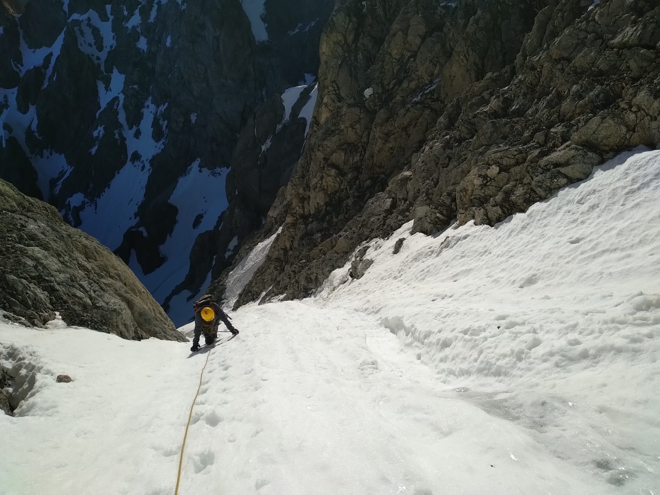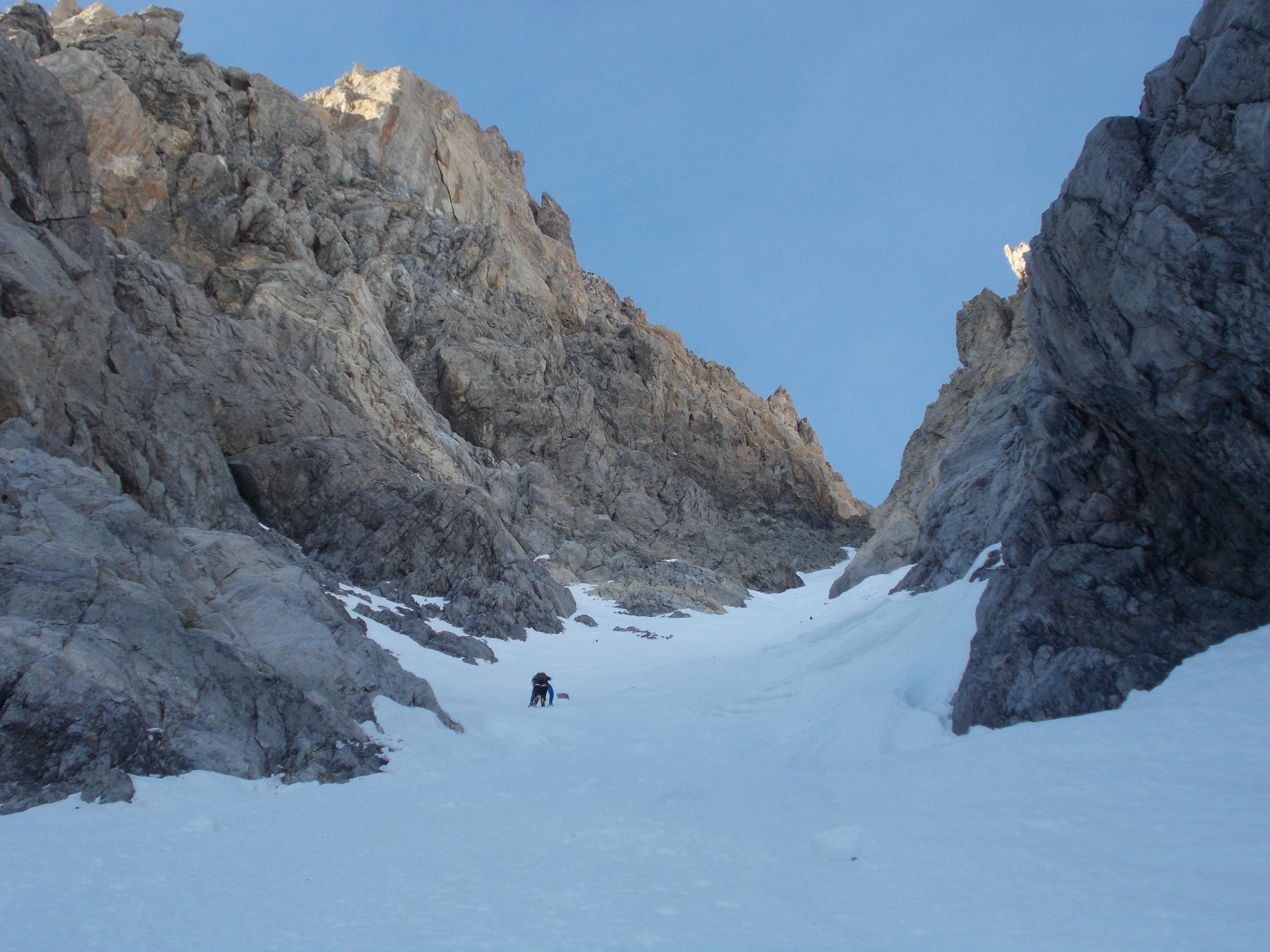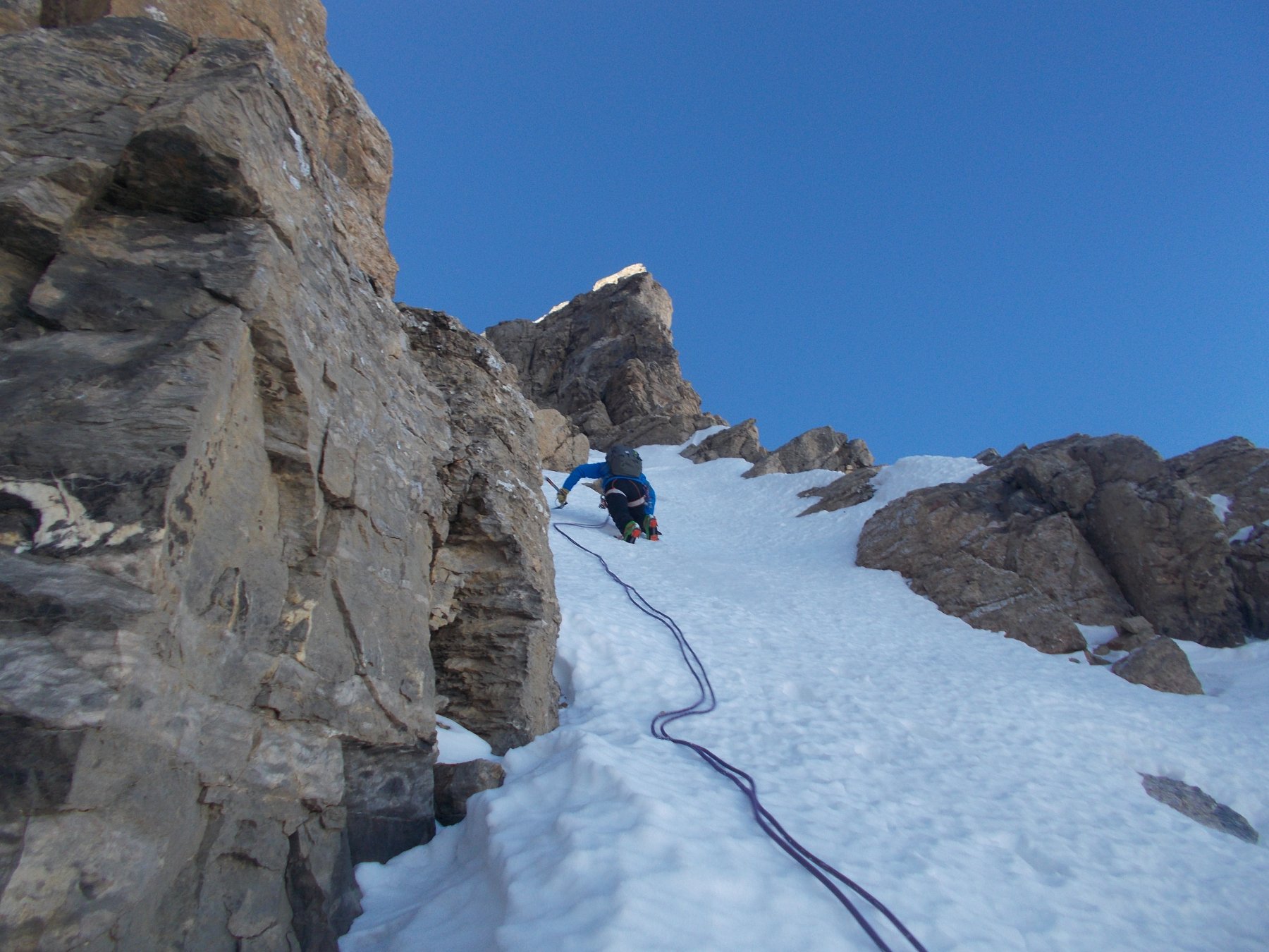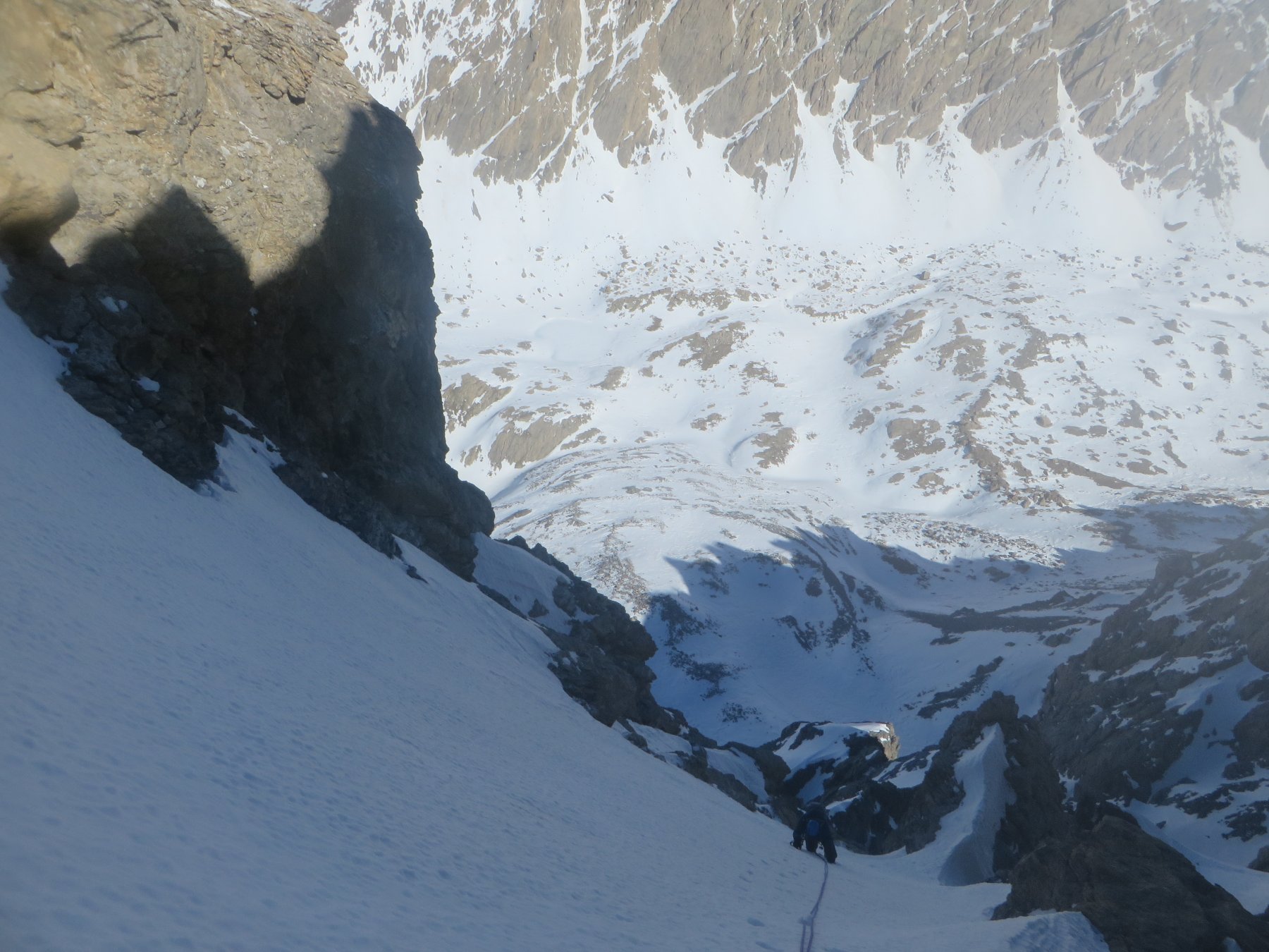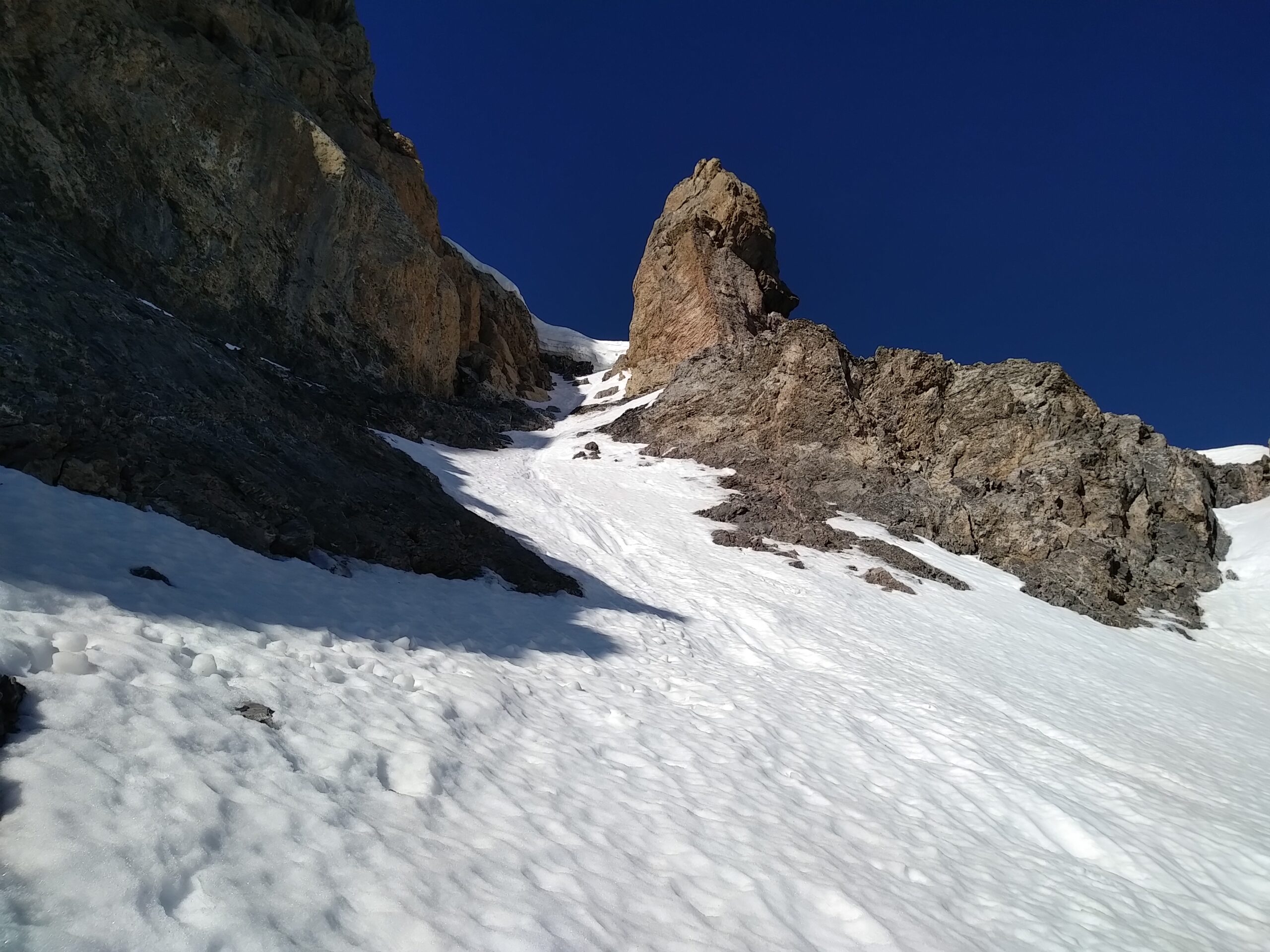 Risalire il canale, prestando molta attenzione alla caduta di pietre frequente dal ramo sin del canale. Imboccare alla biforcazione a destra il Canale Nord su pendenza sui 45° sino ad una prima strozzatura. Superata la pendenza del pendio aumenta intorno ai 50° continui per circa 80 m. Si raggiunge un piano inclinato: a questo punto il canale si biforca in due rami. La via classica traversa a sinistra sino ad un isolotto roccioso, si prosegue in un canalino con spesso ghiaccio vivo da cui si esce in cresta. In caso di scarso innevamento è possibile proseguire diritti, traversare un imbuto di neve e risalire il pendio per una goulotte di ghiaccio e roccette. Con alcuni passaggi di misto si perviene in cresta. In entrambi i casi prestare attenzione alla cornice sommitale.