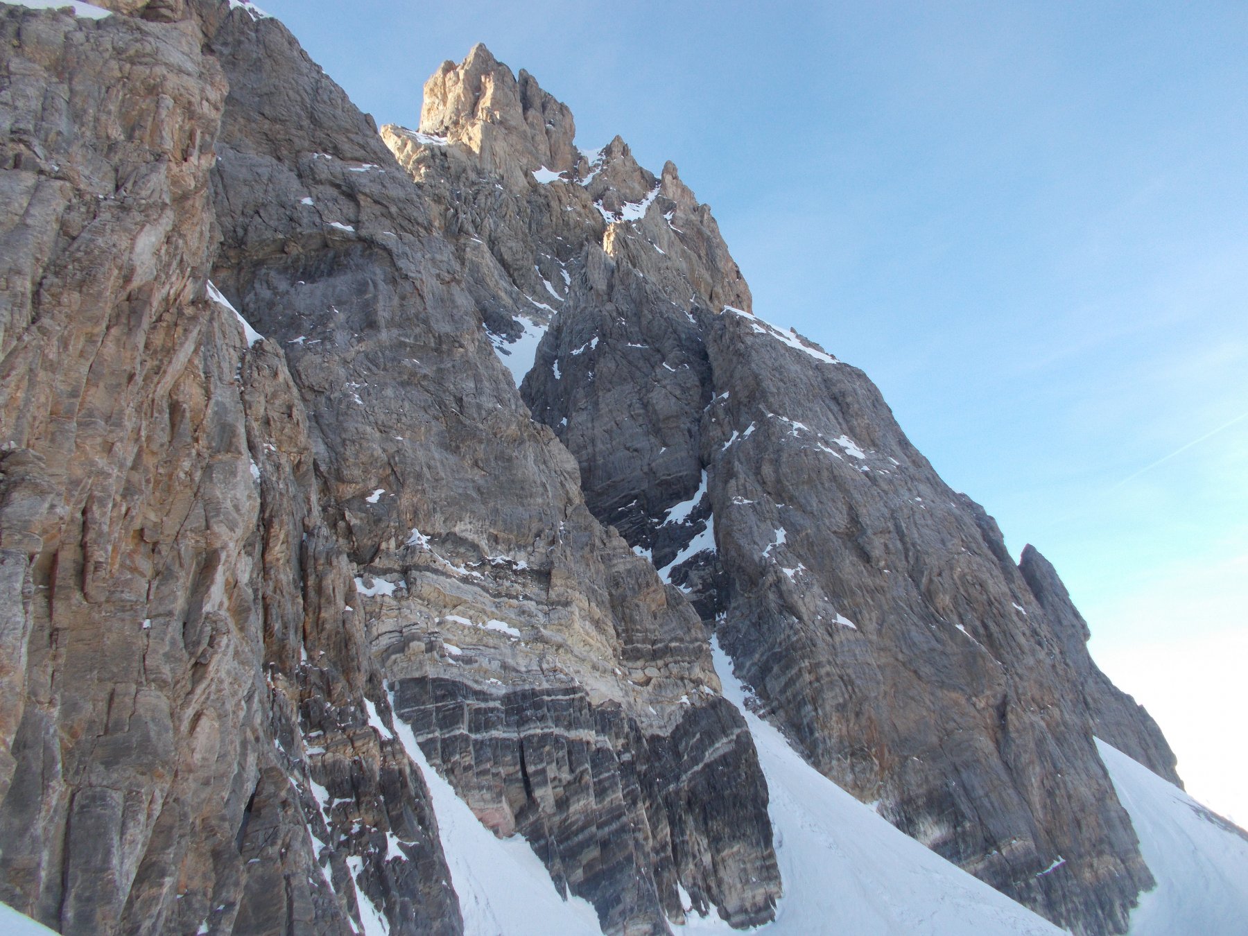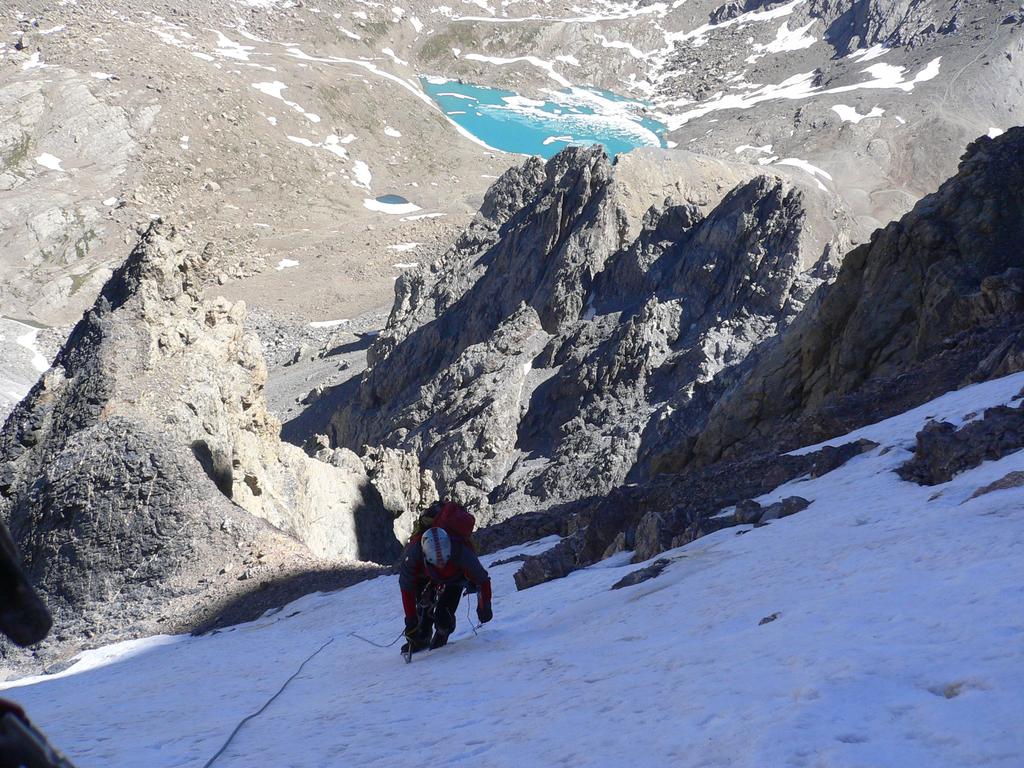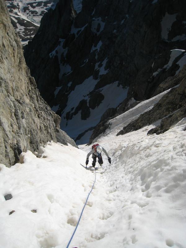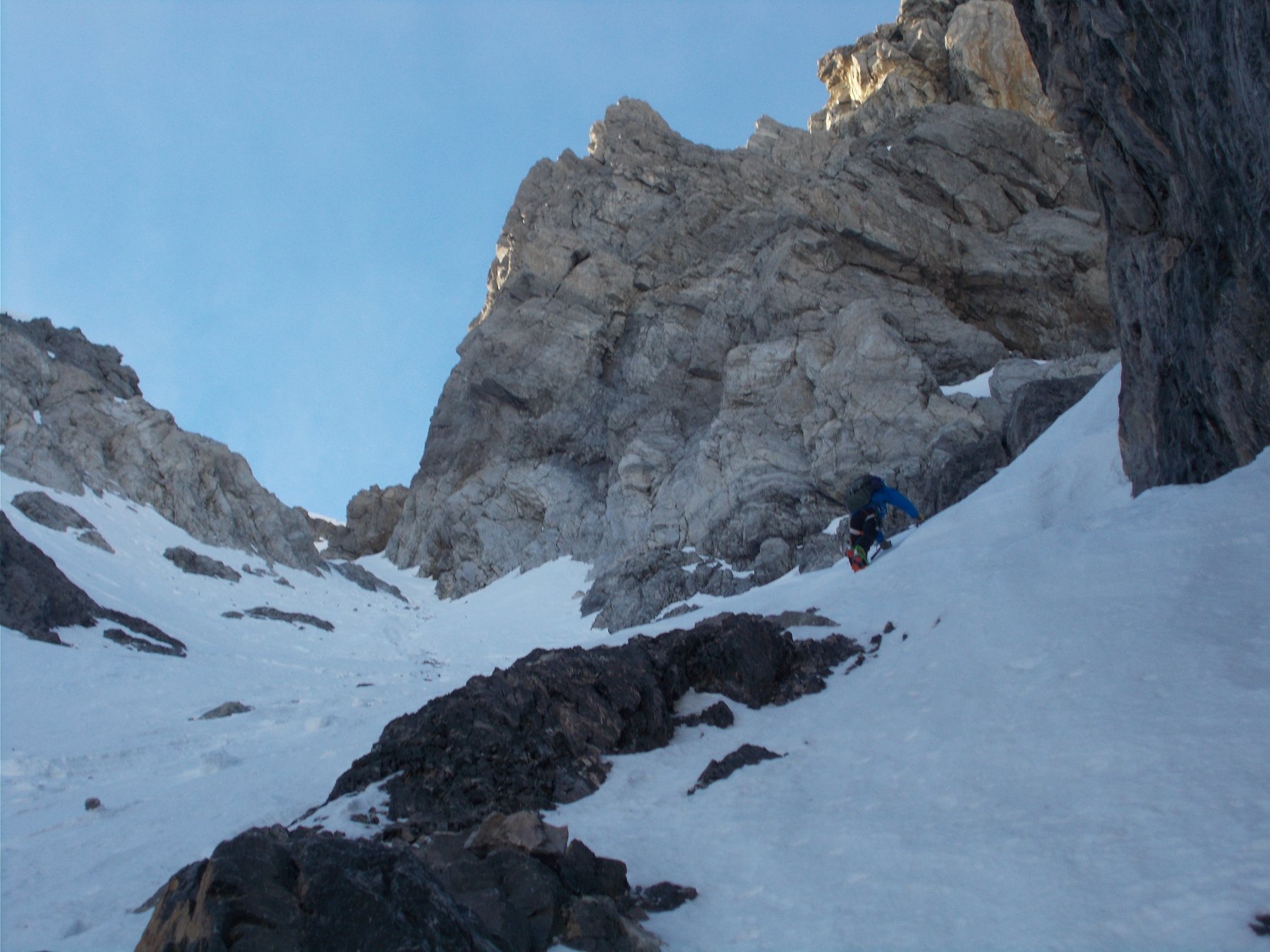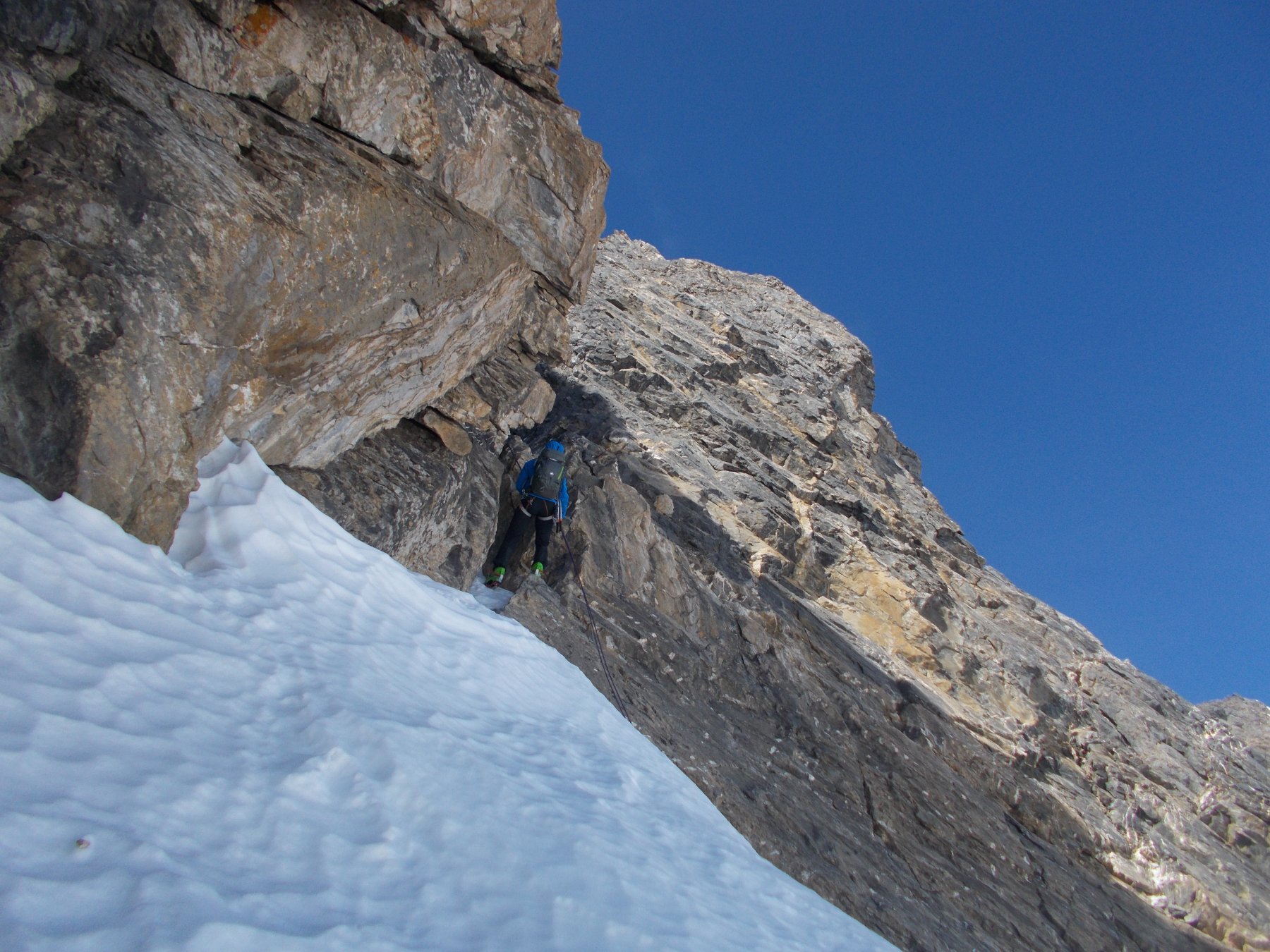 Risalire il canale, prestando molta attenzione alla caduta di pietre frequente dal ramo sin del canale. Imboccare alla biforcazione a destra il Canale Nord su pendenza sui 45° sino ad una prima strozzatura. Superata la pendenza del pendio aumenta intorno ai 50° continui per circa 80 m. Si raggiunge un piano inclinato: a questo punto il canale si biforca in due rami. La via classica traversa a sinistra sino ad un isolotto roccioso, si prosegue in un canalino con spesso ghiaccio vivo da cui si esce in cresta. In caso di scarso innevamento è possibile proseguire diritti, traversare un imbuto di neve e risalire il pendio per una goulotte di ghiaccio e roccette. Con alcuni passaggi di misto si perviene in cresta. In entrambi i casi prestare attenzione alla cornice sommitale.
