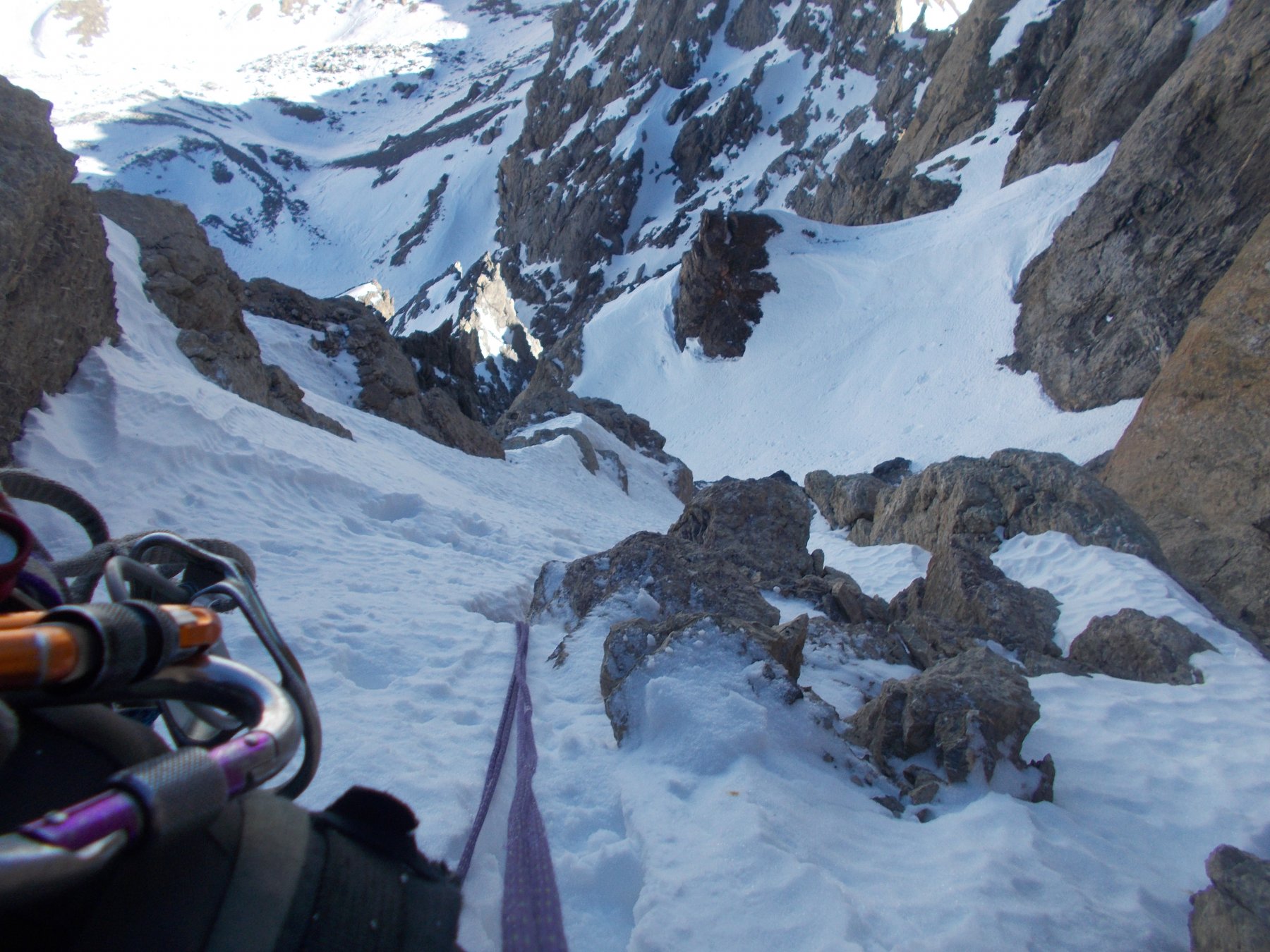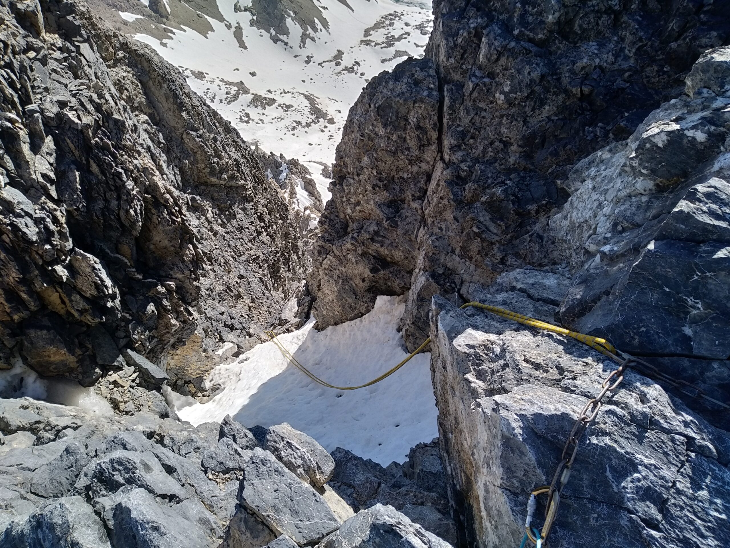 Discesa: dalla vetta si reperisce una calata su spit con catena con una doppia di circa 20 m sino alla seconda calata sempre su spit con cordino per circa altri 20 m. Qui si può scegliere se scendere verso sx lungo il canale Boujon (300 m 45°) che si ricollega all’itinerario di salita (sconsigliabile in caso di caduta pietre) oppure optare per l’alternativa più sicura (e logica visto che si deve tornare a Chiappera) che è quella di seguire la via normale lungo cenge e detriti seguendo gli evidenti ometti sino alla base della parete.