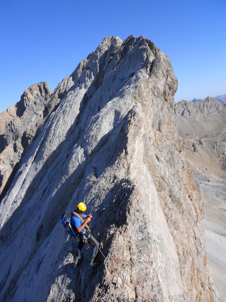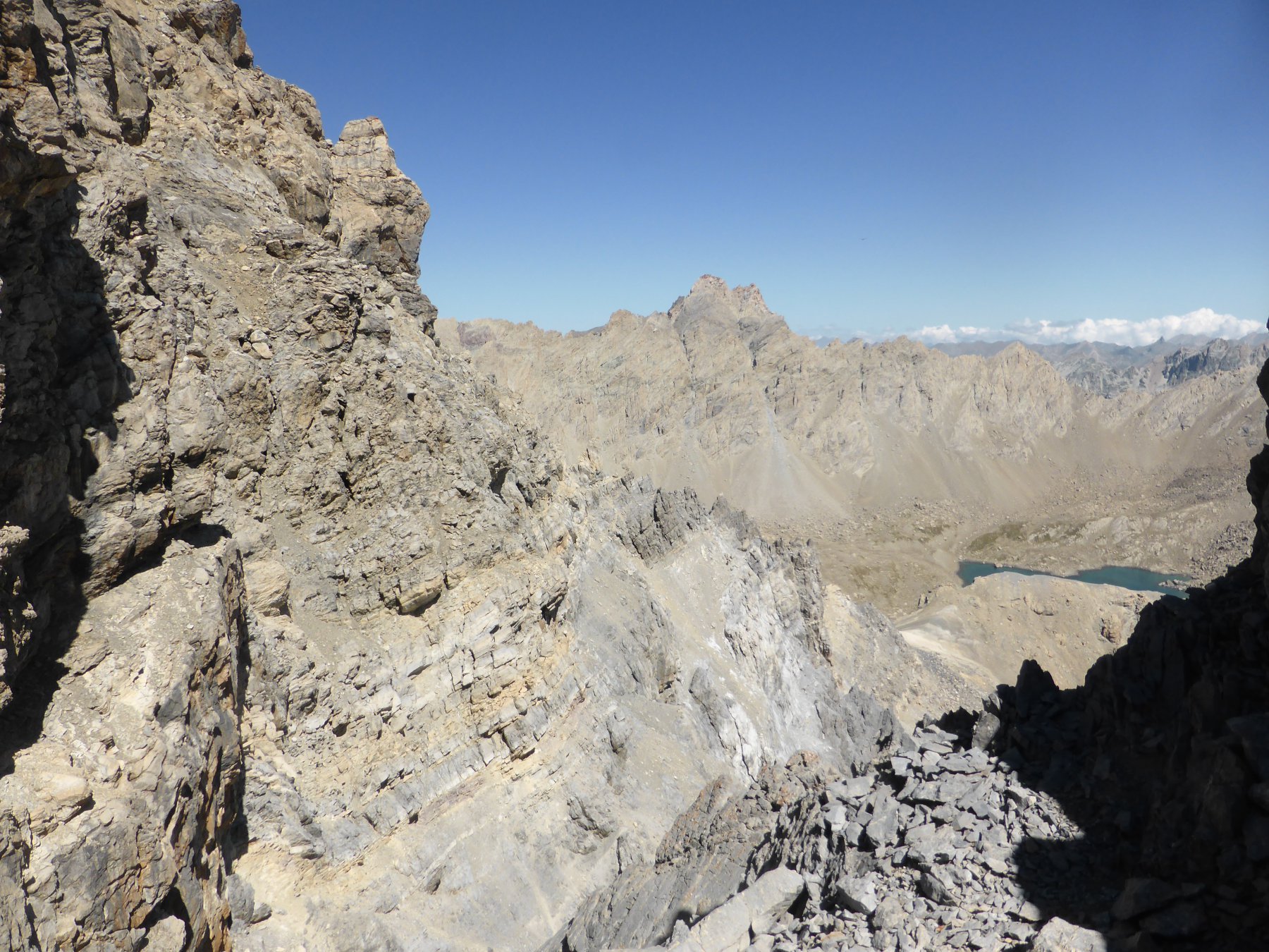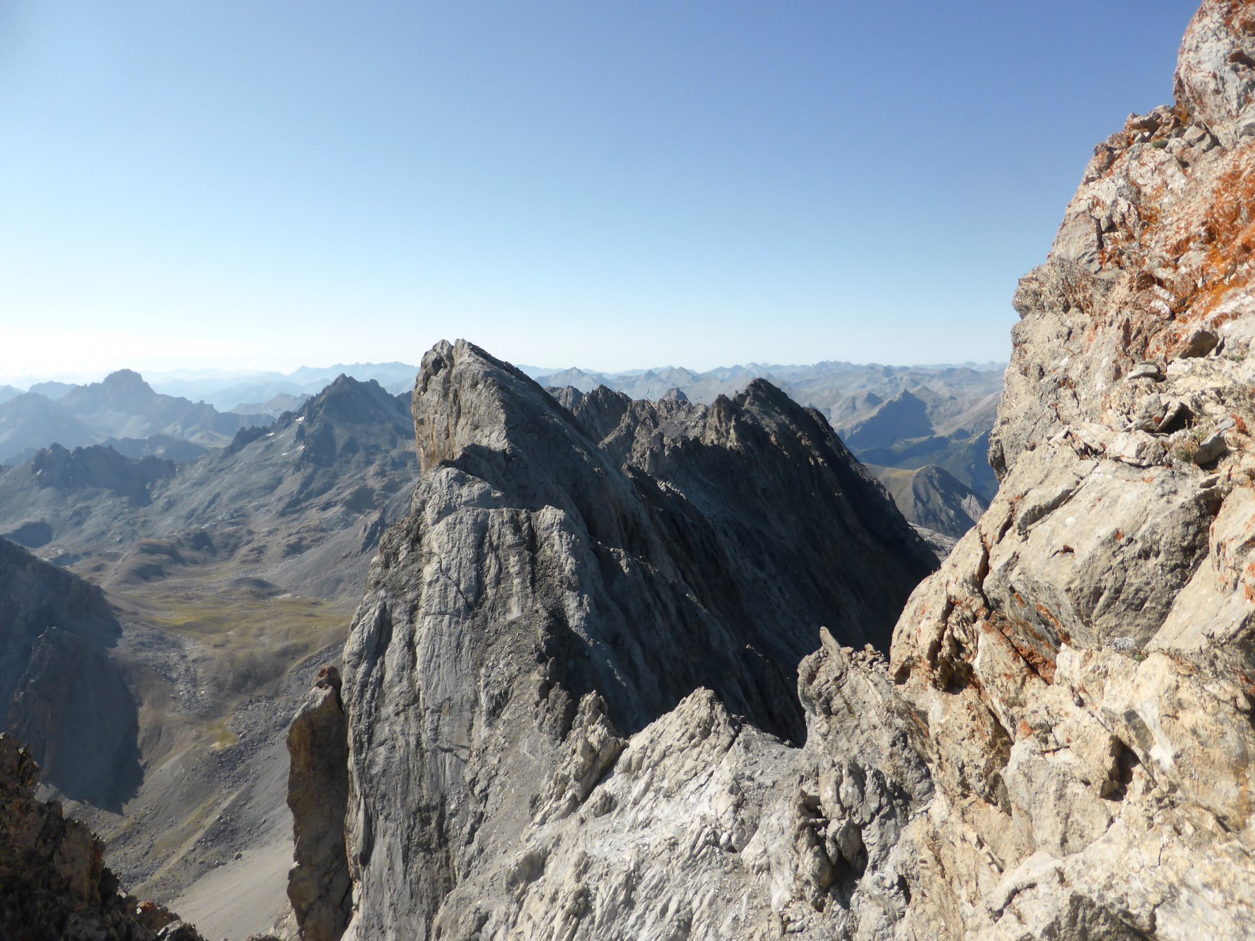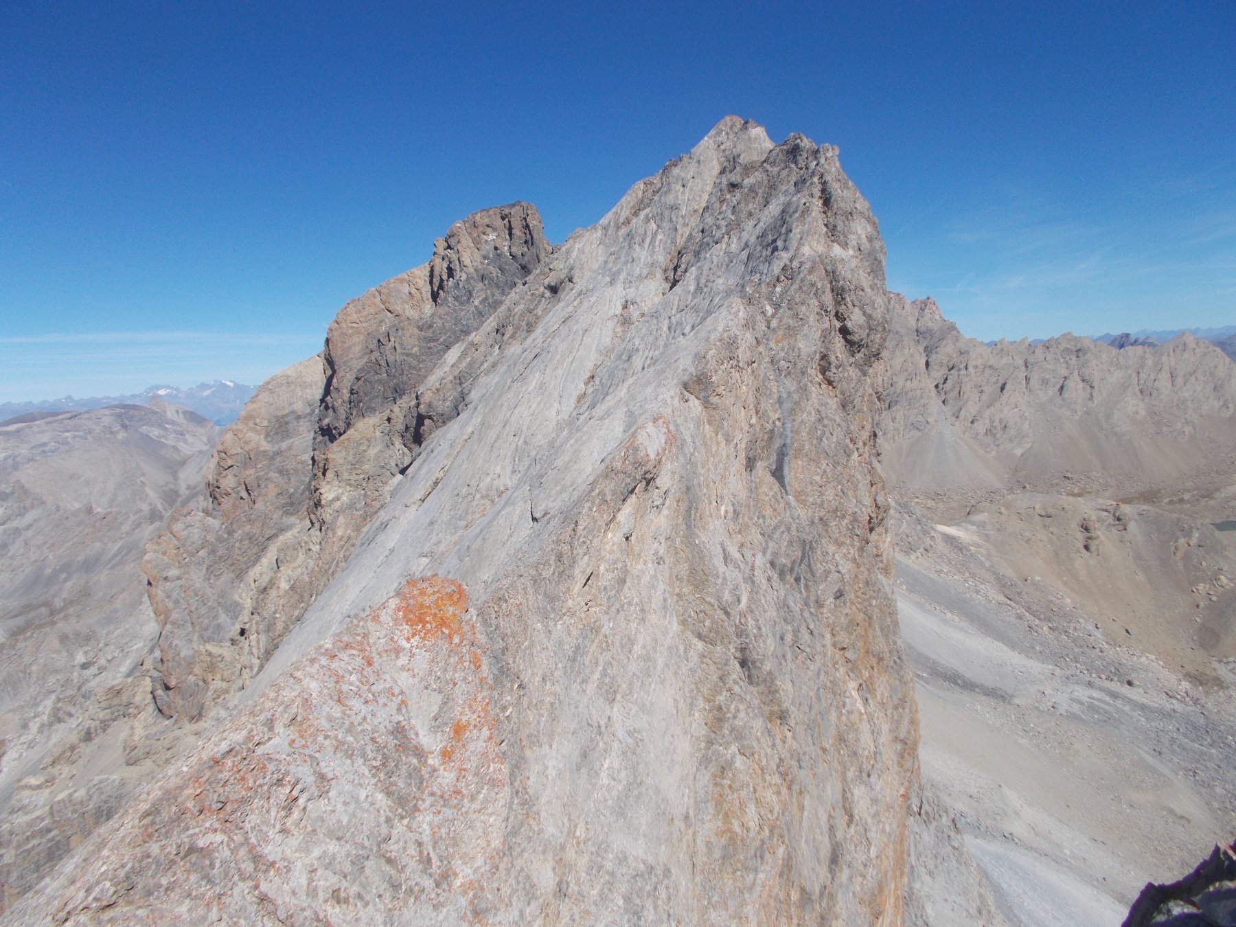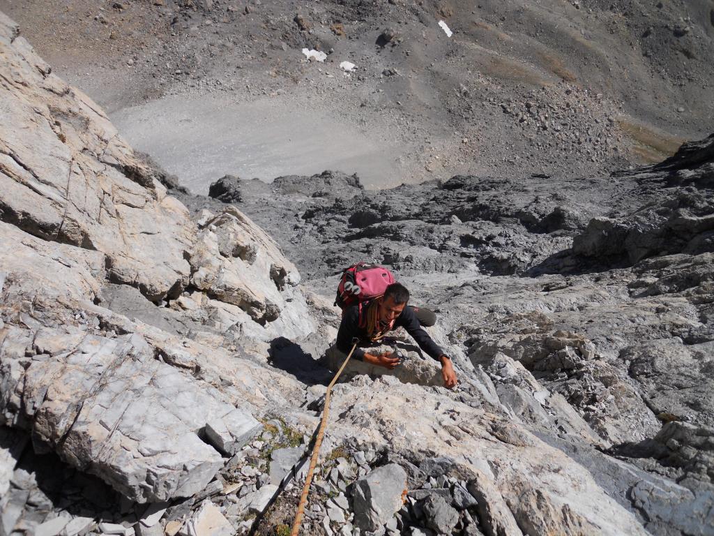 Si sale quindi per detriti e rocce mobili fino ad arrivare sulla Tete des Cibiroles 3236 m.Si scende per la cresta nord evitando i vari spuntoni sul lato francese.Si raggiunge un colletto (fettuccia) e si risale su un bel diedro che richiede un po’ di attenzione.A questo punto si prosegue sempre sul lato ovest fino a raggiungere uno spuntone (fettuccia in posto) da dove si scende in corda doppia.